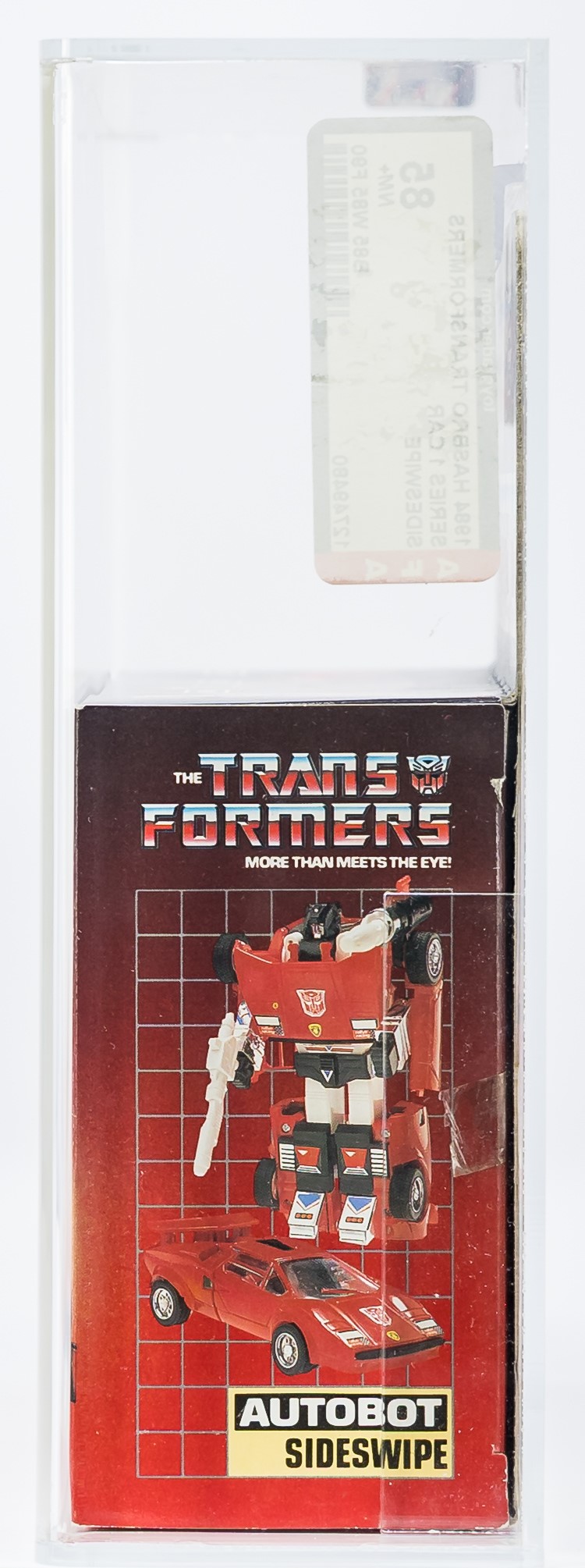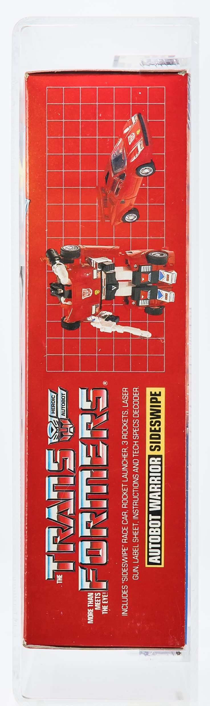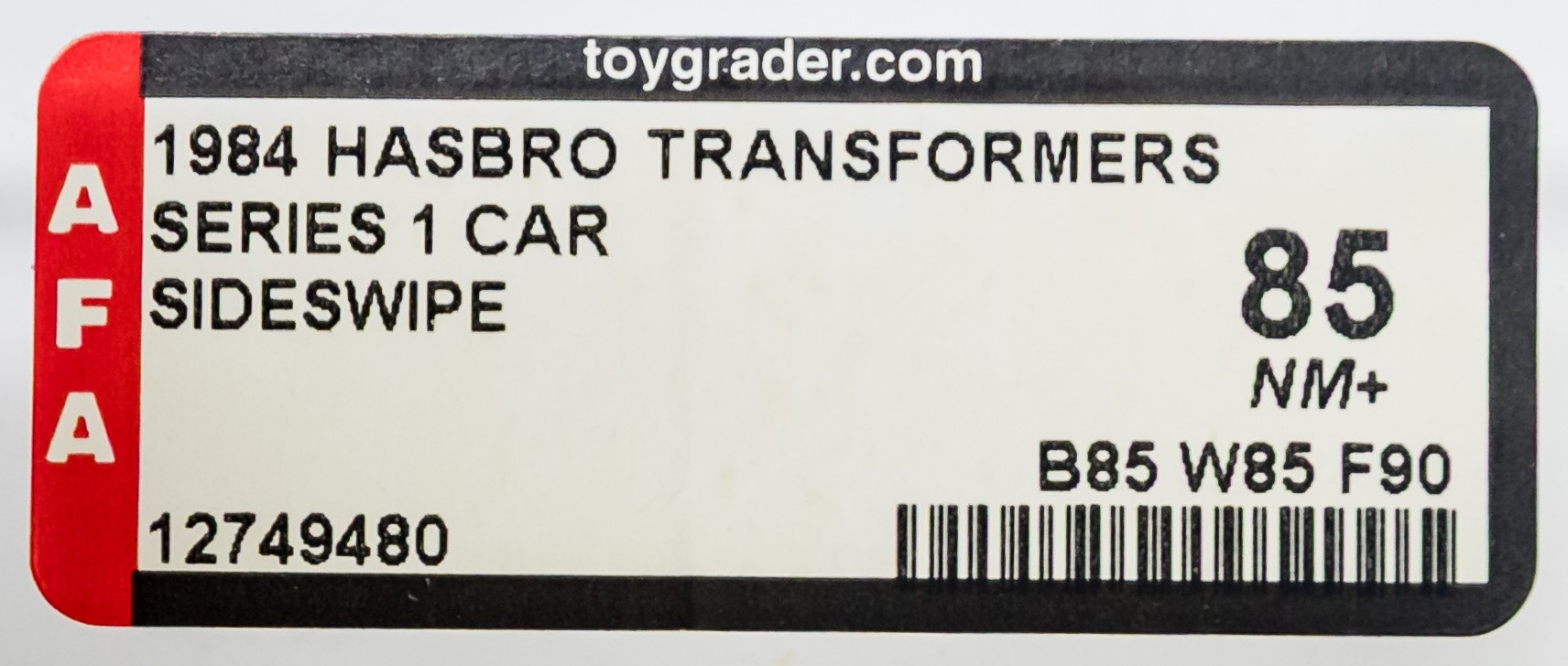 High-grade example of Sideswipe from Series 1 released in 1984. Beautiful box with few imperfections. No flap crease. Factory tape sealed on one side and tape is neatly cut on the other. No colorbreak along the front edge of the taped side, very light colorbreak along the side that is tape cut. Window is clear but displays various signs of surface wear from rubbing against the inner bubble. Inner bubble is clear and is firmly attached to the cardboard backing. Please note that upon careful examination two creases were identified on the inner backing. Both are out of sight when displayed on shelf. Red Sideswipe Lamborghini is in mint condition. Encapsulated by AFA (85, 85-85-90), #12749480