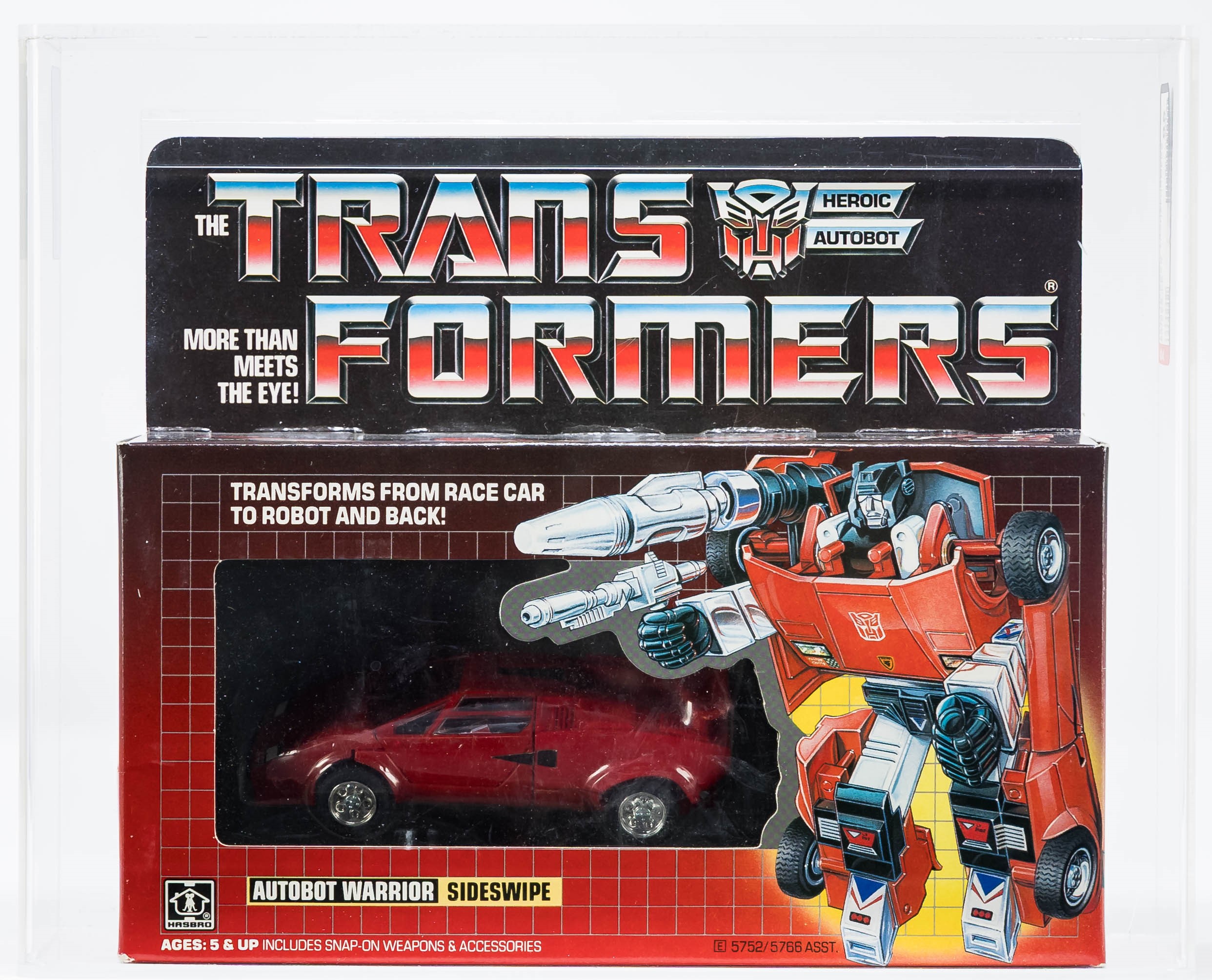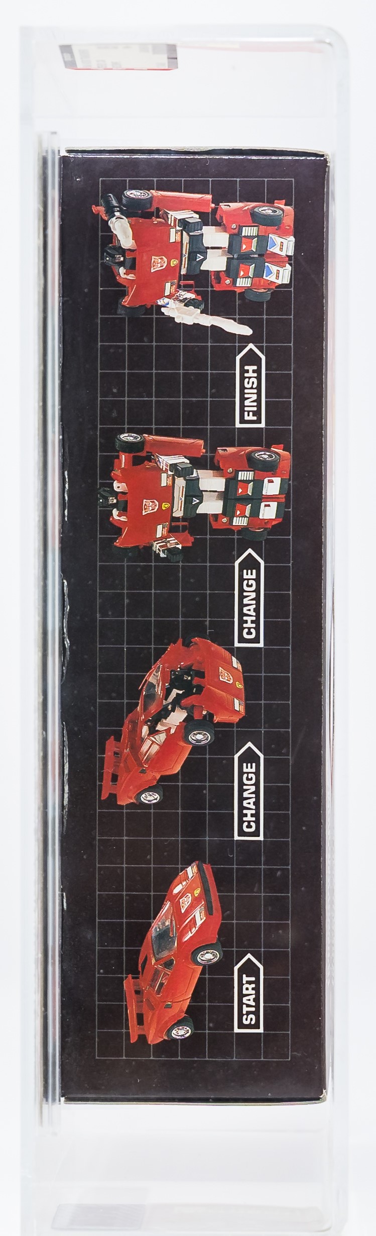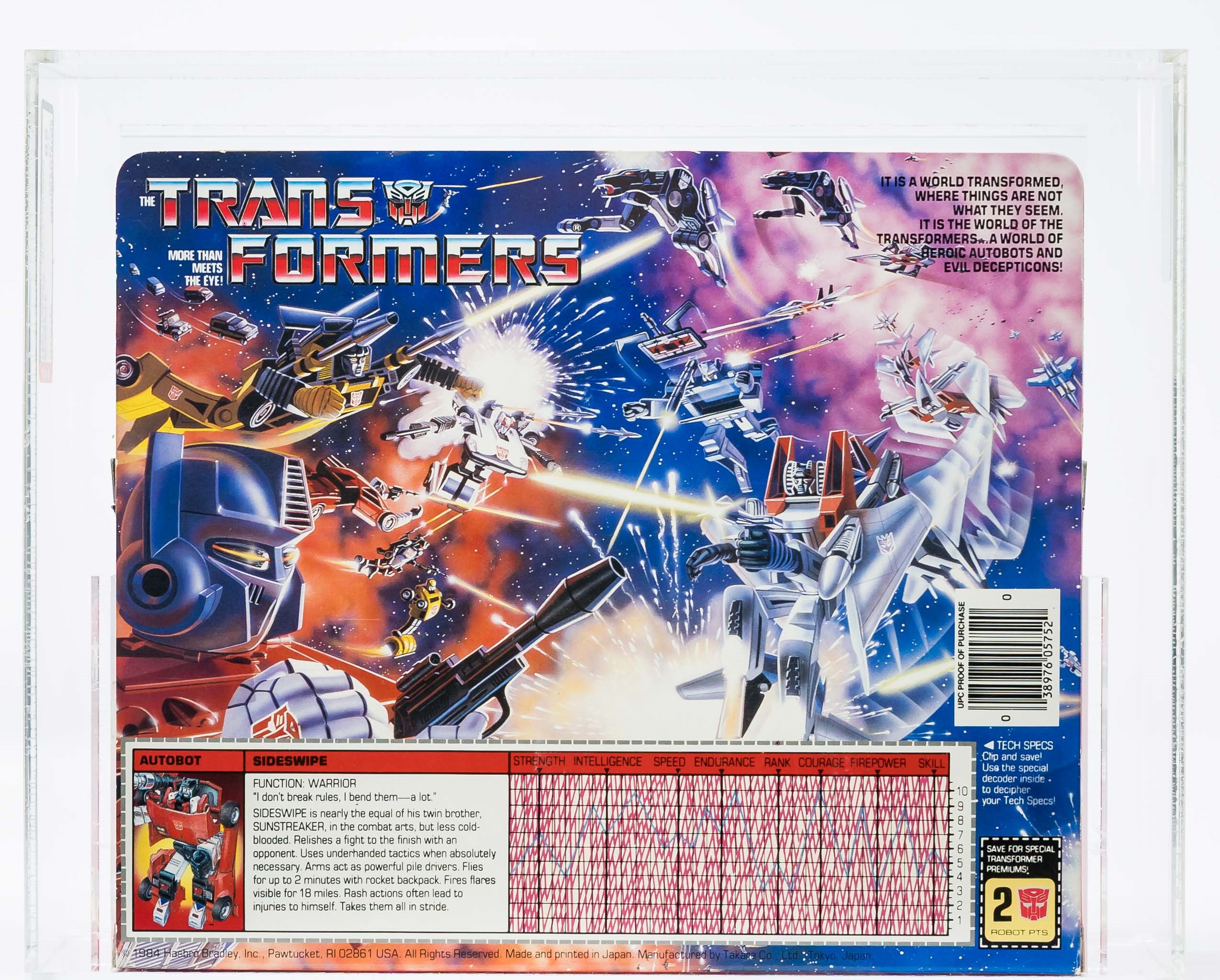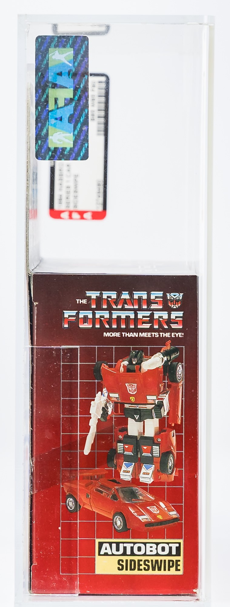 High-grade example of Sideswipe from Series 1 released in 1984. Beautiful box with few imperfections. No flap crease. Factory tape sealed on one side and tape is neatly cut on the other. No colorbreak along the front edge of the taped side, very light colorbreak along the side that is tape cut. Window is clear but displays various signs of surface wear from rubbing against the inner bubble. Inner bubble is clear and is firmly attached to the cardboard backing. Please note that upon careful examination two creases were identified on the inner backing. Both are out of sight when displayed on shelf. Red Sideswipe Lamborghini is in mint condition. Encapsulated by AFA (85, 85-85-90), #12749480