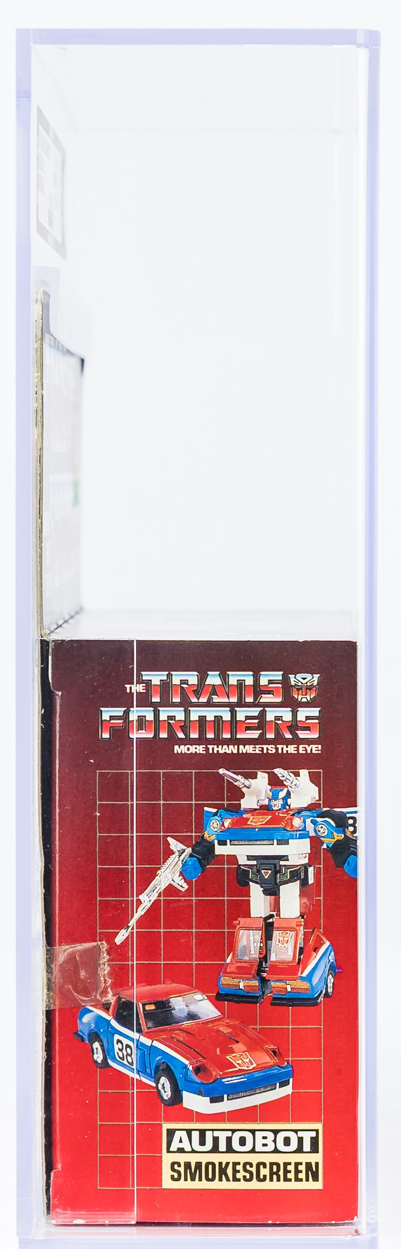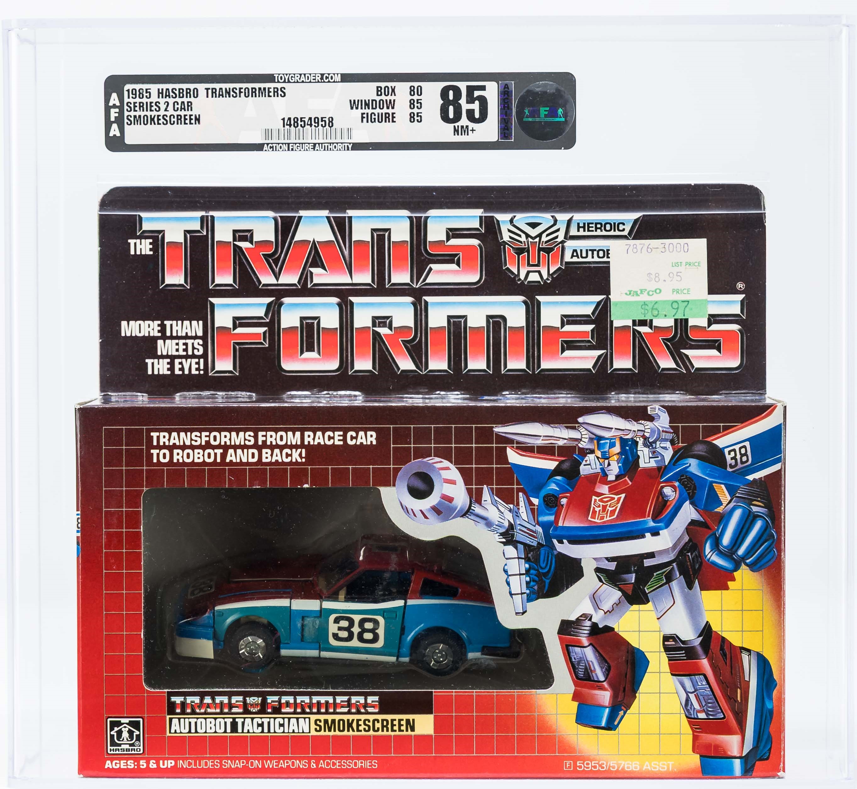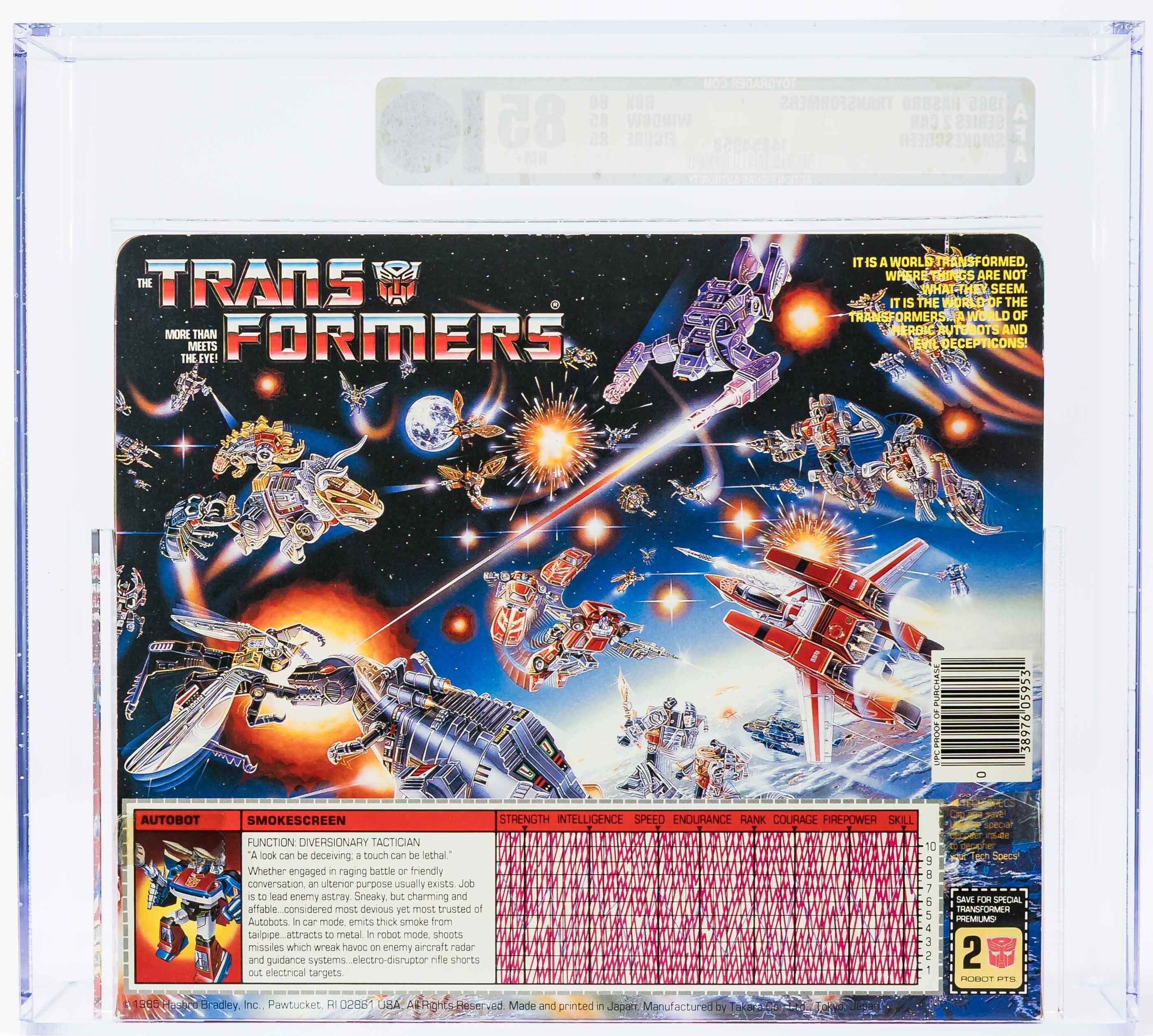 High-grade example of popular Smokescreen from Series 2 released in 1985. Well-presenting box. See photos for blemishes. No flap crease on the reverse. Price tag in the upper corner. Tape is present on one end and broken on the other. Front edge with the broken tape exhibits colorbreak. Display window is clear with some surface wear present. Bubble that holds Smokescreen in place is clear and firmly attached to the cardboard backing. Encapsulated by AFA (85, 80-85-85), #14854958