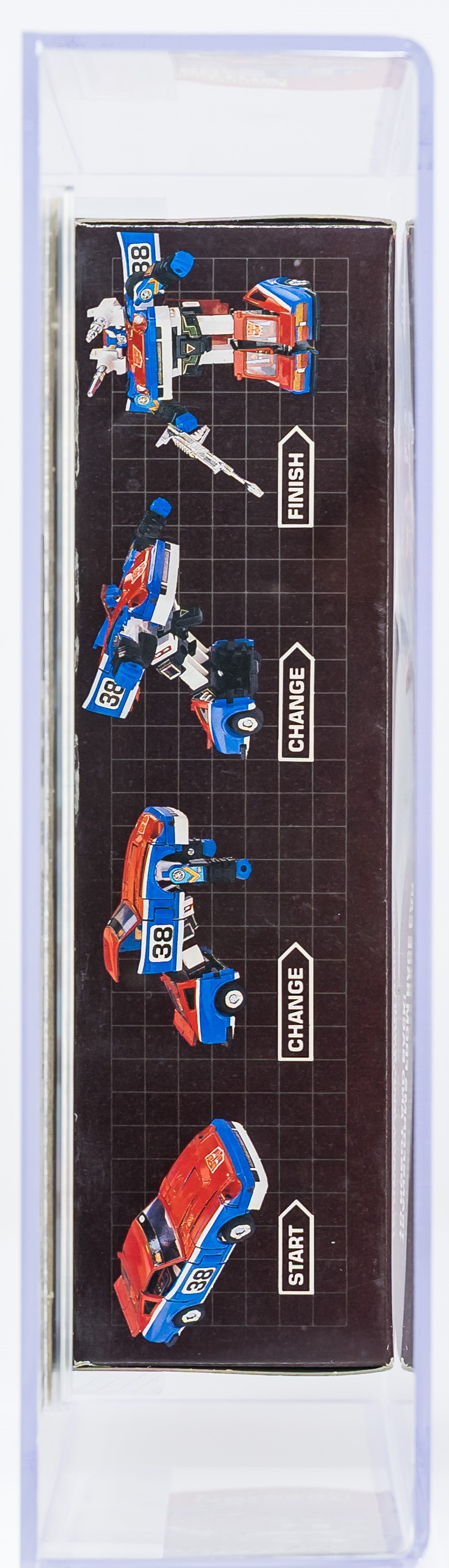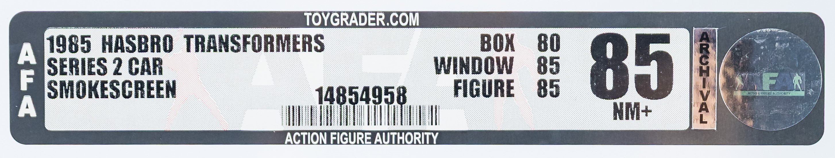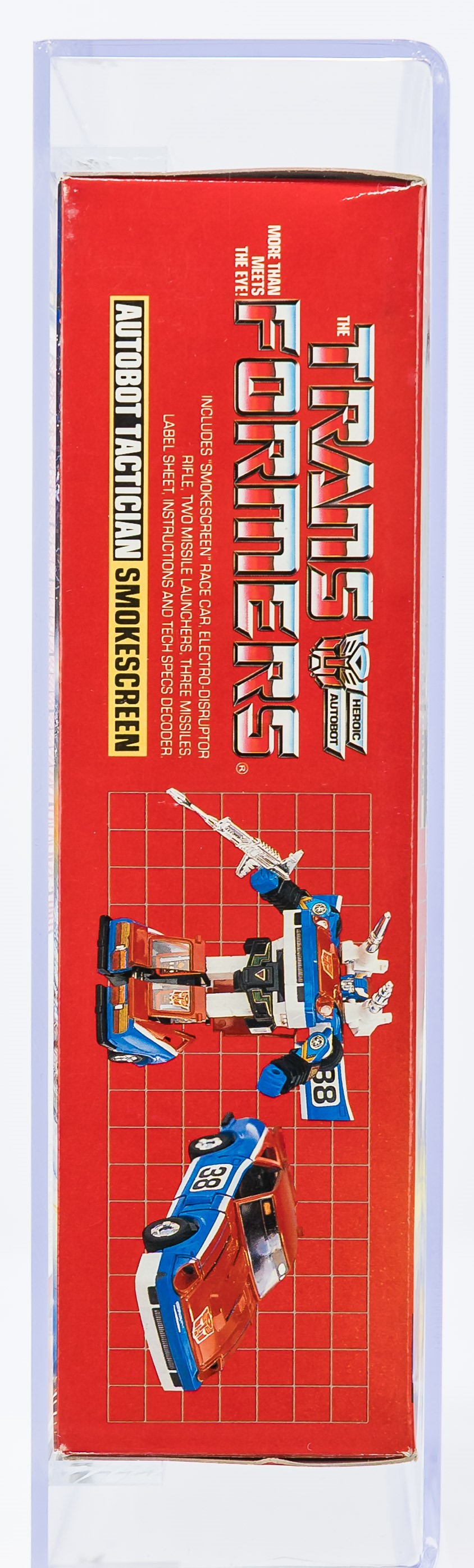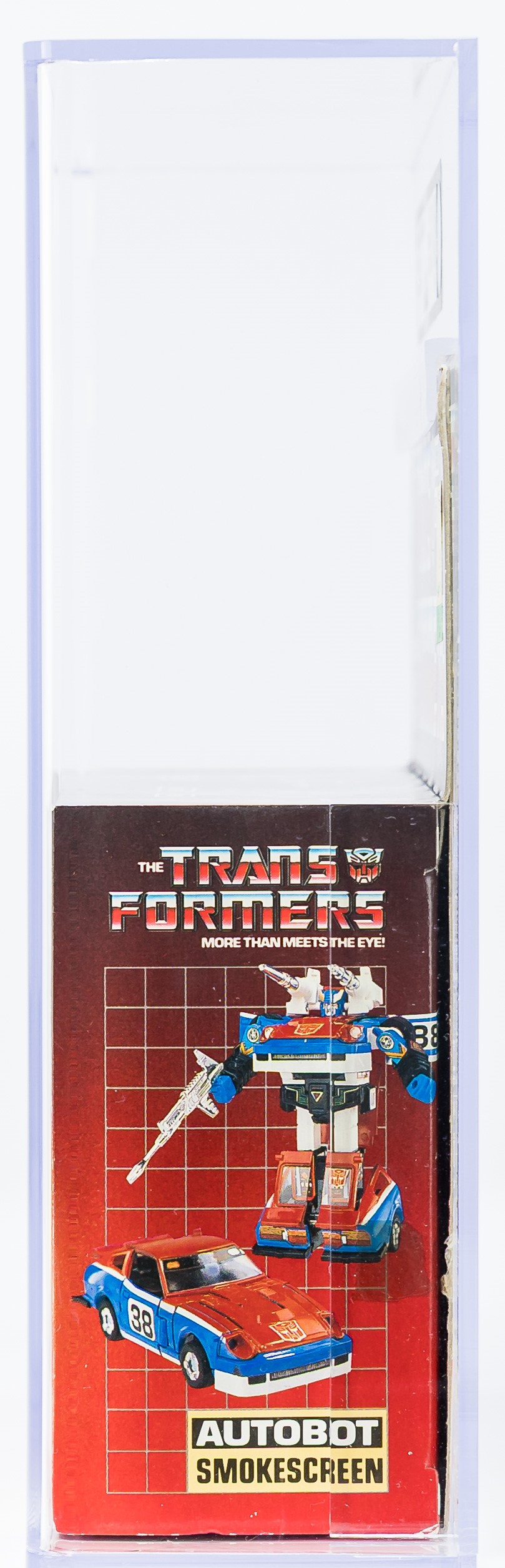 High-grade example of popular Smokescreen from Series 2 released in 1985. Well-presenting box. See photos for blemishes. No flap crease on the reverse. Price tag in the upper corner. Tape is present on one end and broken on the other. Front edge with the broken tape exhibits colorbreak. Display window is clear with some surface wear present. Bubble that holds Smokescreen in place is clear and firmly attached to the cardboard backing. Encapsulated by AFA (85, 80-85-85), #14854958