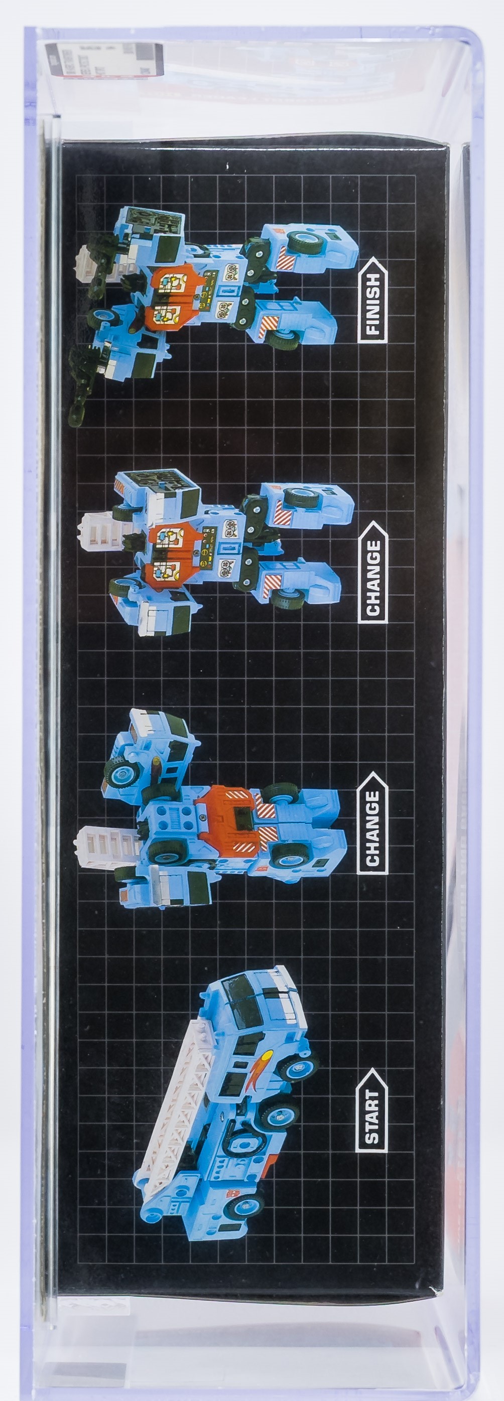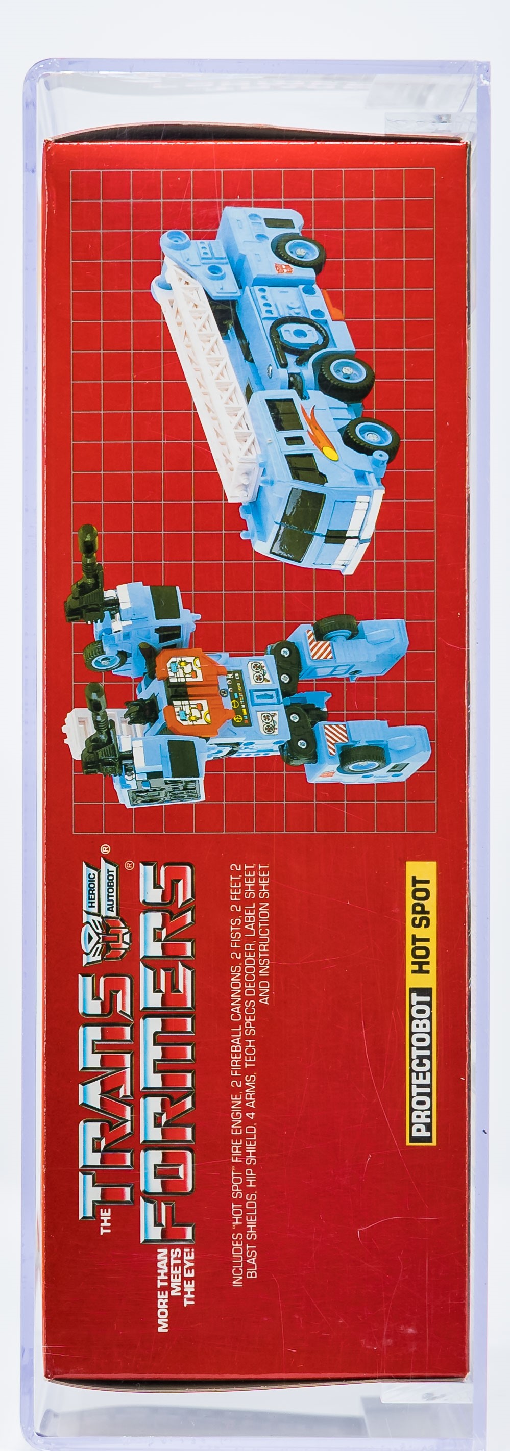 Ultra high-grade Hot Spot (P5) from the Series 3 Protectobot line in 1986. One of five Protectobots, Hot Spot is the Protectobot Leader and the only one available as a boxed transformer. Stunning condition throughout with few blemishes. No price tag sticker or sticker residue/imprint. Beautiful color and gloss. No flap crease on the reverse. Our MISB example comes firmly factory tape sealed on each side and there is no colorbreak along either of the front edges. The display window is crystal clear as is the bubble that holds Hot Spot in place. Hot Spot himself is a stunner receiving a well-deserved “90” subgrade. Absolutely gorgeous example, the best to hit the market in many years.