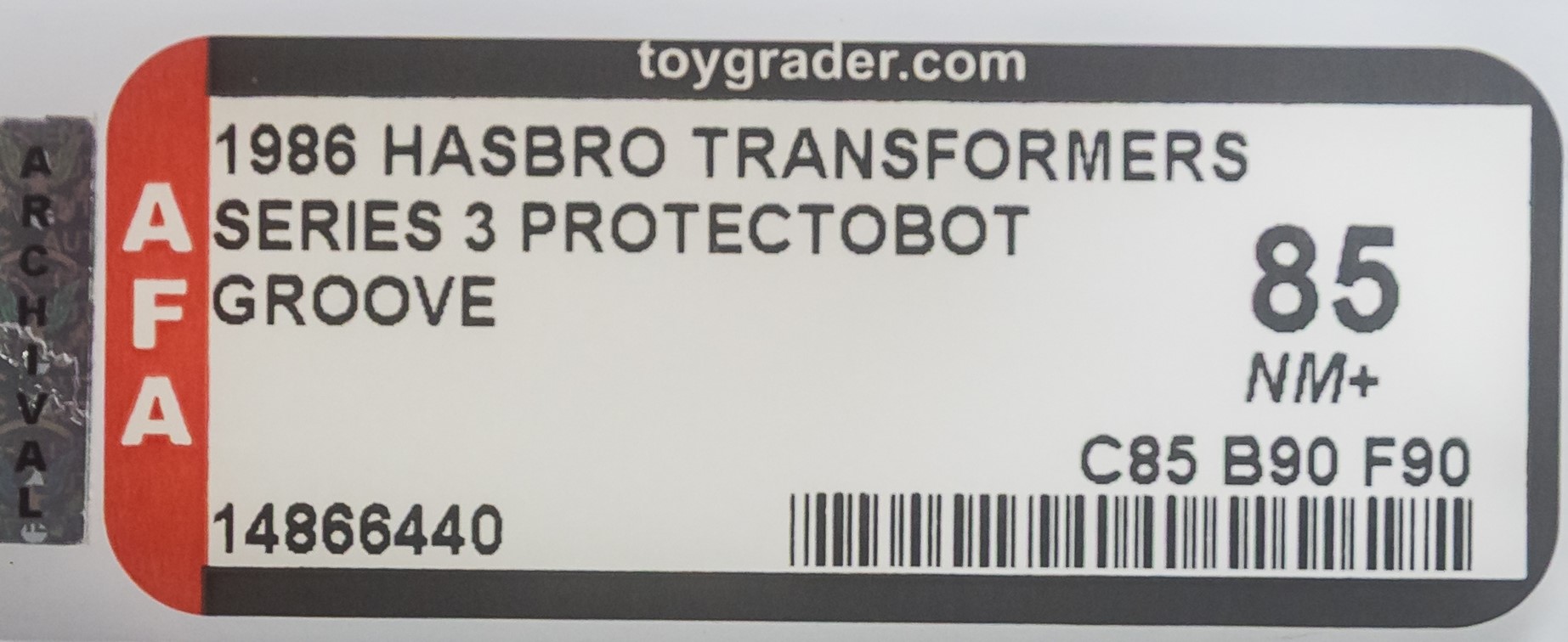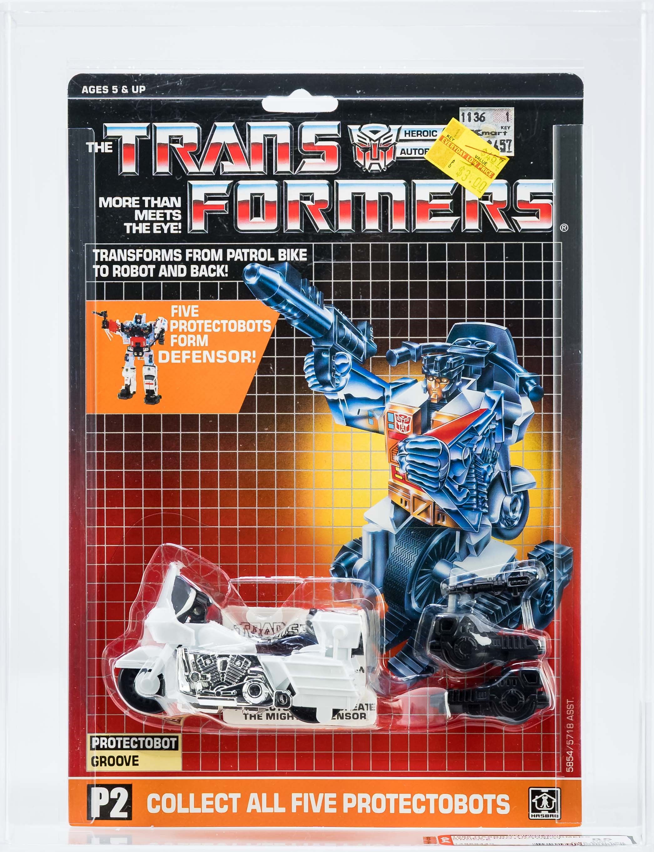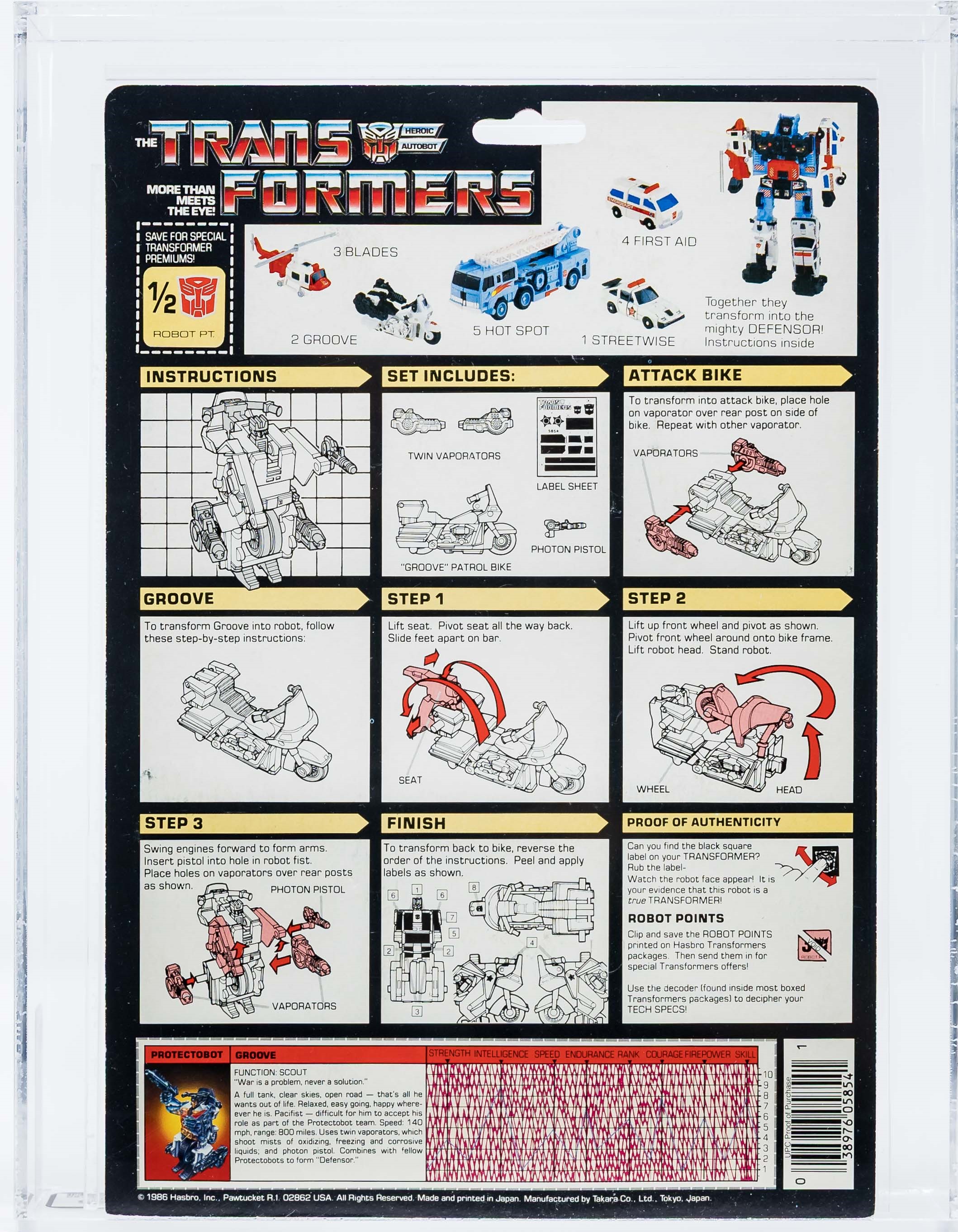 Ultra high-grade Groove (P2) from the Series 3 Protectobot line in 1986. One of five Protectobots. Exceptional card with few blemishes. No edge wear, no creases, no fading. A virtually indiscernible vein located in the upper corner is the only notable blemish. Bubble is crystal clear and firmly attached to the card. No cracks or dents. Groove vehicle displays outstanding original color with no yellowing. Superb example with impressive subgrades of 85-90-90.
