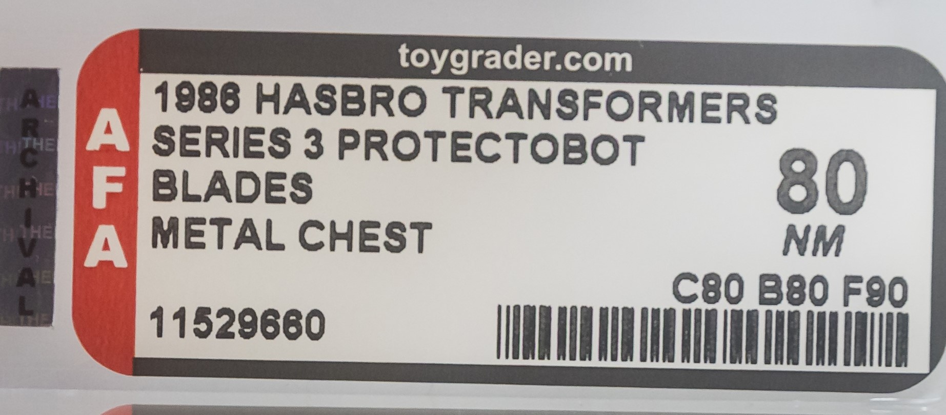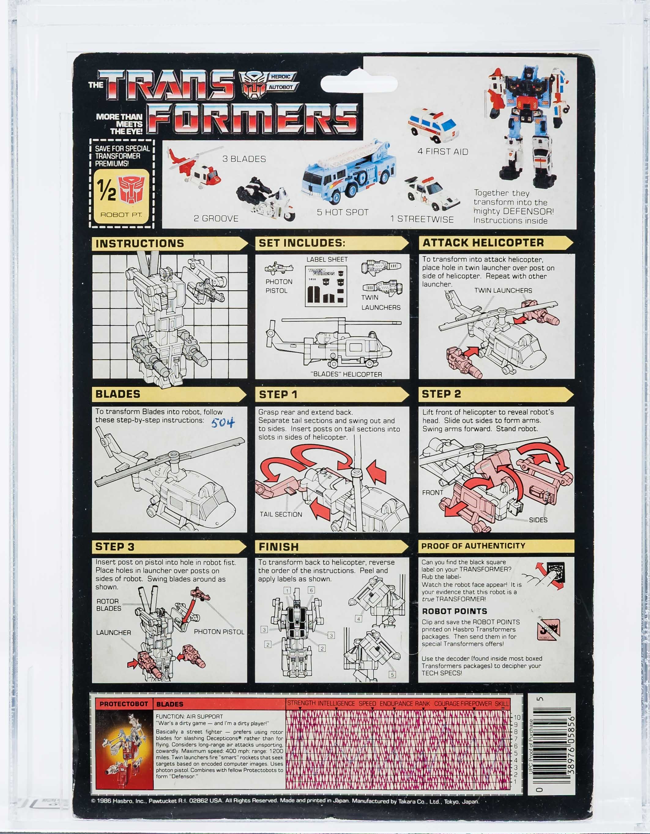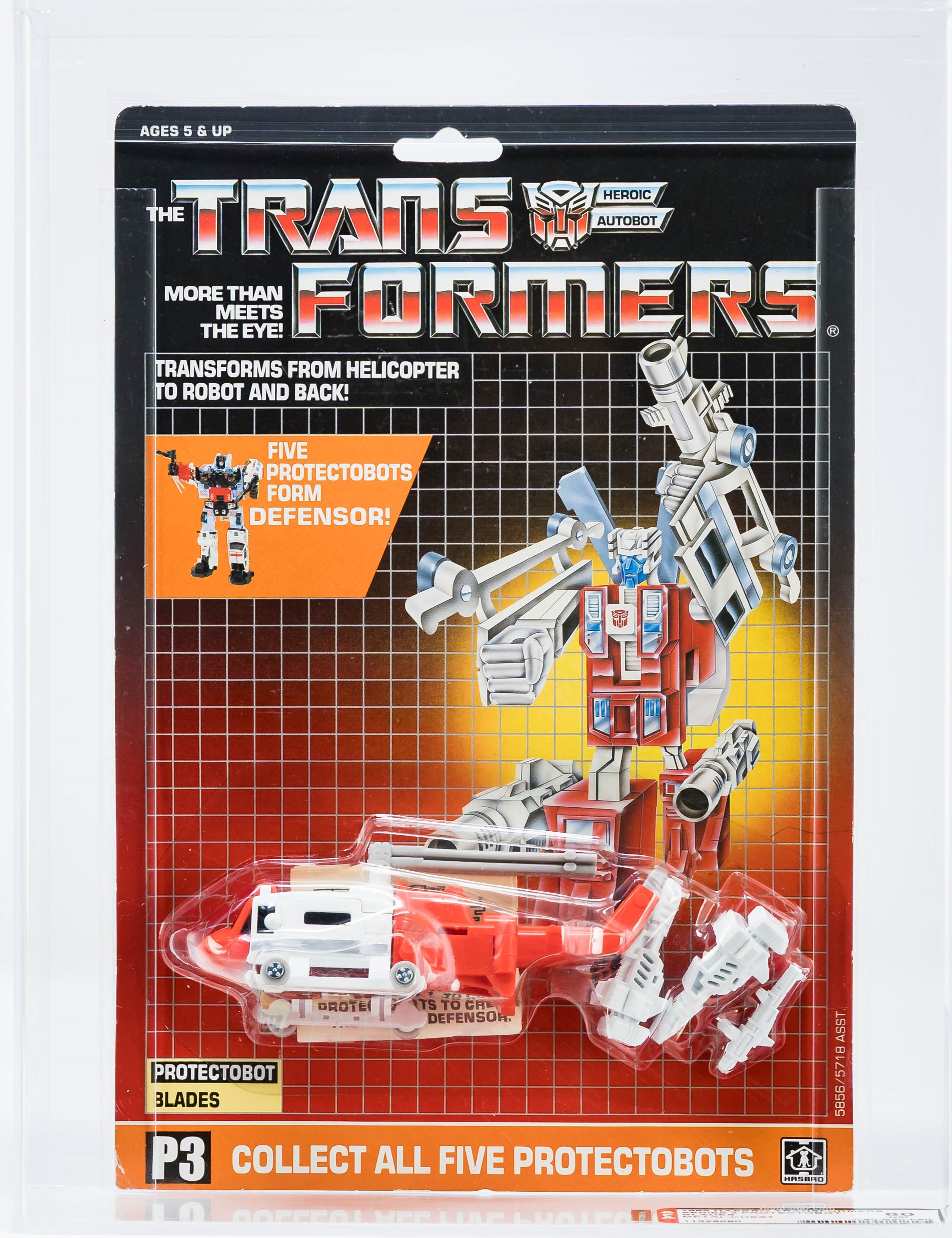 Rare “metal chest” Blades (P3) from the Series 3 Protectobot line in 1986. One of five Protectobots. Well presenting card with only minor blemishes. Imperfections include a horizontal pen marking on the right edge just below midpoint and light wrinkling above the TECT in PROTECTOBOTS near the bottom. No edge wear, no creases, no fading. No price tag sticker or residue/imprint. Bubble is crystal clear and firmly attached to the card. The “80” bubble subgrade results from a very minor stress marking found under the rear wheel. Blades vehicle sports a rare metal chest and displays outstanding original color with no yellowing. This is the first metal chest variant we have offered in our auctions.