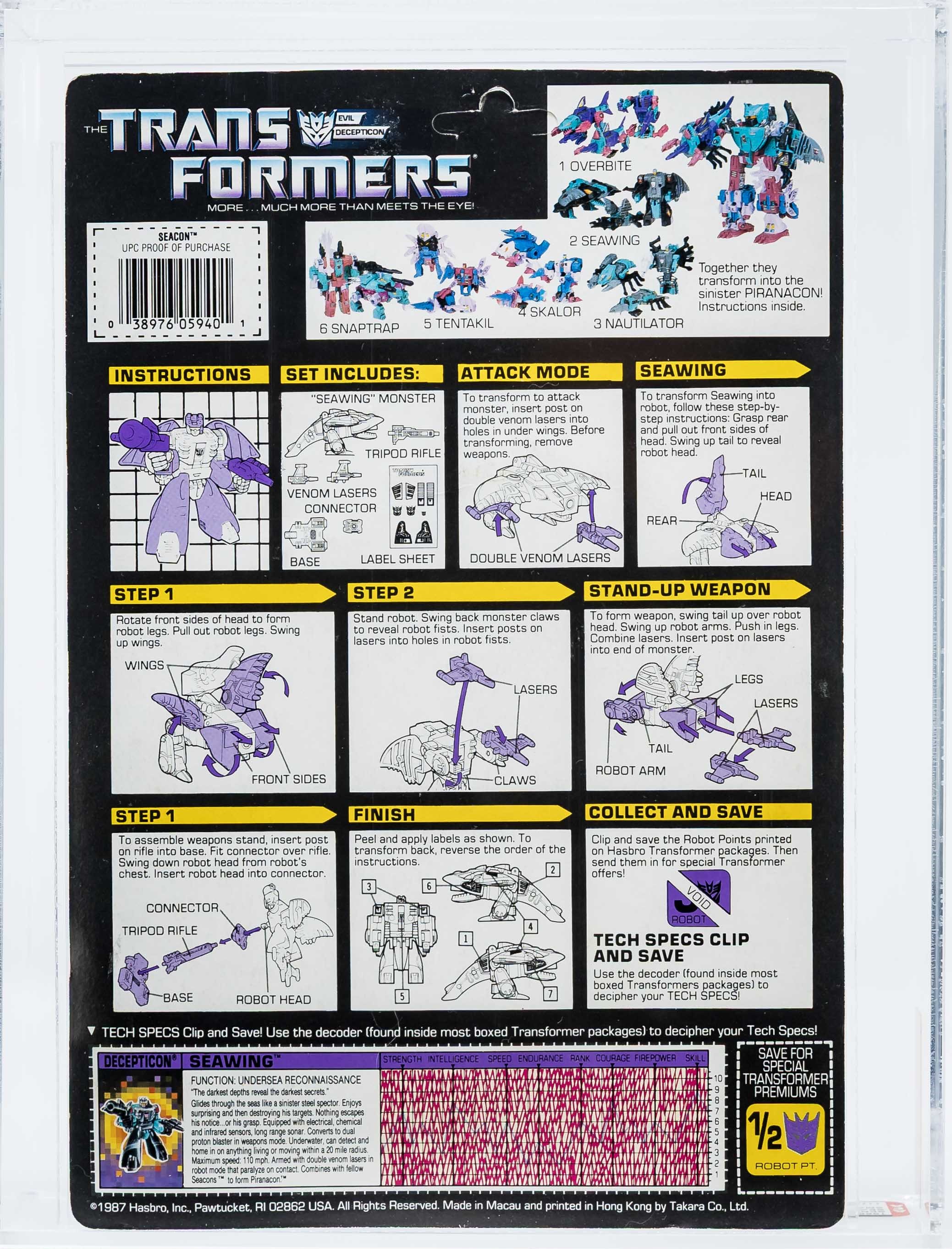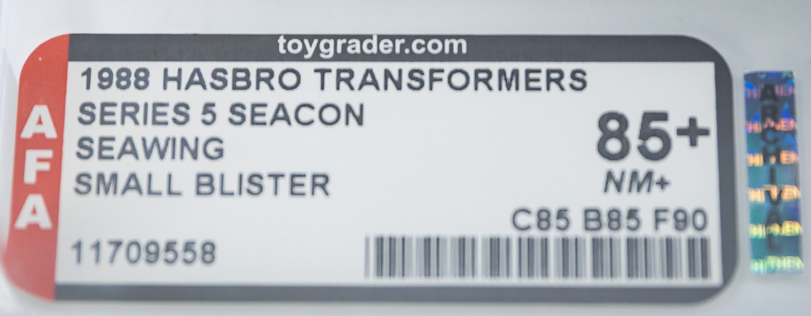 Ultra high-grade Seawing (SE2) from the Series 5 Seacon line in 1988. One of six Seacon Decepticons. Exceptional condition with only minor imperfections. Card is unpunched. No price tag sticker or sticker residue/imprint. Beautiful color and gloss. Clear bubble is firmly attached to the card. Seawing figure displays like a champ earning a well-deserved “90” subgrade. This is the highest graded example.