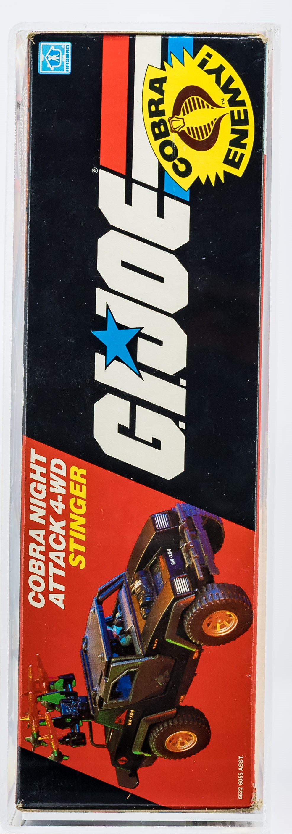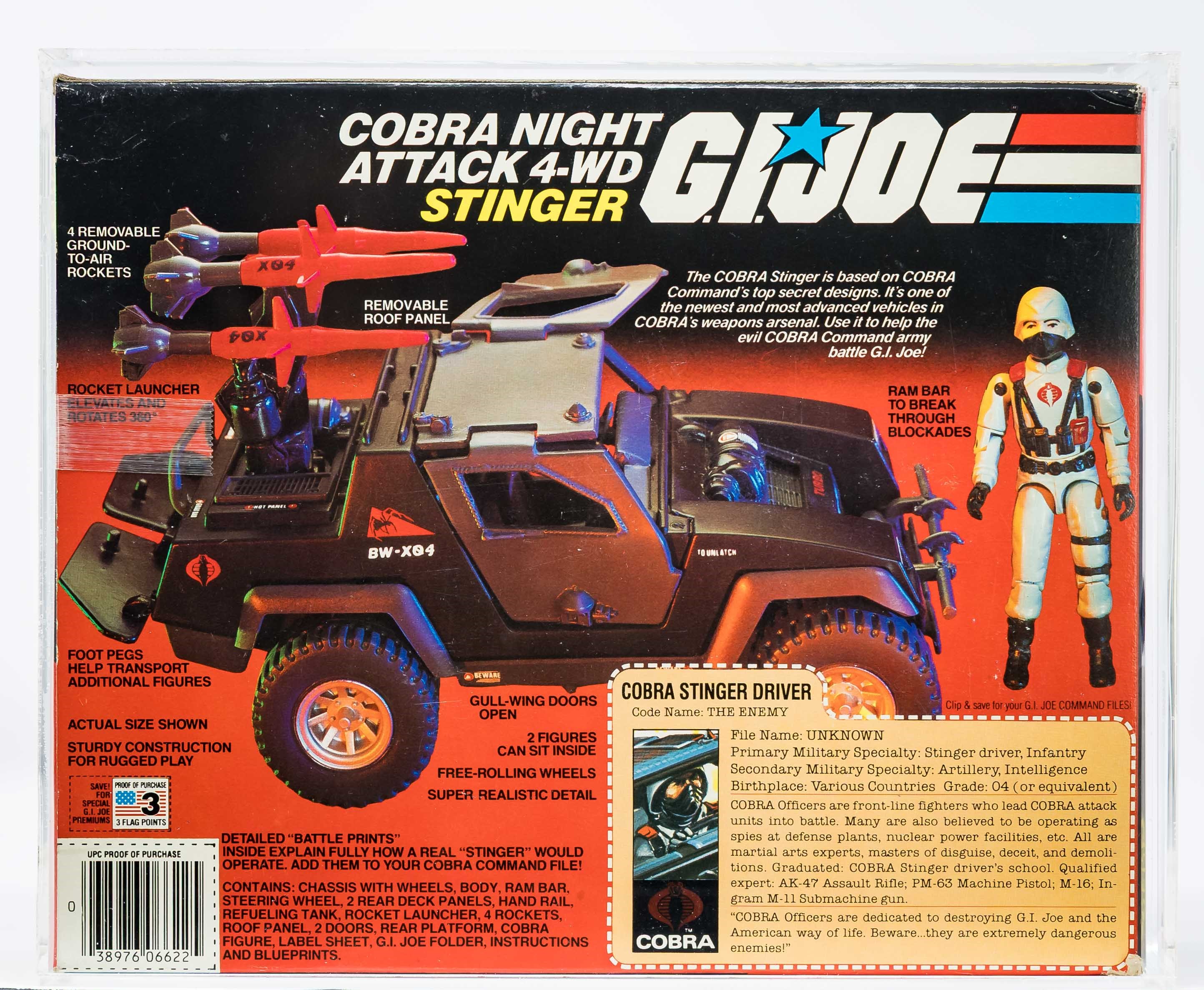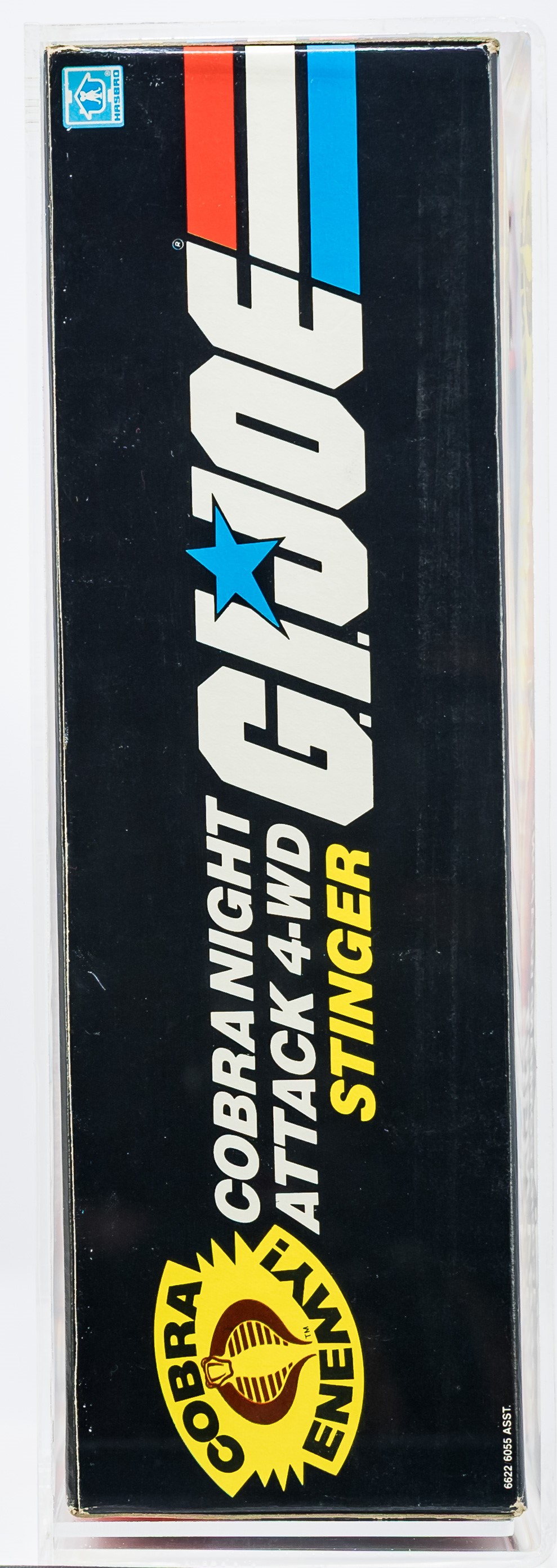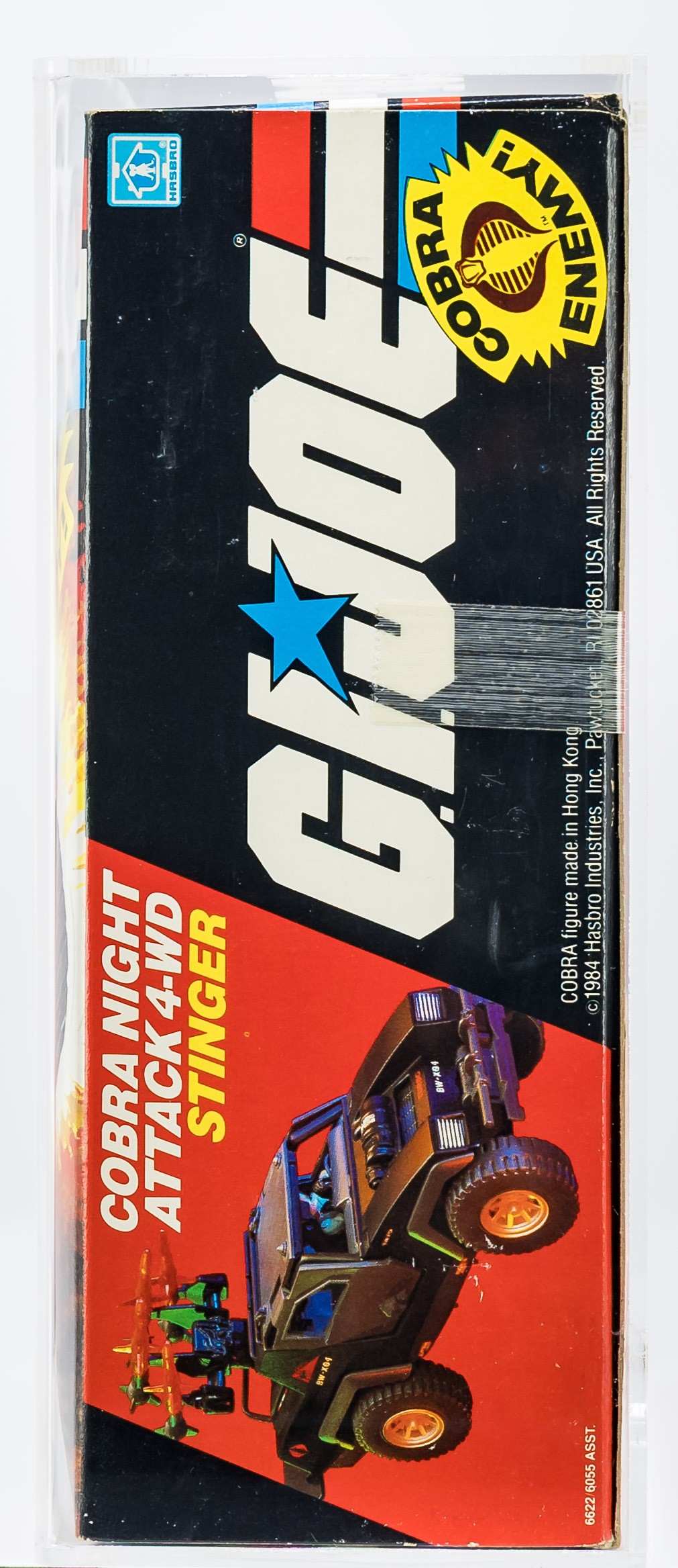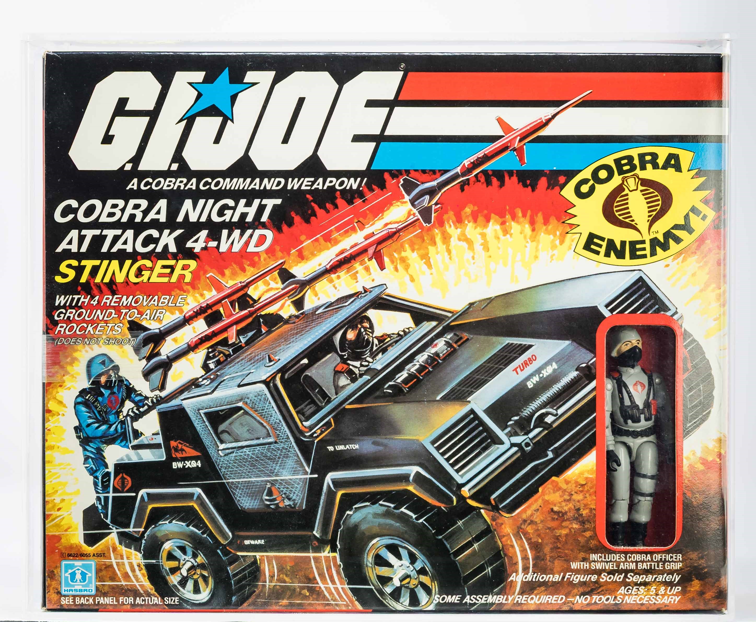 Exceptional example of the Cobra Stinger released as part of Series 3 in 1984. Box condition is extremely impressive. Color is outstanding. No price tag sticker. Few imperfections – found only on back panel and out-of-sight. Wide tape seals each end. No colorbreak along the edges. Display window is clear. Cobra Officer exhibited no movement in the legs or waist when tested. Showstopper of a piece!