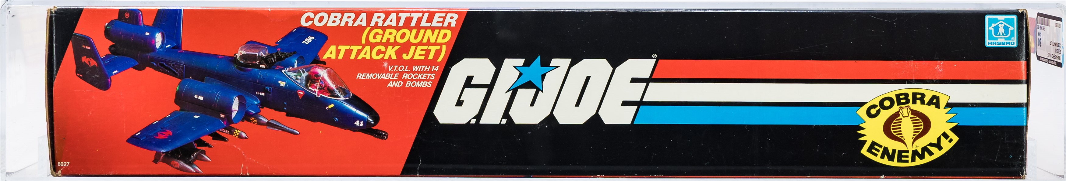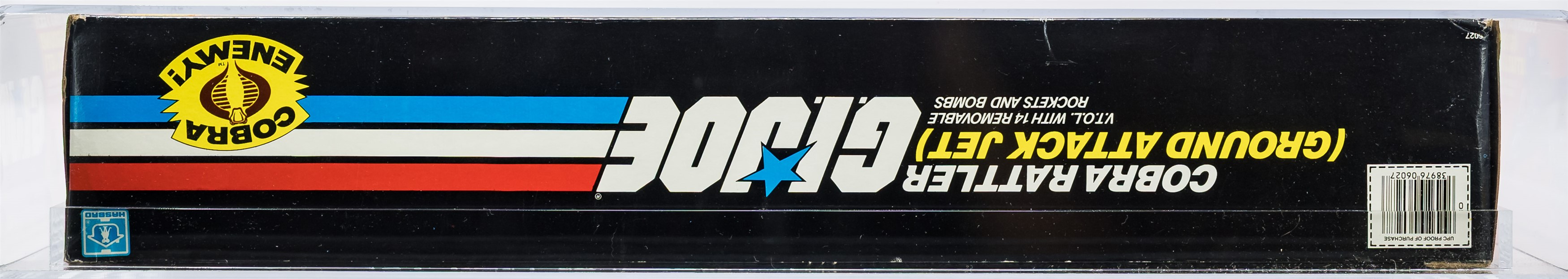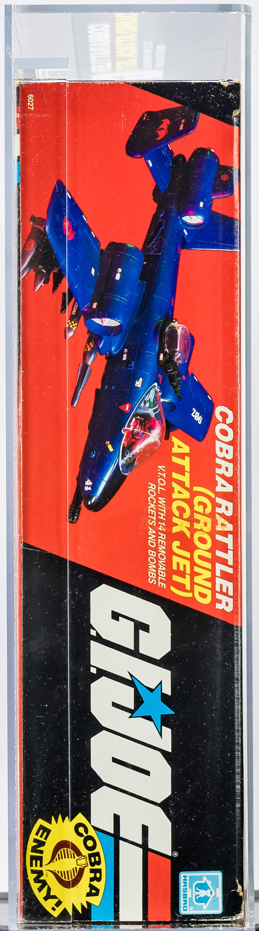 One of the best releases in the ARAH line is the Series 3 Rattler released in 1984. Our example sports a very nice box with outstanding color. AFA has verified the box contents are complete and unused/new. Display window is clear. Wild Weasel appears to have a broken o-ring as his legs have collapsed. Overall, an awesome piece – we have not offered a Rattler in several years.