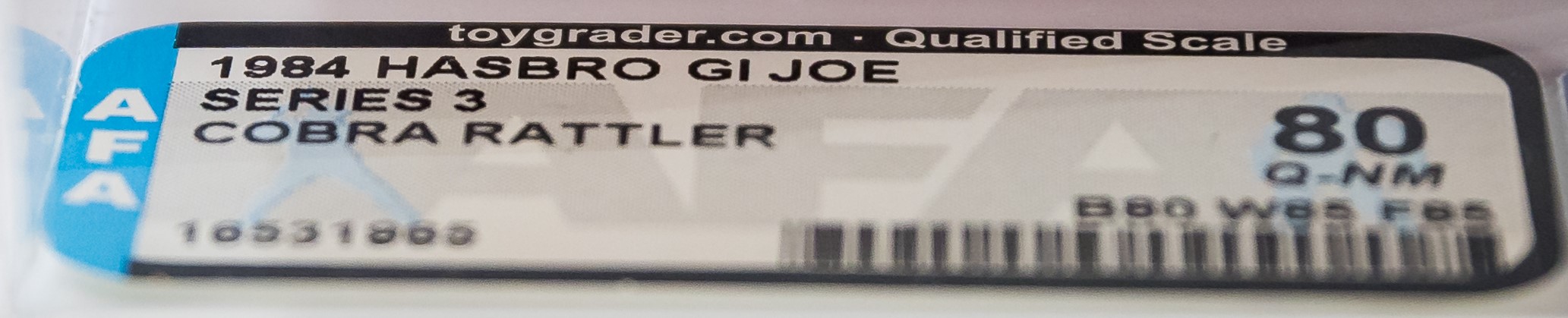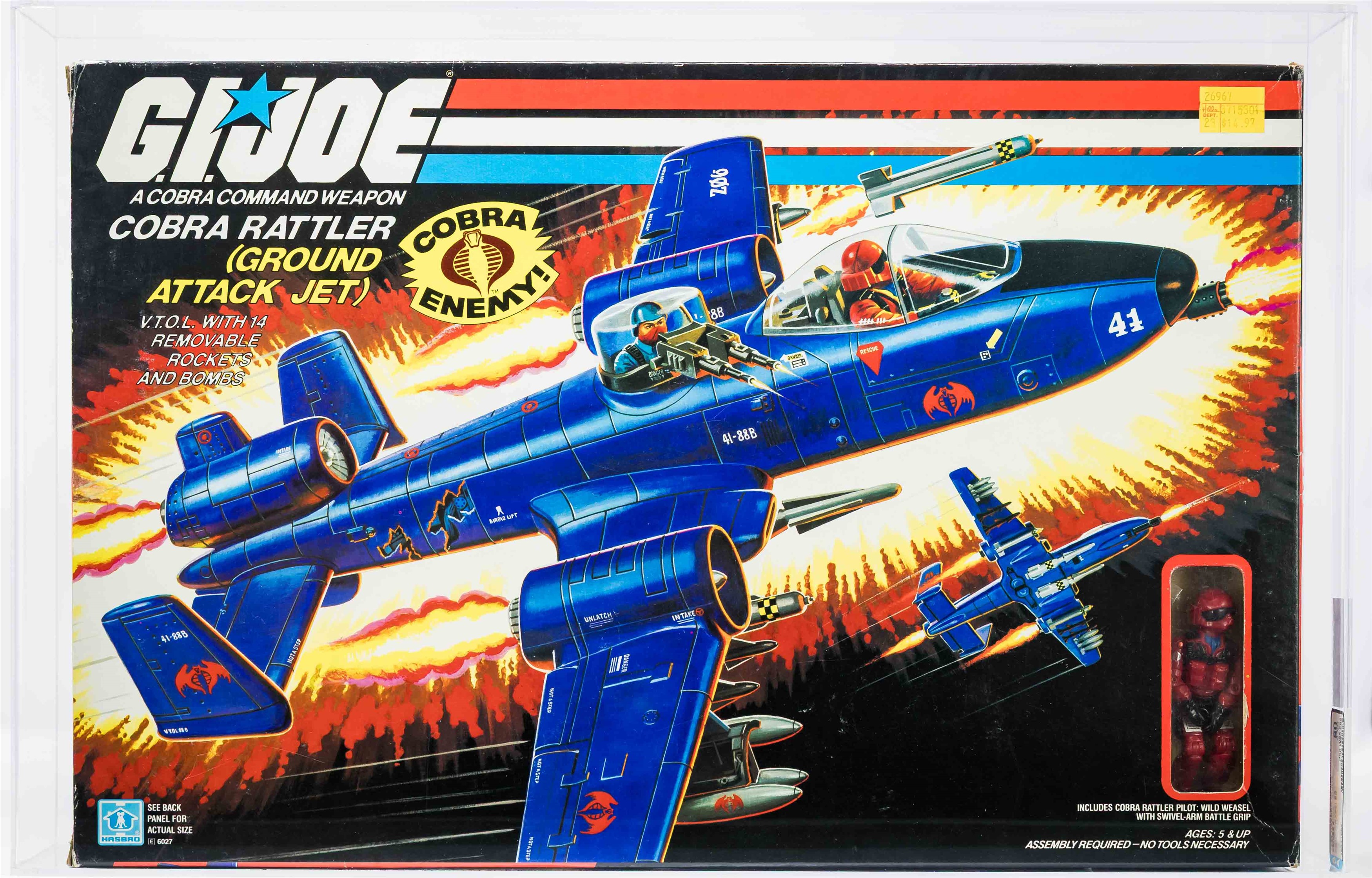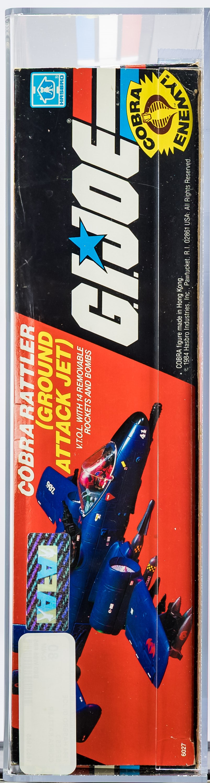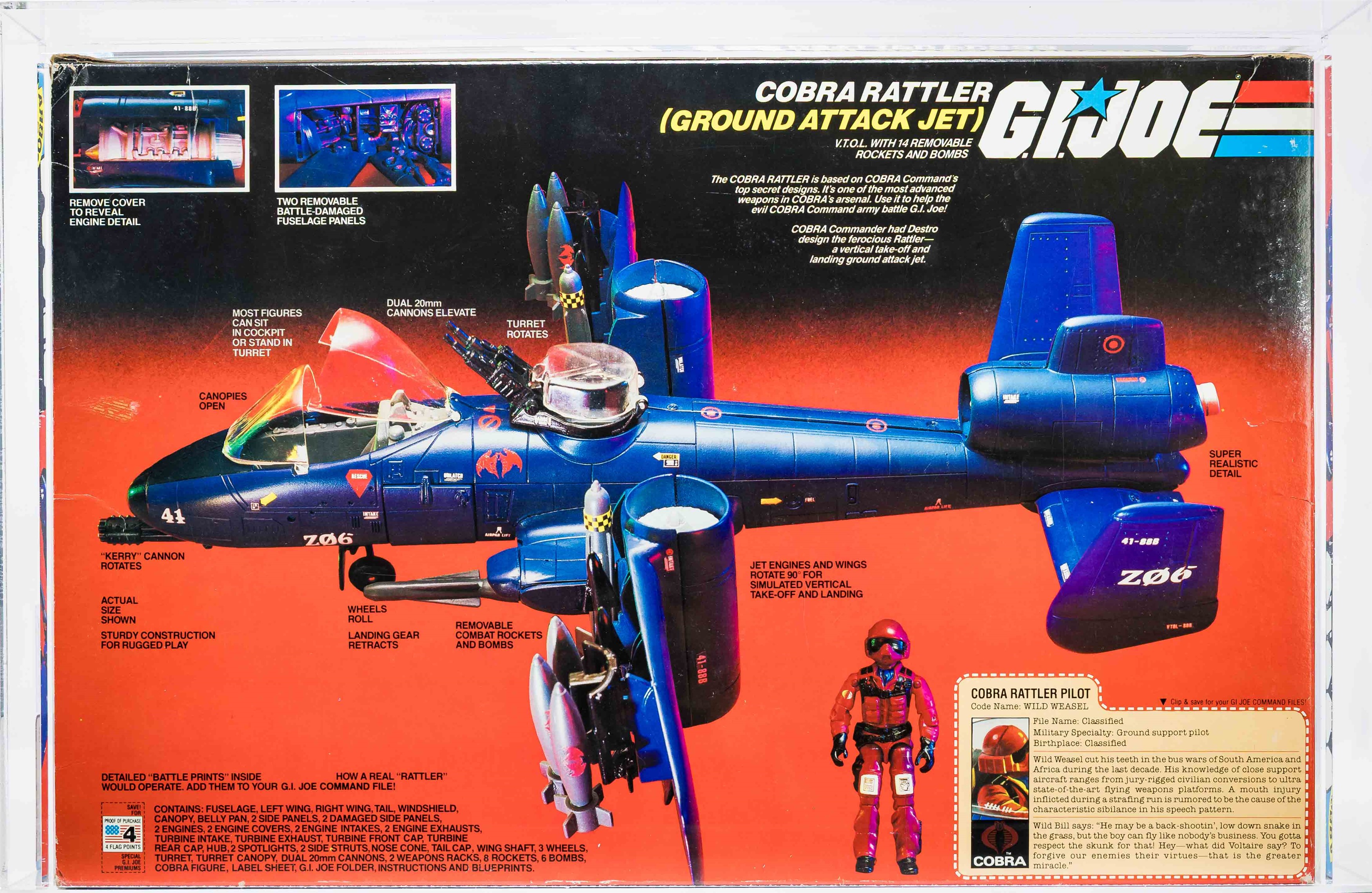 One of the best releases in the ARAH line is the Series 3 Rattler released in 1984. Our example sports a very nice box with outstanding color. AFA has verified the box contents are complete and unused/new. Display window is clear. Wild Weasel appears to have a broken o-ring as his legs have collapsed. Overall, an awesome piece – we have not offered a Rattler in several years.