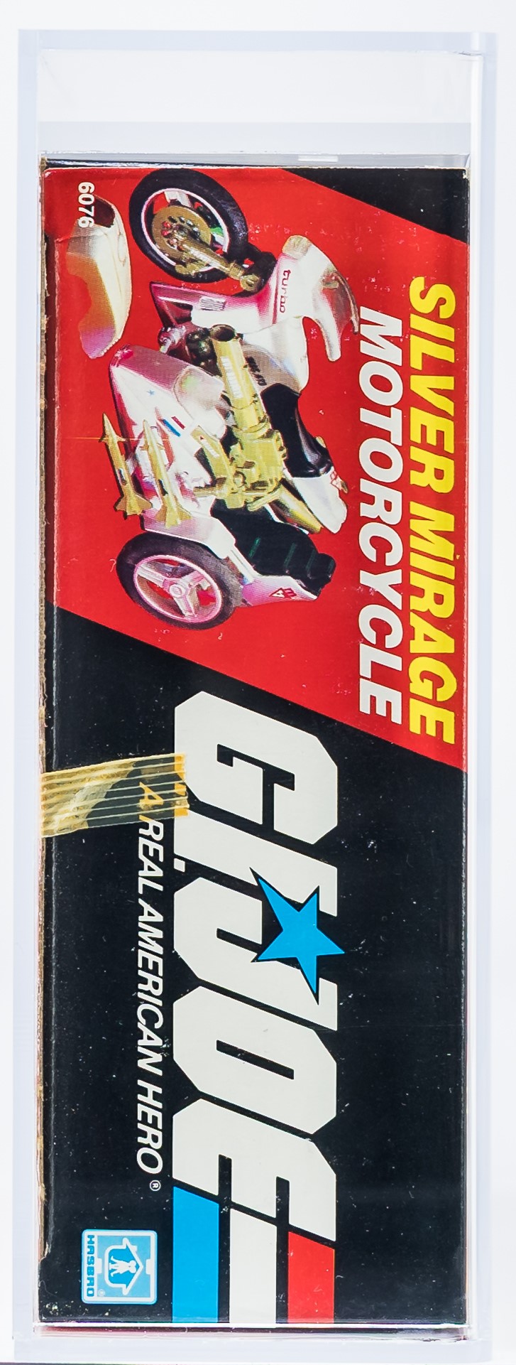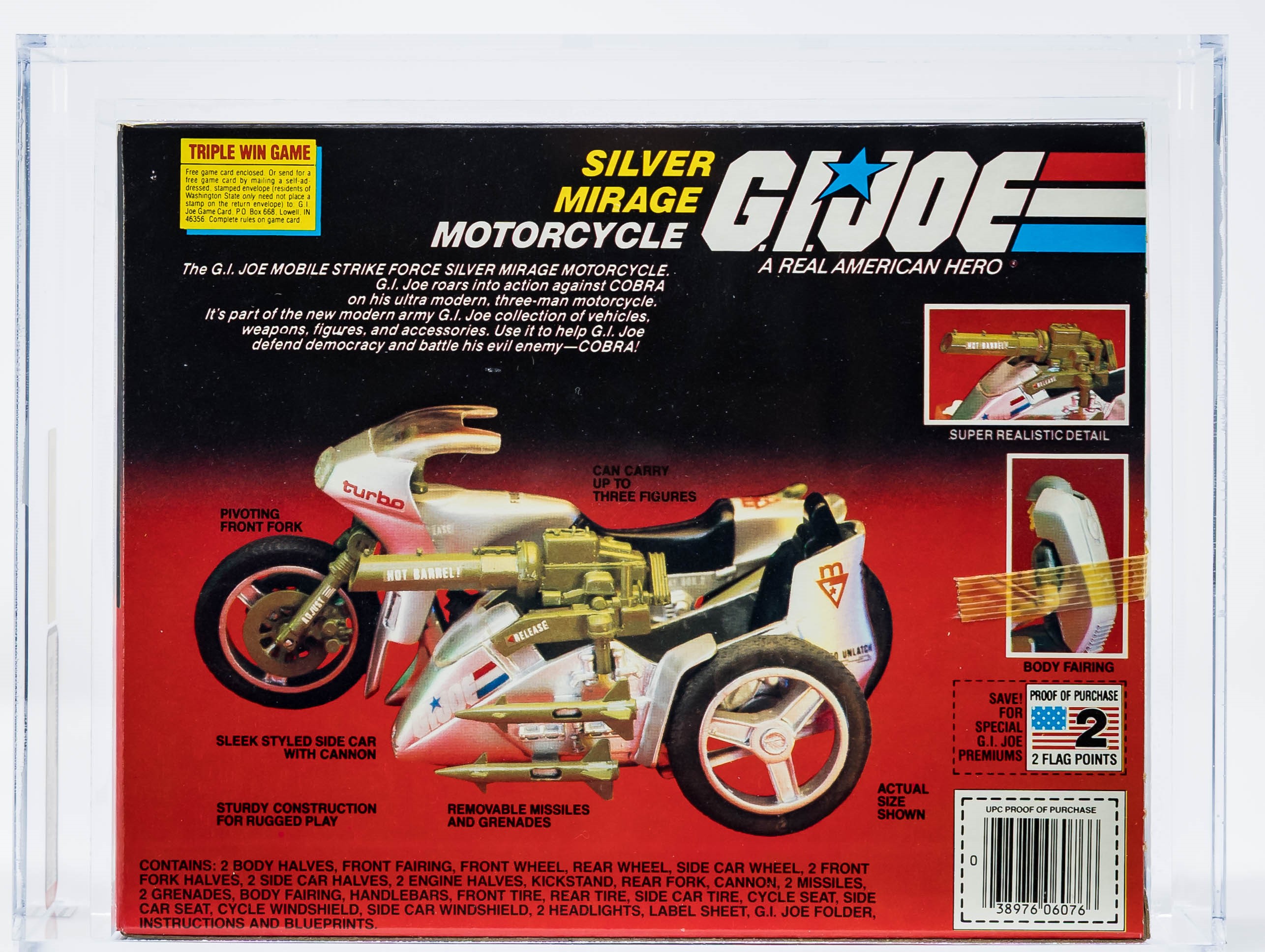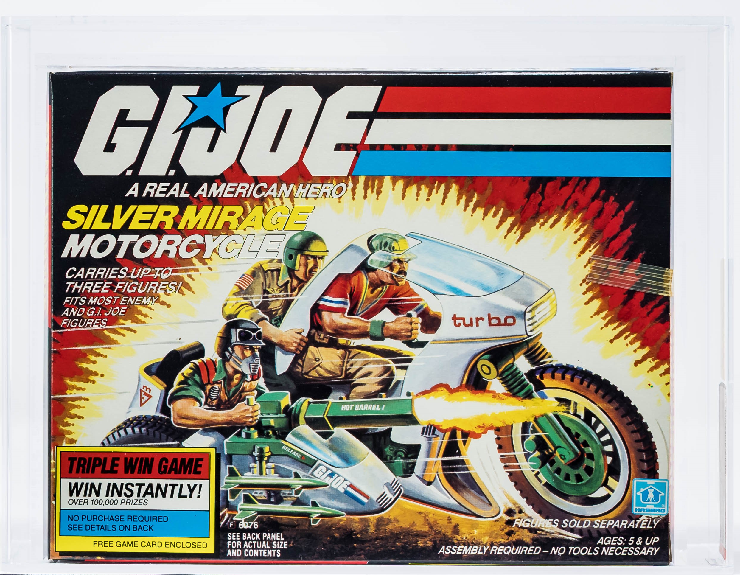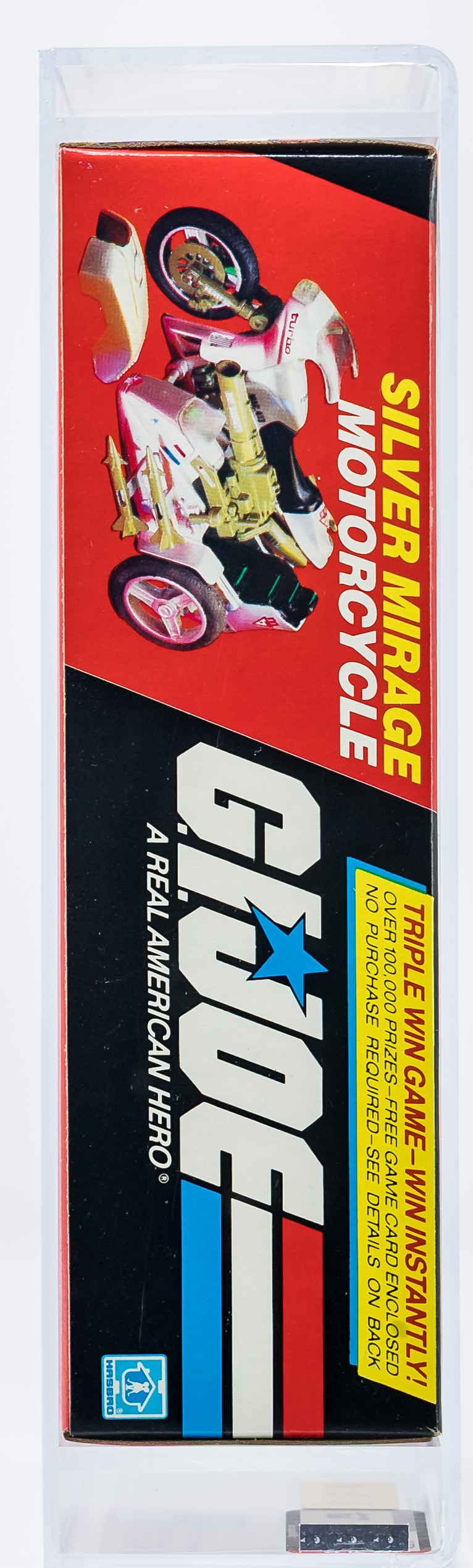 Gorgeous Silver Mirage motorcycle with desirable Triple Win Offer. As good as it gets for this 1985 release. Fantastic factory sealed box virtually free of imperfections. No price tag sticker. This one will no doubt find its way into an elite collection.