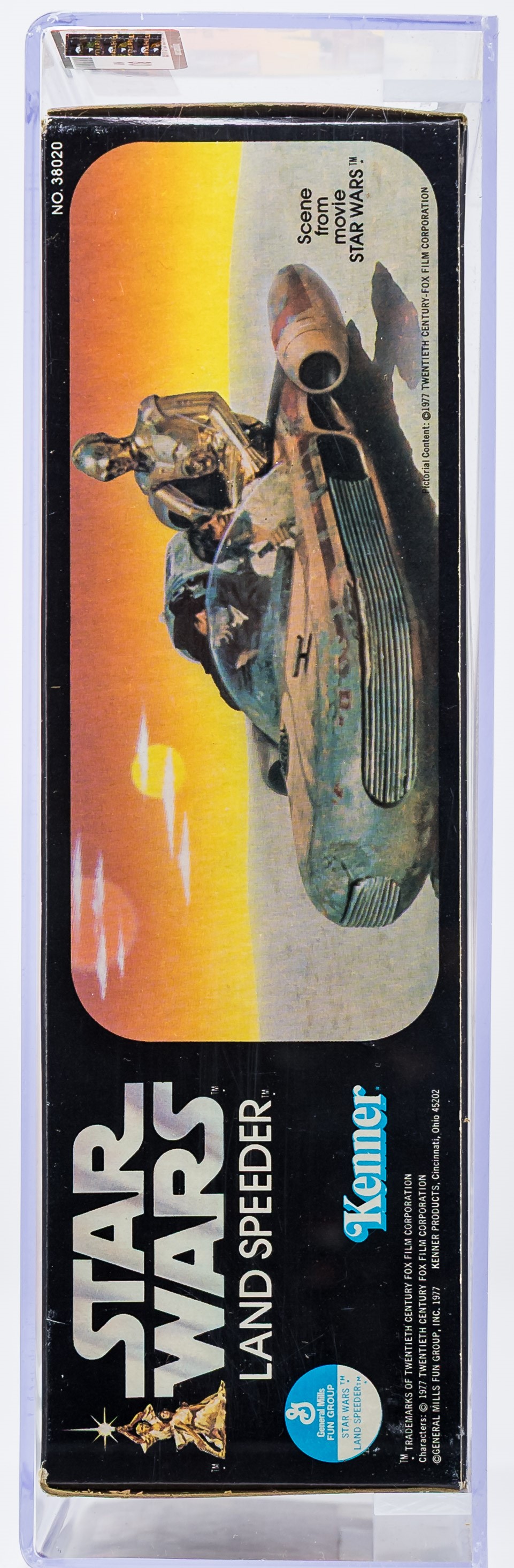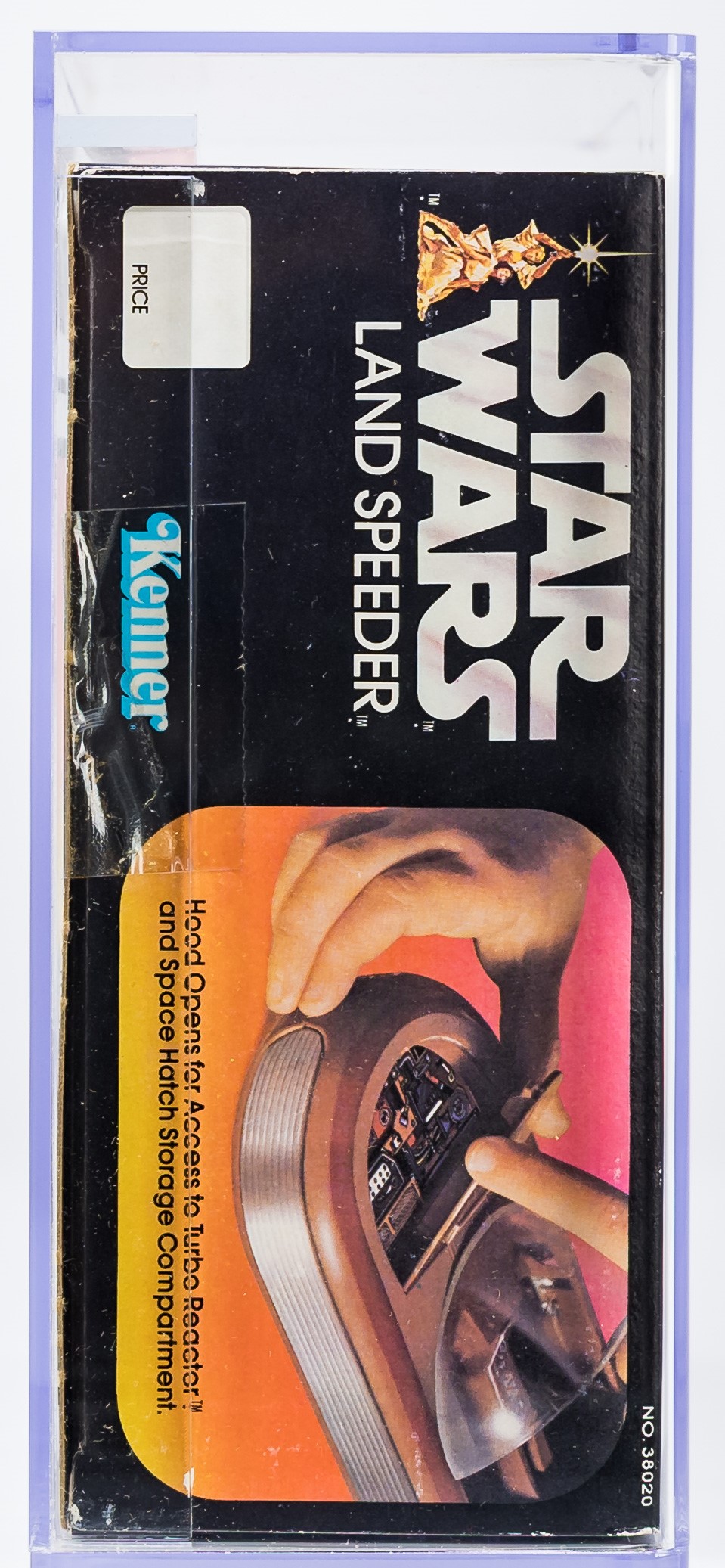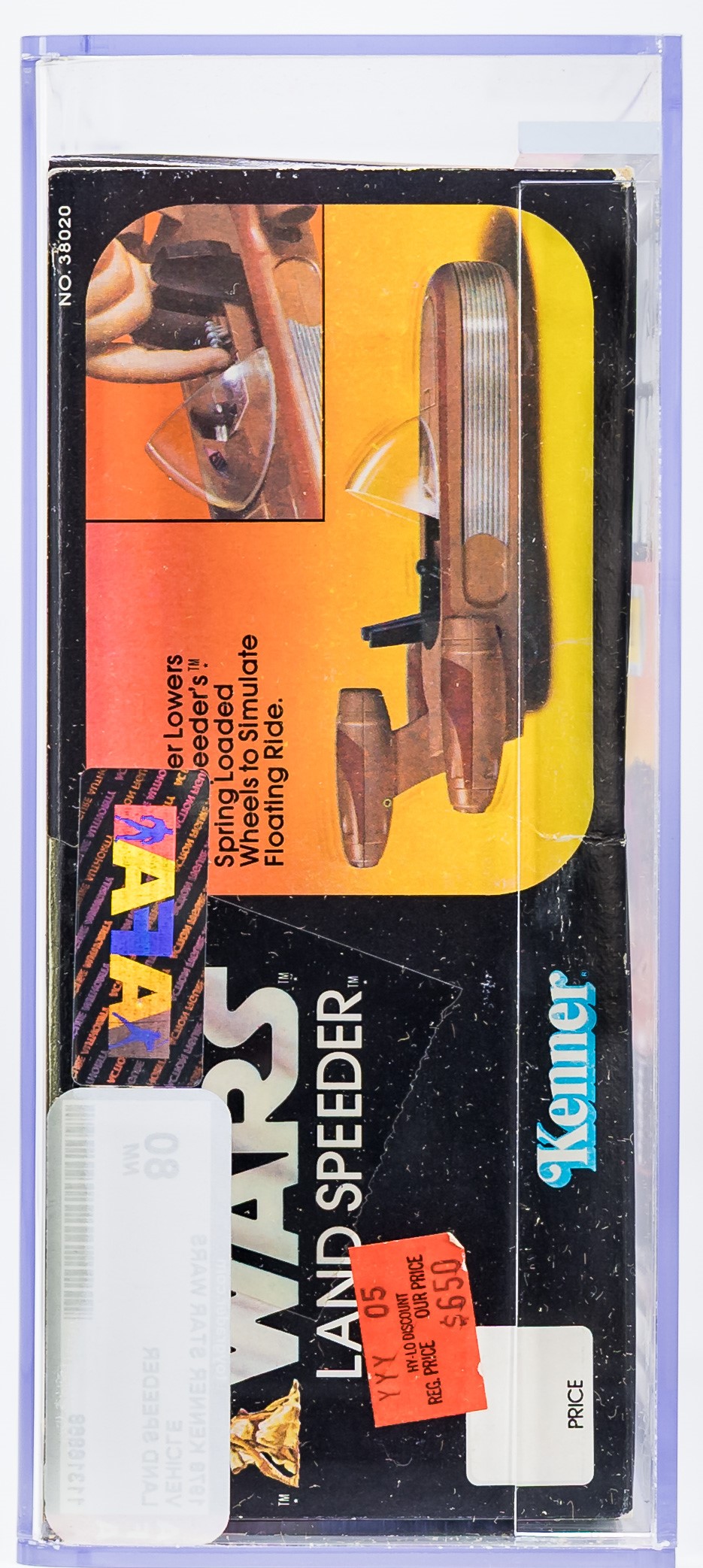 Attractive MISB first-release Land Speeder issued by Kenner in 1978. One of the most popular Star Wars vehicles. Box features the Land Speeder vehicle along with mainstays Luke, Ben, R2, C-3PO, and Stormtrooper. Very clean example. Excellent color throughout with no price tag sticker on front. No price sticker imprint/residue. Each end is firmly factory tape sealed and there is no colorbreak along the edges. Imperfections are few. Outstanding example, a must-have early vehicle. Encapsulated by AFA 80, #11316868
