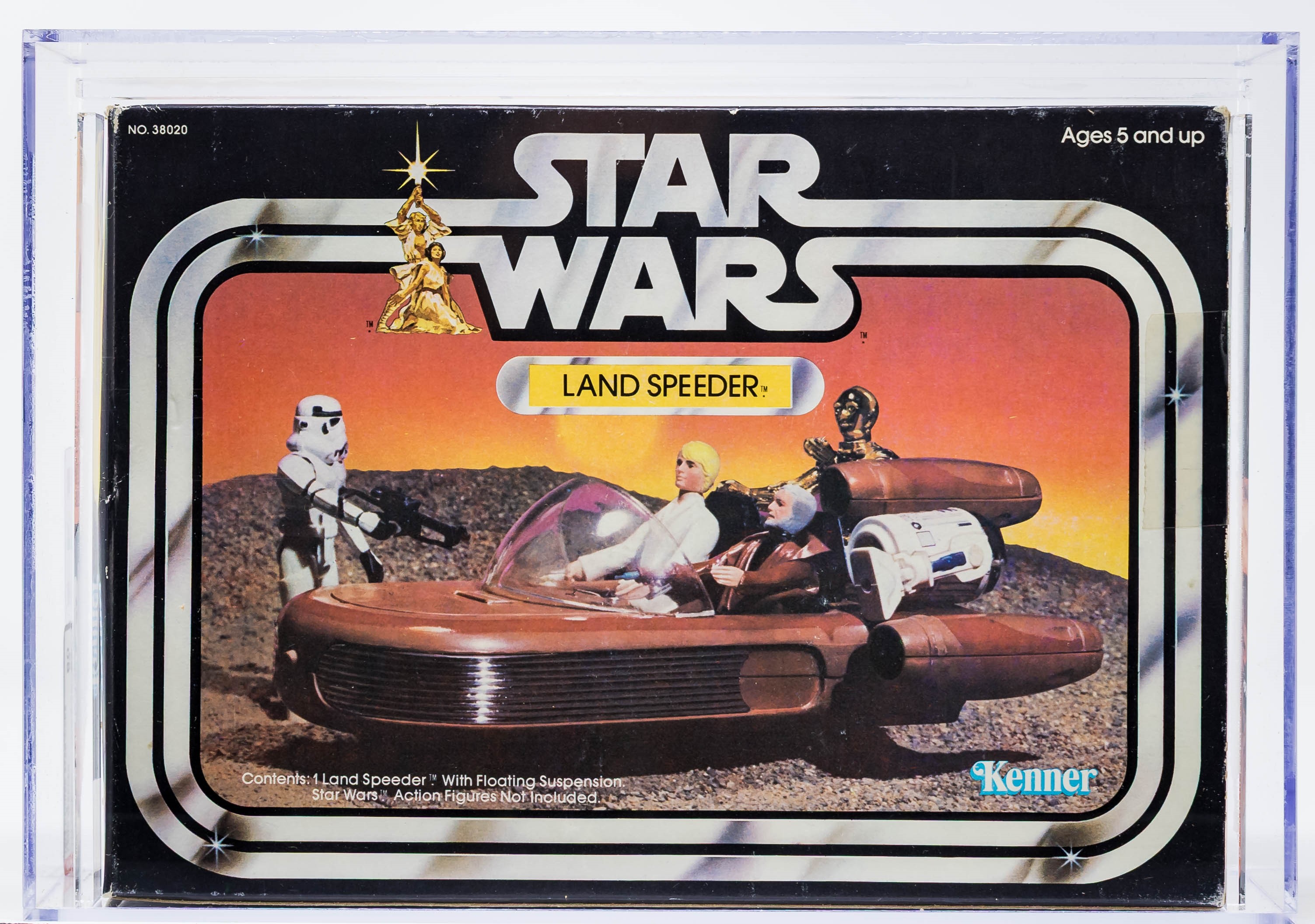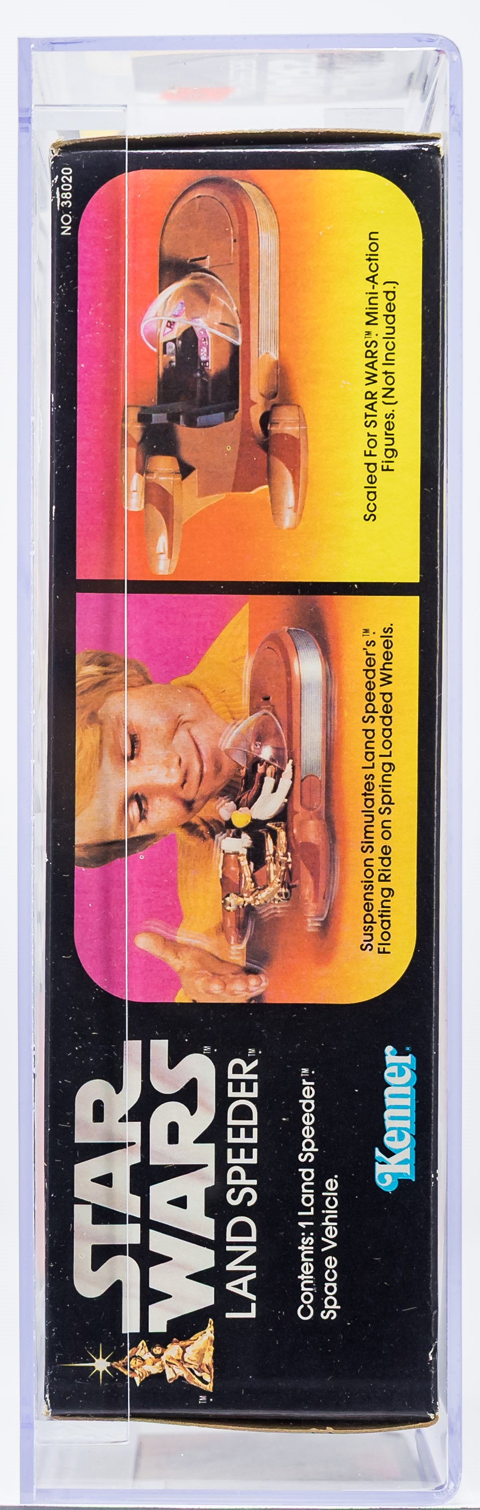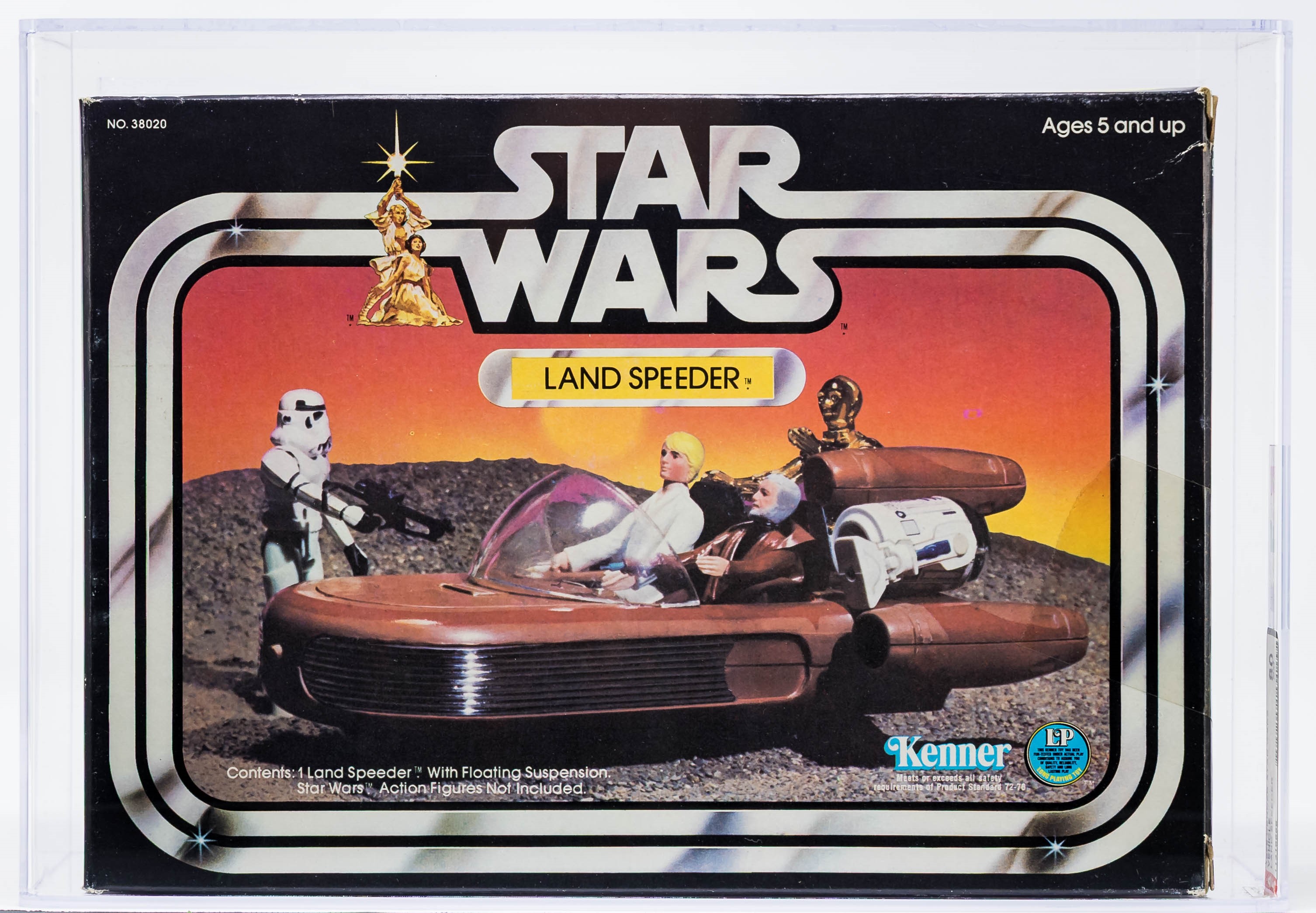 Attractive MISB first-release Land Speeder issued by Kenner in 1978. One of the most popular Star Wars vehicles. Box features the Land Speeder vehicle along with mainstays Luke, Ben, R2, C-3PO, and Stormtrooper. Very clean example. Excellent color throughout with no price tag sticker on front. No price sticker imprint/residue. Each end is firmly factory tape sealed and there is no colorbreak along the edges. Imperfections are few. Outstanding example, a must-have early vehicle. Encapsulated by AFA 80, #11316868