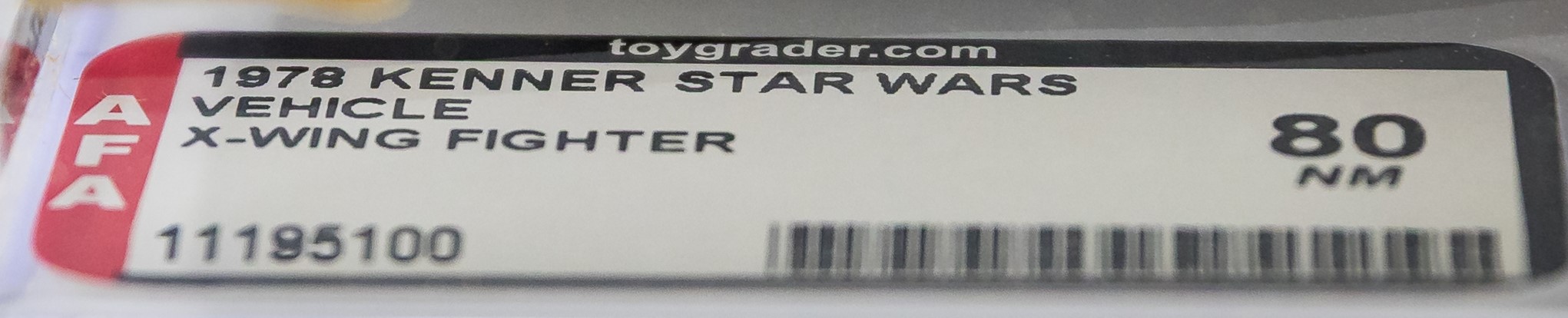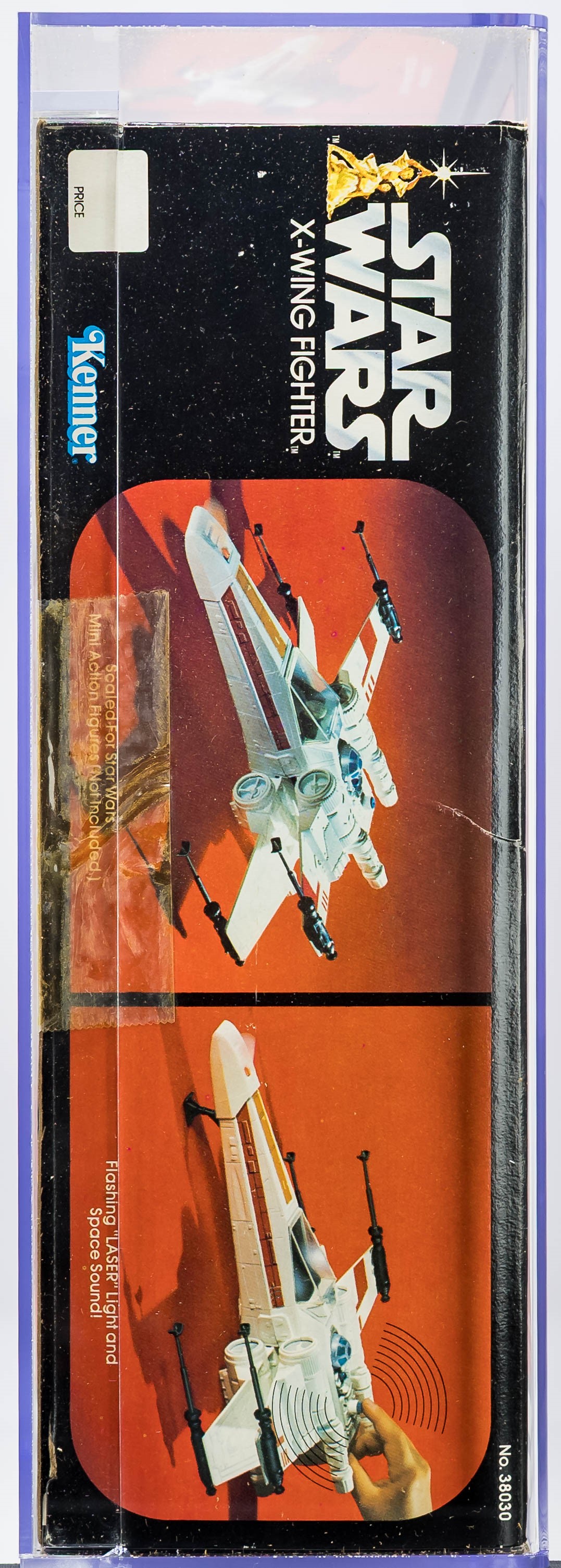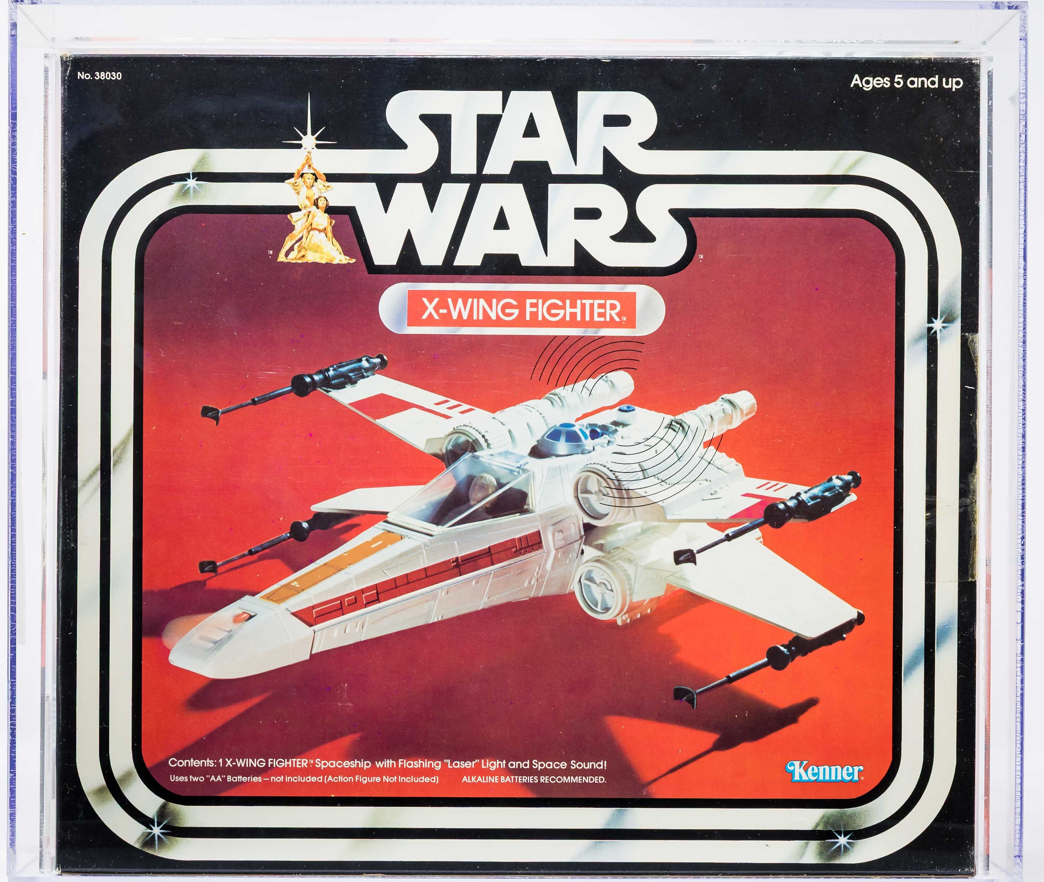 Attractive X-Wing Fighter released by Kenner in 1978. Popular vehicle that was later re-released as part of the Empire Stakes Back line in “Battle Damaged” form. Our offering is the original release. Fantastic example with few imperfections. Excellent color throughout with no price tag sticker (or price sticker imprint/residue). Each end is factory taped and there is no colorbreak along the edges. Please note that the tape along the side panel with the AFA label has lifted (this can be pinned down with a simple recase and request for custom rails). Overall, an outstanding example of a classic Star Wars vehicle. Approximately 15.5 x 4.5 x 13.5. Encapsulated by AFA 80, #11316868