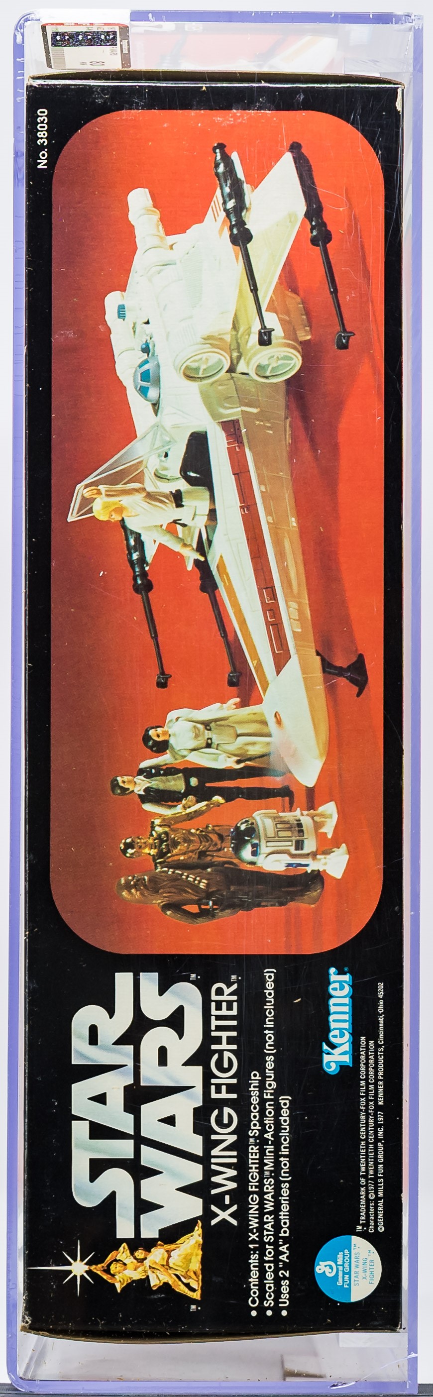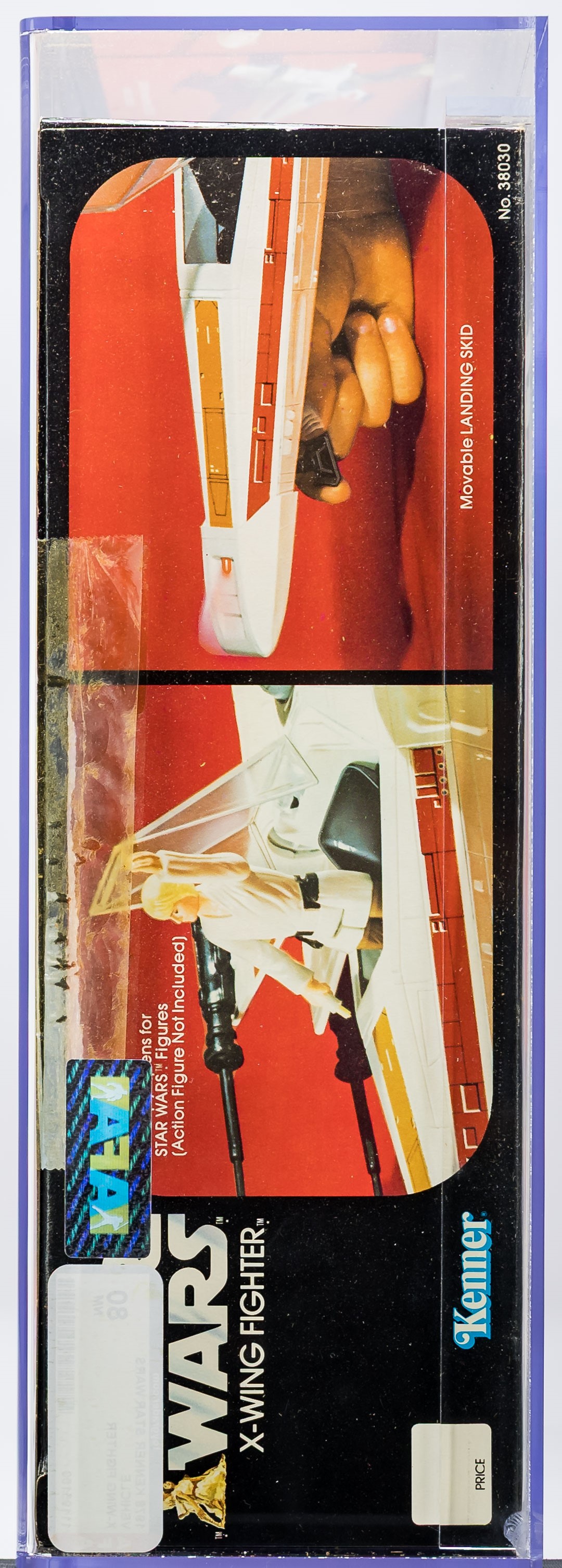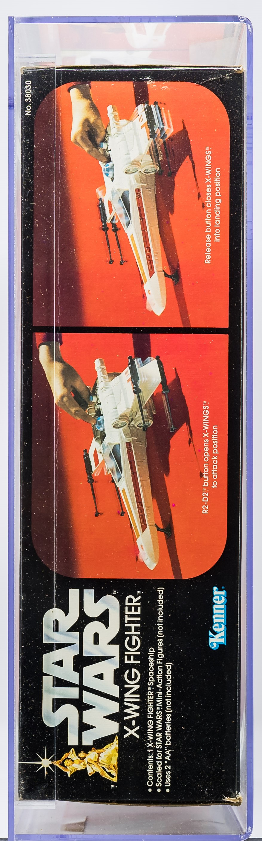 Attractive X-Wing Fighter released by Kenner in 1978. Popular vehicle that was later re-released as part of the Empire Stakes Back line in “Battle Damaged” form. Our offering is the original release. Fantastic example with few imperfections. Excellent color throughout with no price tag sticker (or price sticker imprint/residue). Each end is factory taped and there is no colorbreak along the edges. Please note that the tape along the side panel with the AFA label has lifted (this can be pinned down with a simple recase and request for custom rails). Overall, an outstanding example of a classic Star Wars vehicle. Approximately 15.5 x 4.5 x 13.5. Encapsulated by AFA 80, #11316868