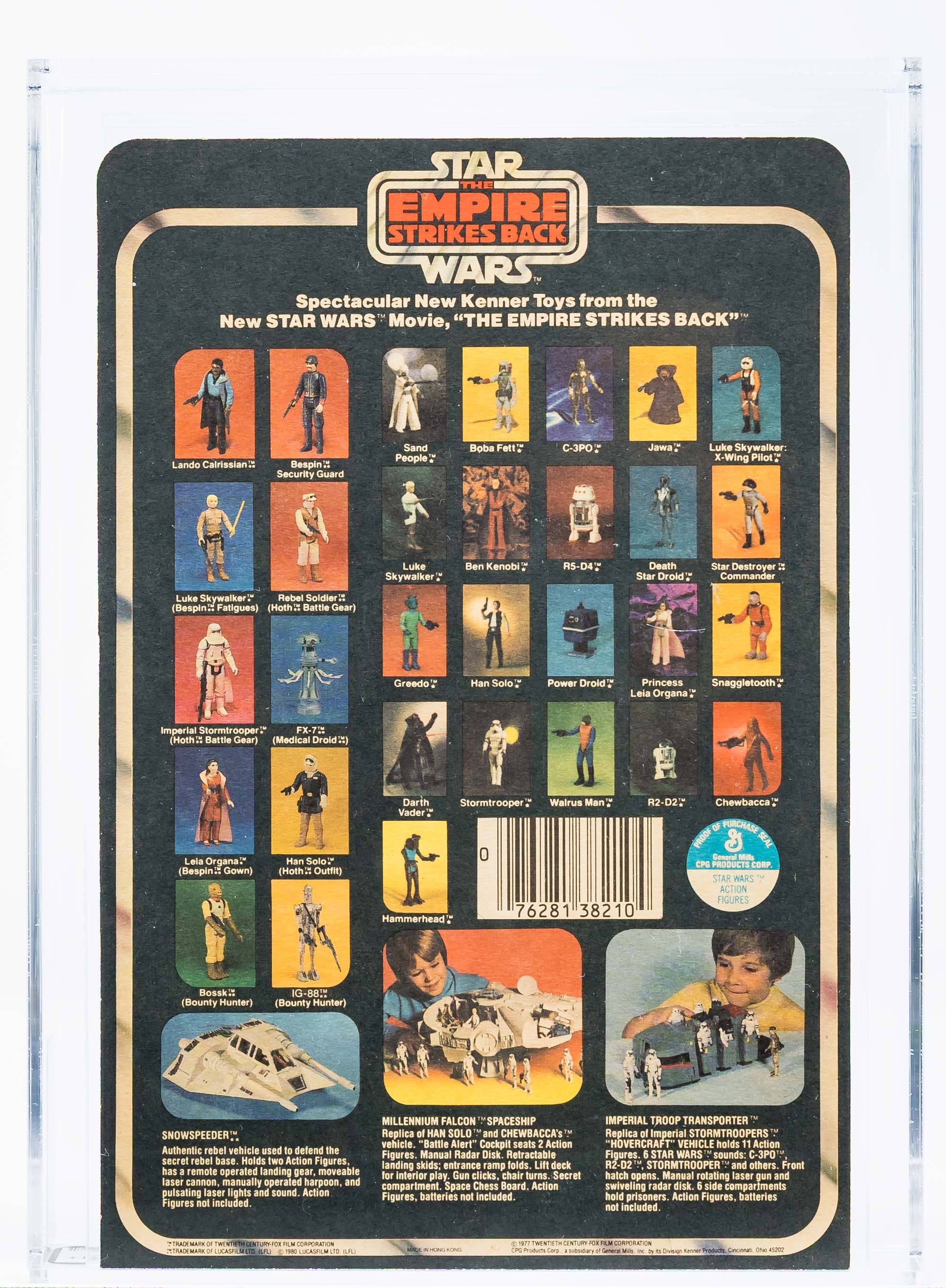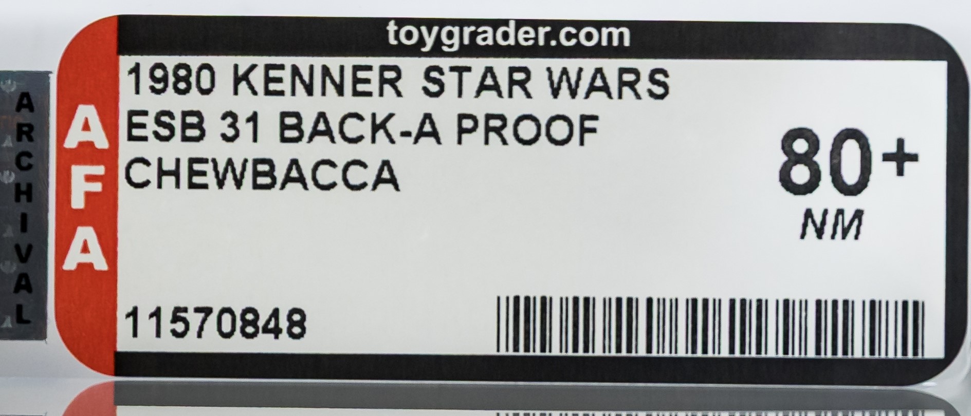 Ultra-rare unpunched Empire Strikes Back Chewbacca PROOF card from 1980. Our example is unpunched and looks outstanding. The front of the card presents extremely well. No creases, no veins, no wrinkles, no edgewear. The back of the card is virtually flawless as well – toning on back is the only imperfection we identified. With a total AFA population of only four, it’s safe to say quite a few upper-end Star Wars collectors will be after this one. Encapsulated by AFA 80+, #11570848