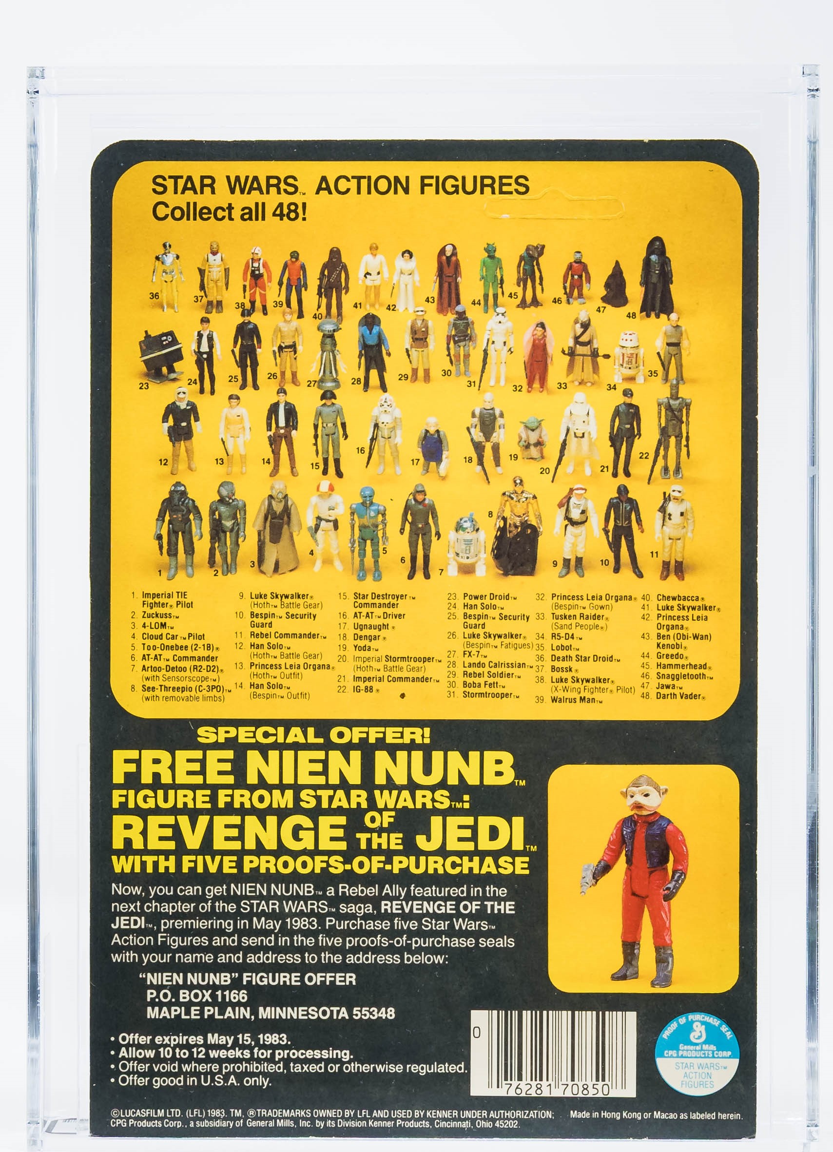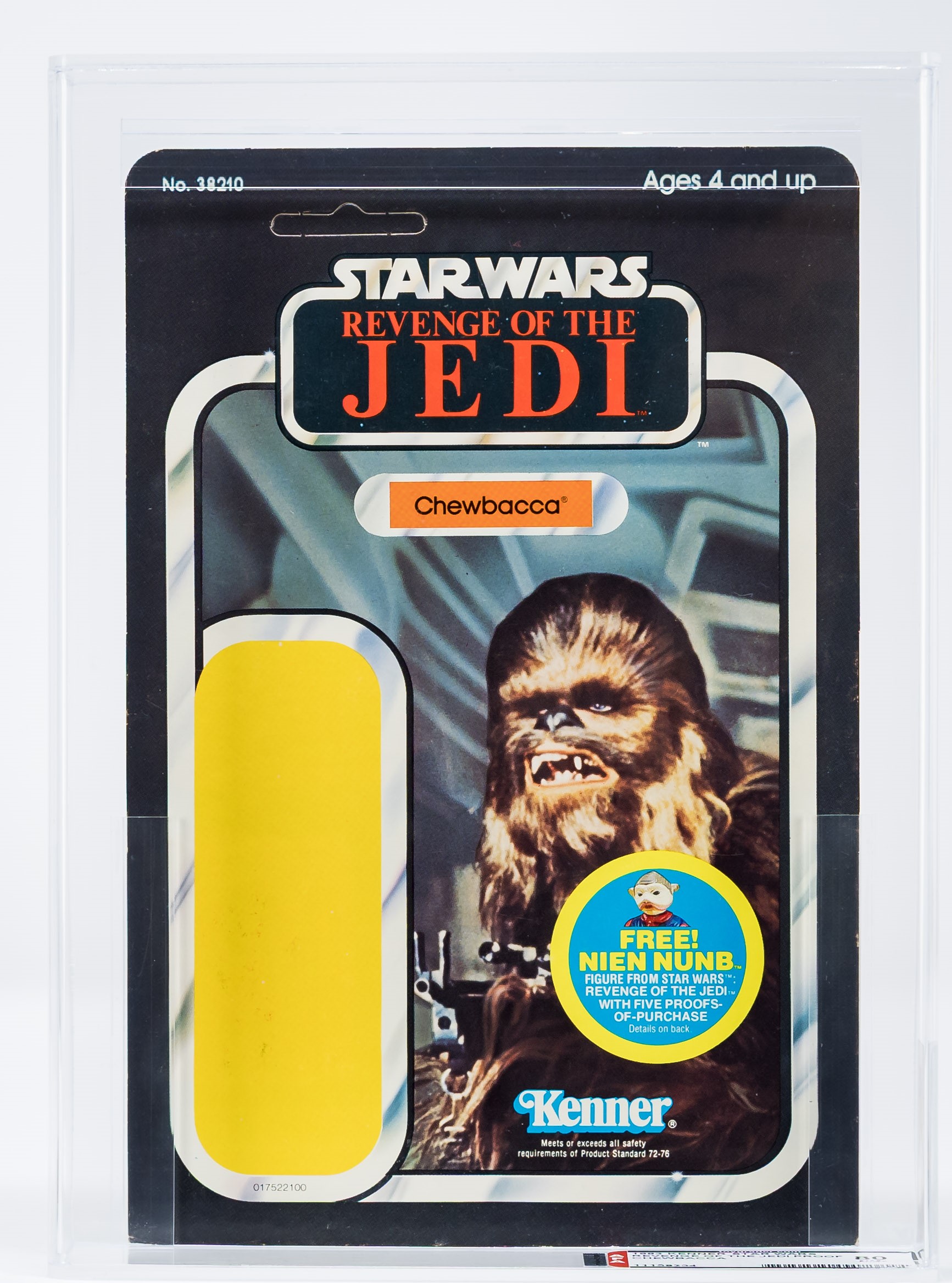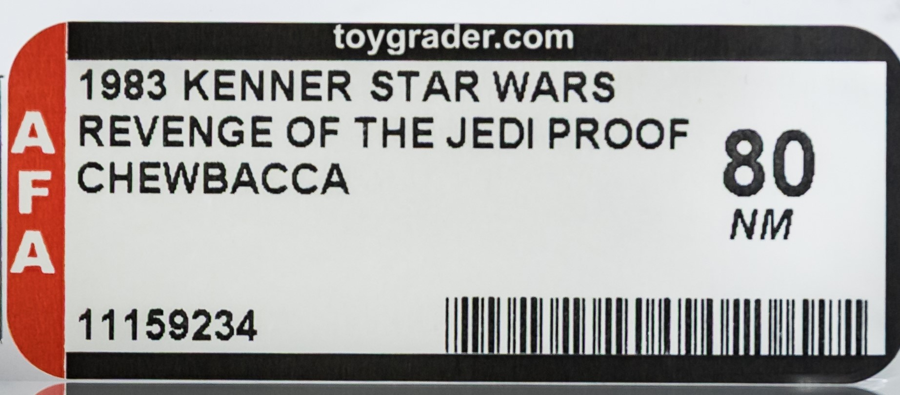 Attractive Chewbacca Revenge of the Jedi PROOF card from 1983. Although the Revenge proofs are not as rare as the Return of the Jedi proofs, with only 21 examples across all grades in the AFA population, this one is still quite elusive. Our example is unpunched and presents quite well. The color is a touch lighter than the prior lot and there is a bit of surface wear on front. Otherwise, outstanding. No creases, no veins, no wrinkles, no edgewear front or back. An amazing opportunity to nab not one, but two Chewy proofs! Encapsulated by AFA 80, #11159234