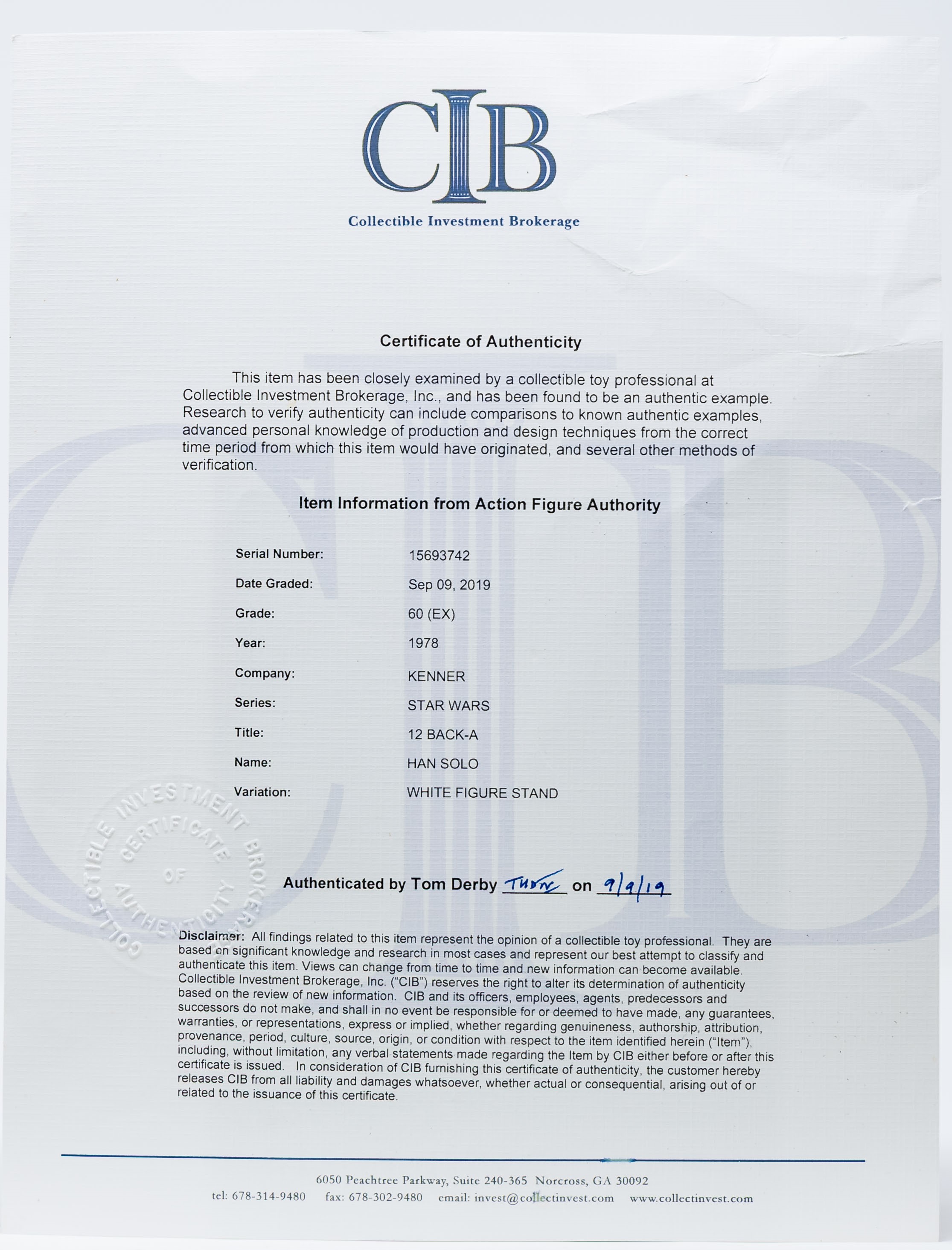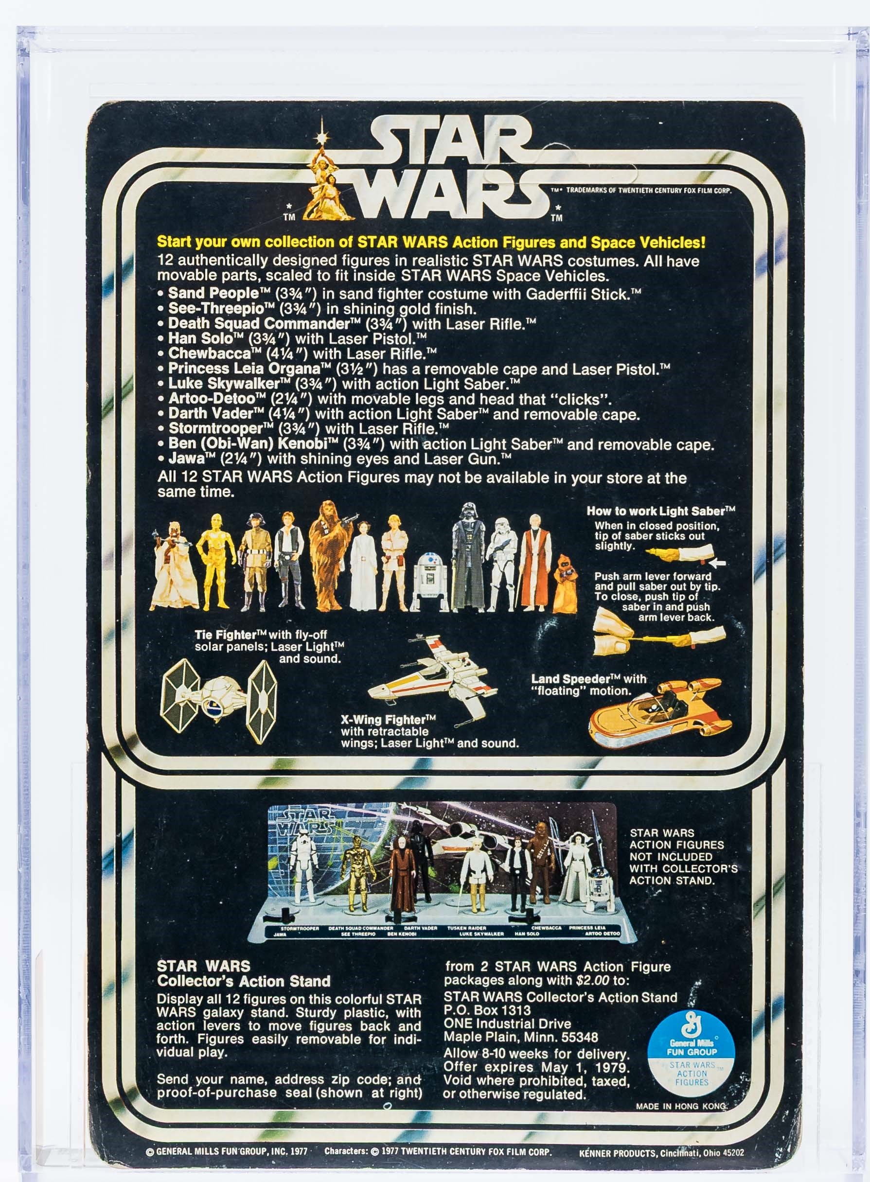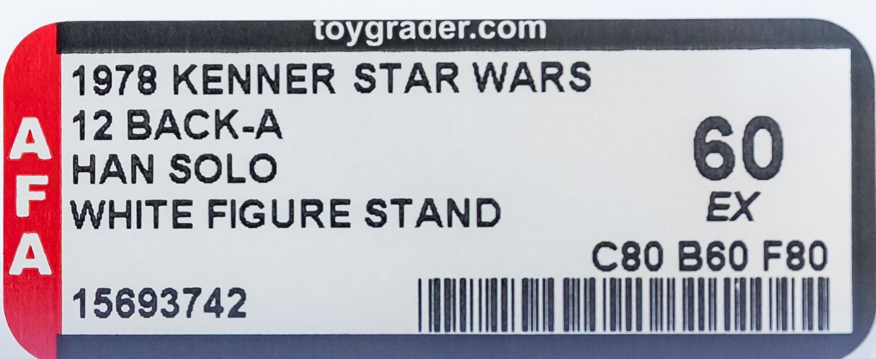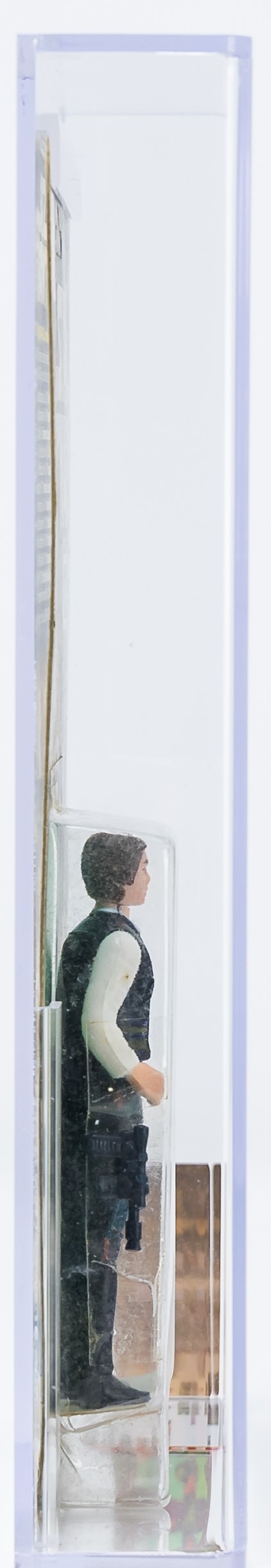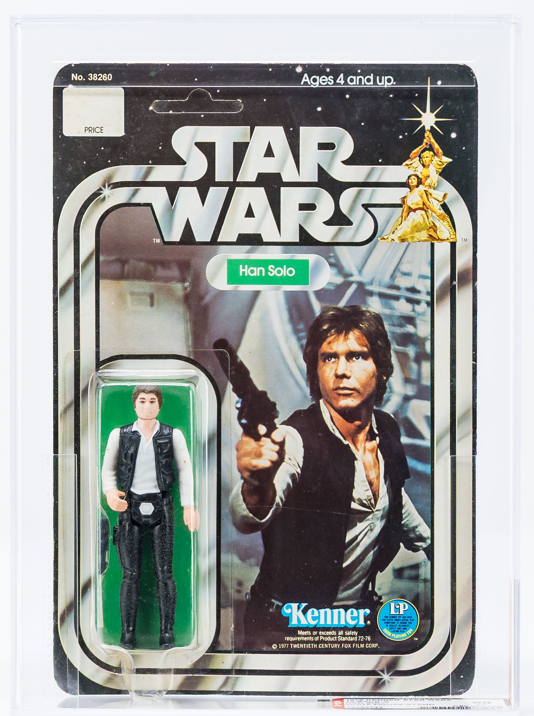 Considered by many to be salesman samples, we are pleased to offer an exceedingly rare Han Solo 12 Back-A with White Figure Stand released in 1978. Although the technical grade is AFA 60, the eye appeal is strong. Very nice unpunched card with few blemishes. The bubble is clear and retains great form. This issue, and the reason for the downgrade, is a crack beneath the stem of the bubble. This imperfection is out-of-sight and does not affect the eye appeal of the piece when displayed on shelf. Han figure exhibits very light frosting. His blaster is attached by tape to the side of the bubble. Overall, a very well-presenting example. A true rarity, the first we have offered in our auctions. Encapsulated by AFA 60, (80-60-80), #15693742