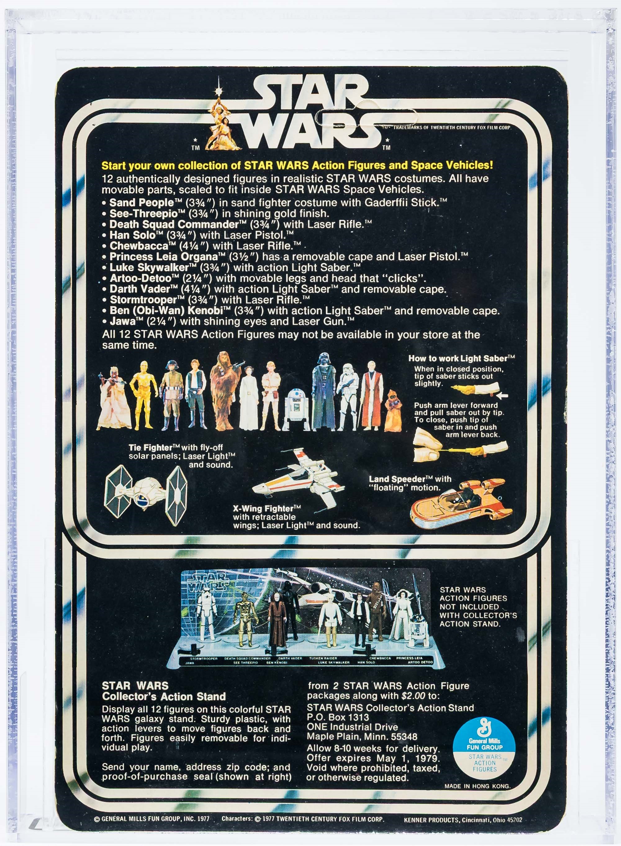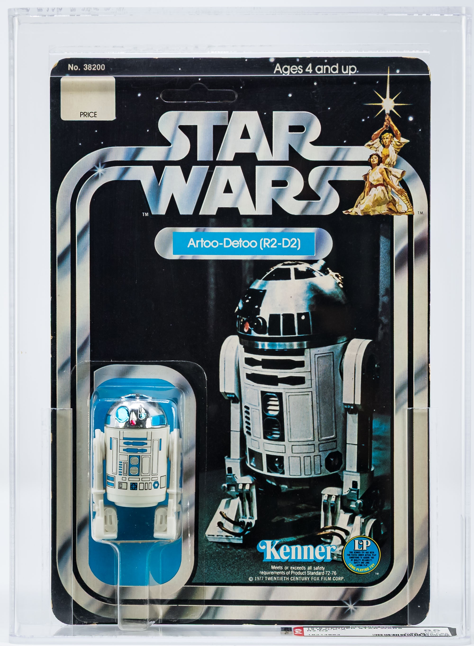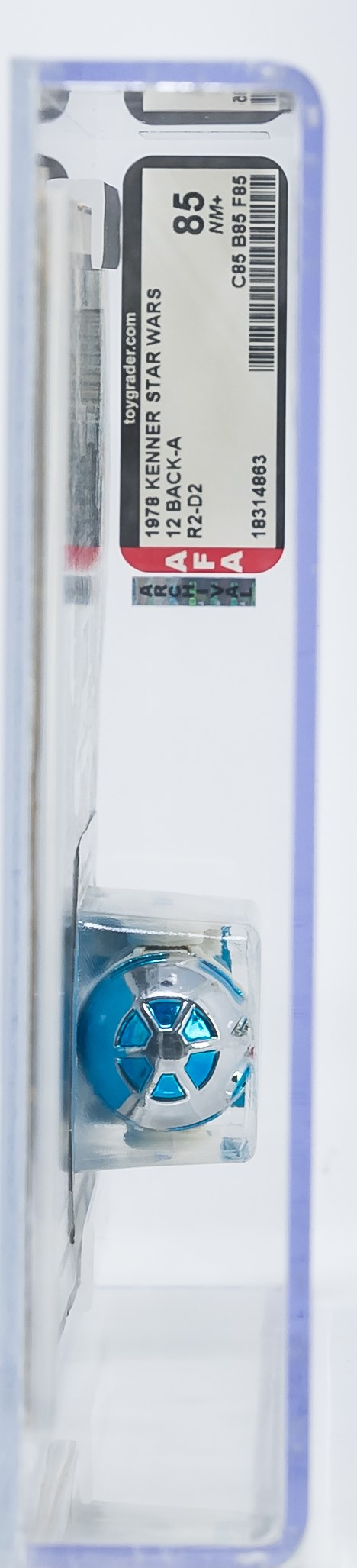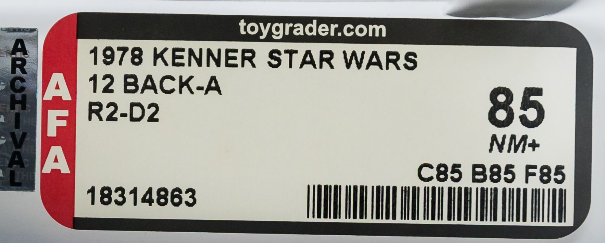 R2-D2 on early 12 Back-A card released by Kenner in 1978. The 12 Back-A examples are becoming very difficult to find with “triple 85” subgrades. In fact, this is the very first time we have offered a clear bubble R2 in our auctions.