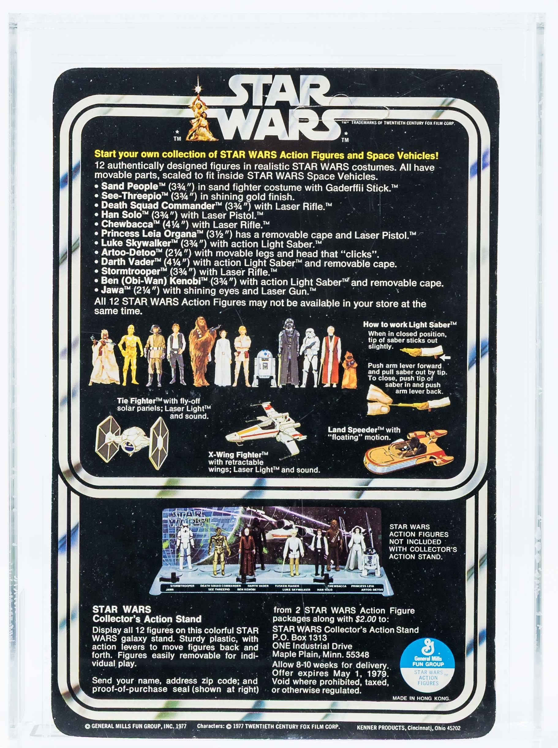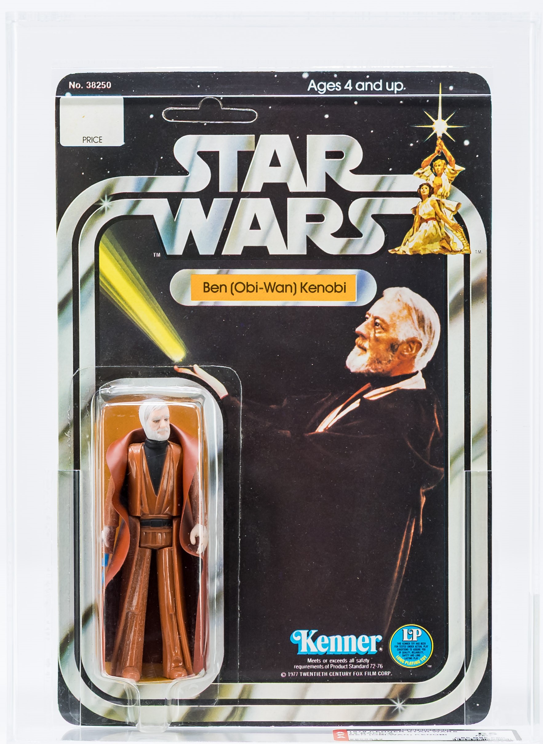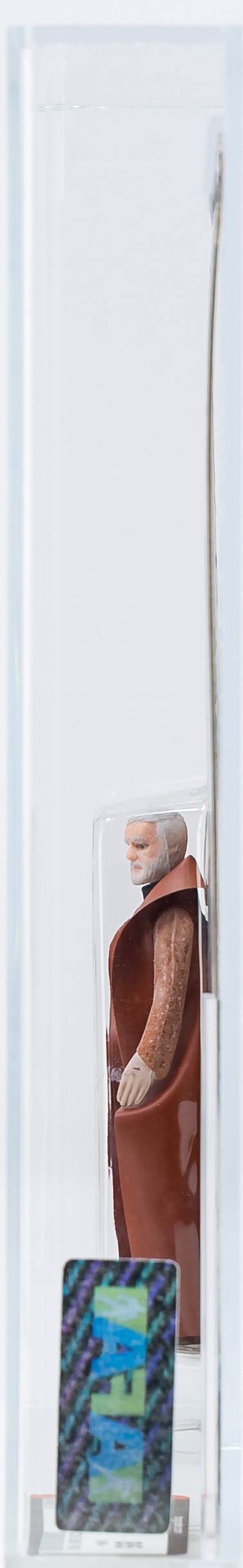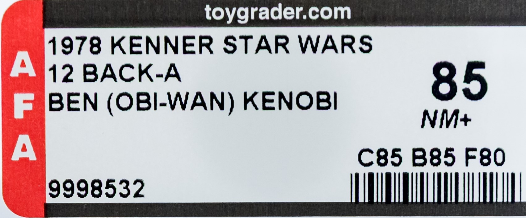 High-grade AFA 85 Ben Kenobi on early 12 Back-A card released by Kenner in 1978. Outstanding unpunched card with few imperfections. No price tag sticker but there is a bit of sticker residue over the white price square in the upper corner. Card lies perfectly flat and showcases outstanding color. Bubble is crystal clear and retains perfect form. Action figure within exhibits frosting on left arm and right/left leg (80 subgrade). Vinyl cape shows no discoloration. Encapsulated by AFA 85, (85-85-80), #9998532