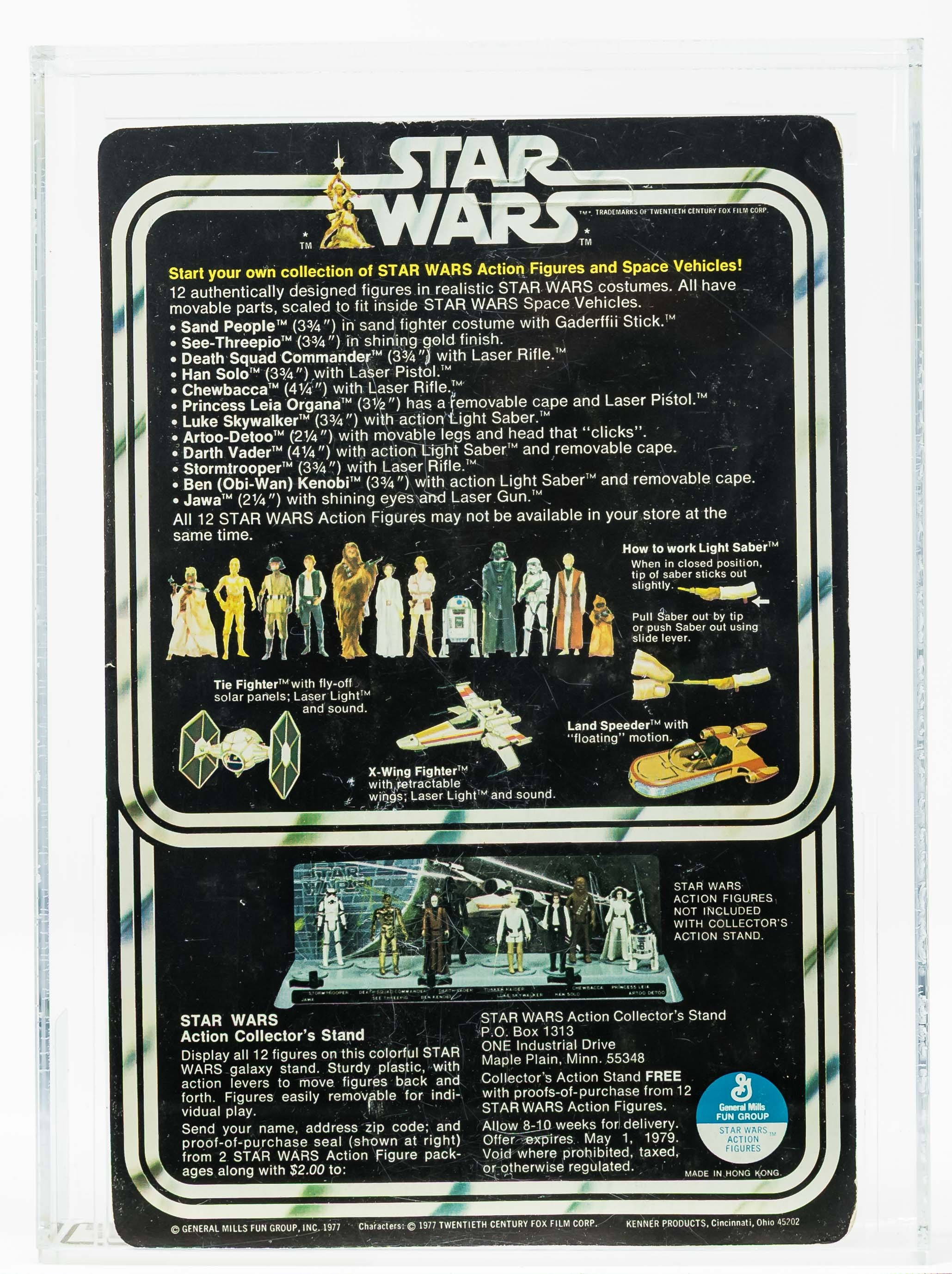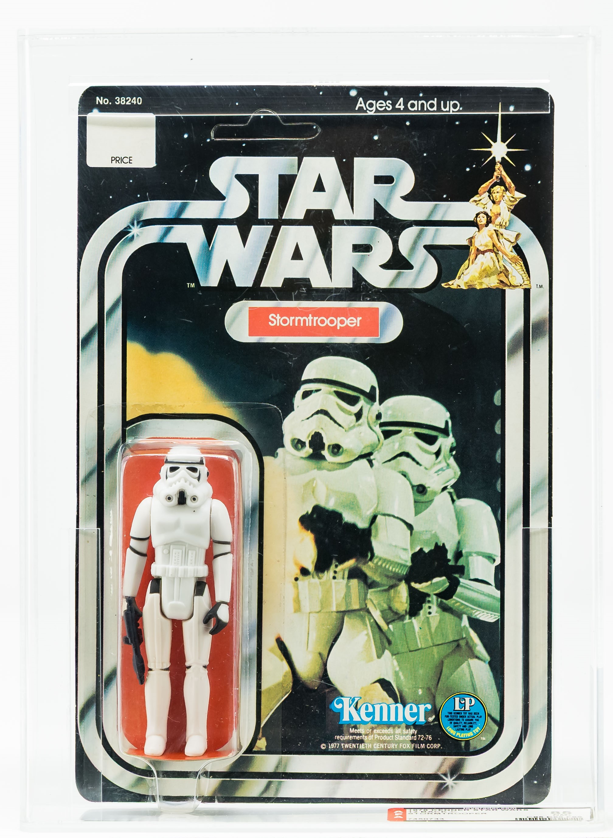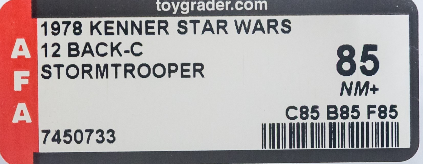Gorgeous high-grade Stormtrooper on 12 Back-C card released by Kenner in 1978. Elusive “triple 85” example. Unpunched card is immaculate with outstanding gloss - virtually free of imperfections. No price tag sticker or price tag sticker residue/imprint. Card is flat, no waviness. Bubble is crystal clear and retains perfect form. No dents, dings, or cracks. The Stormtrooper action figure within is perfectly white with no yellowing. Awesome 85-85-85 example. Encapsulated by AFA 85, (85-85-85), #7450733