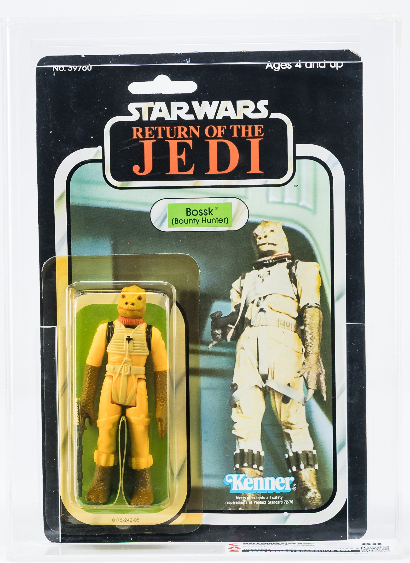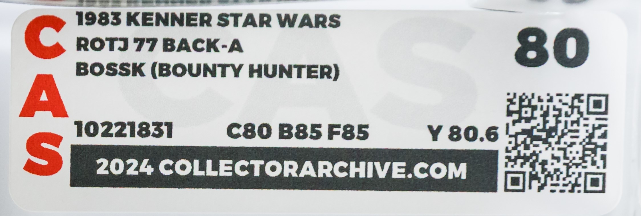 Well-presenting Bossk from the Return of the Jedi line in 1983. Card exhibits a bit of waviness and horizontal wrinkling on the reverse. Bubble is yellowed but is otherwise in mint condition retaining perfect form. Action figure looks great within. Encapsulated by CAS 80y, (80-85-85), #10221831