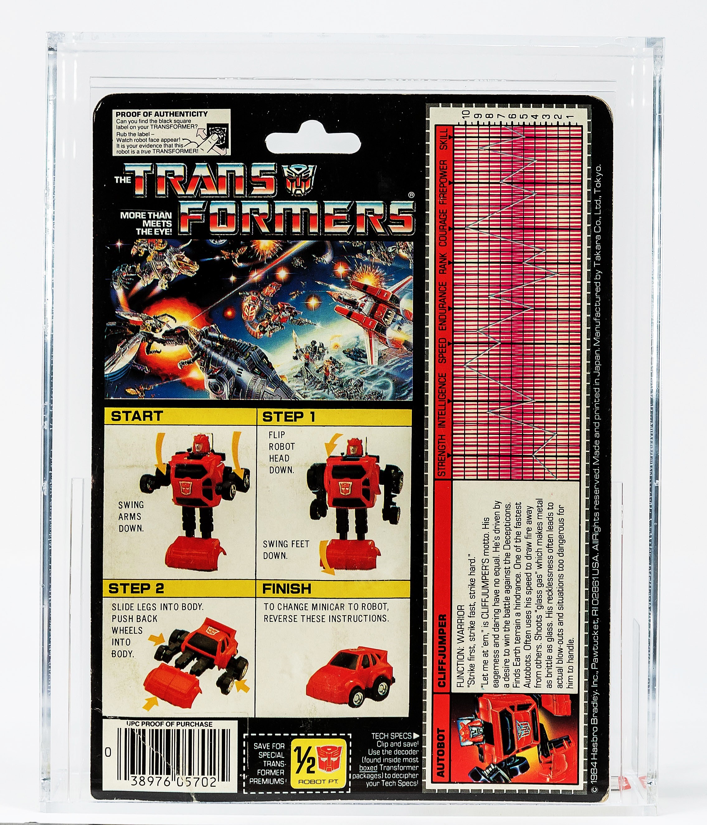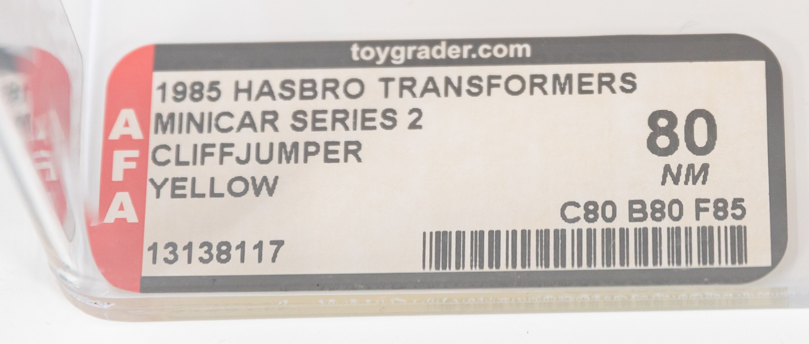 Presented is popular Series Two Autobot: Cliffjumper. An “80” card due to several veins identified in direct lighting, the card itself is otherwise very clean. A hot piece that will surely capture the attention of G1 collectors. Encapsulated by AFA (80, 80-80-85), #13138117