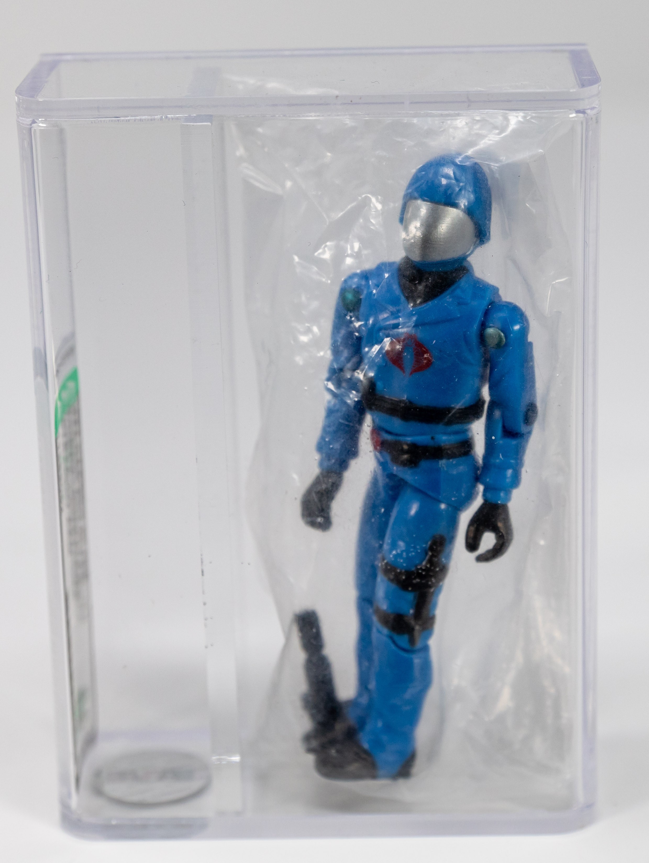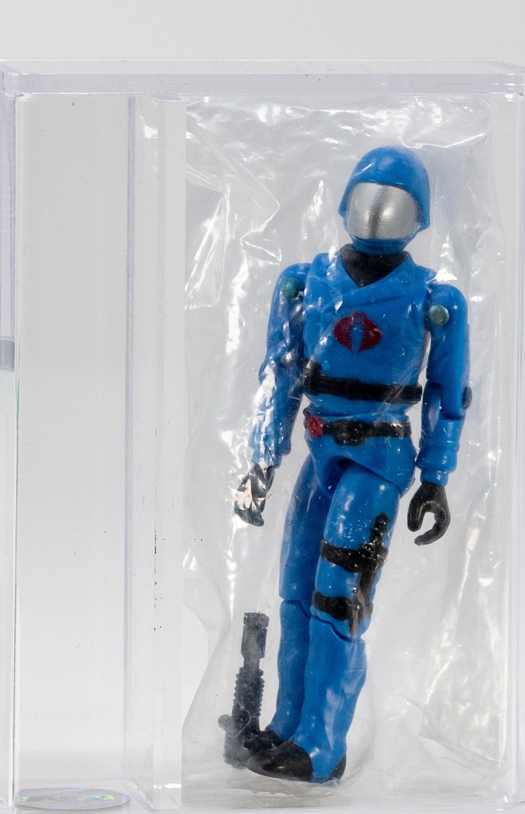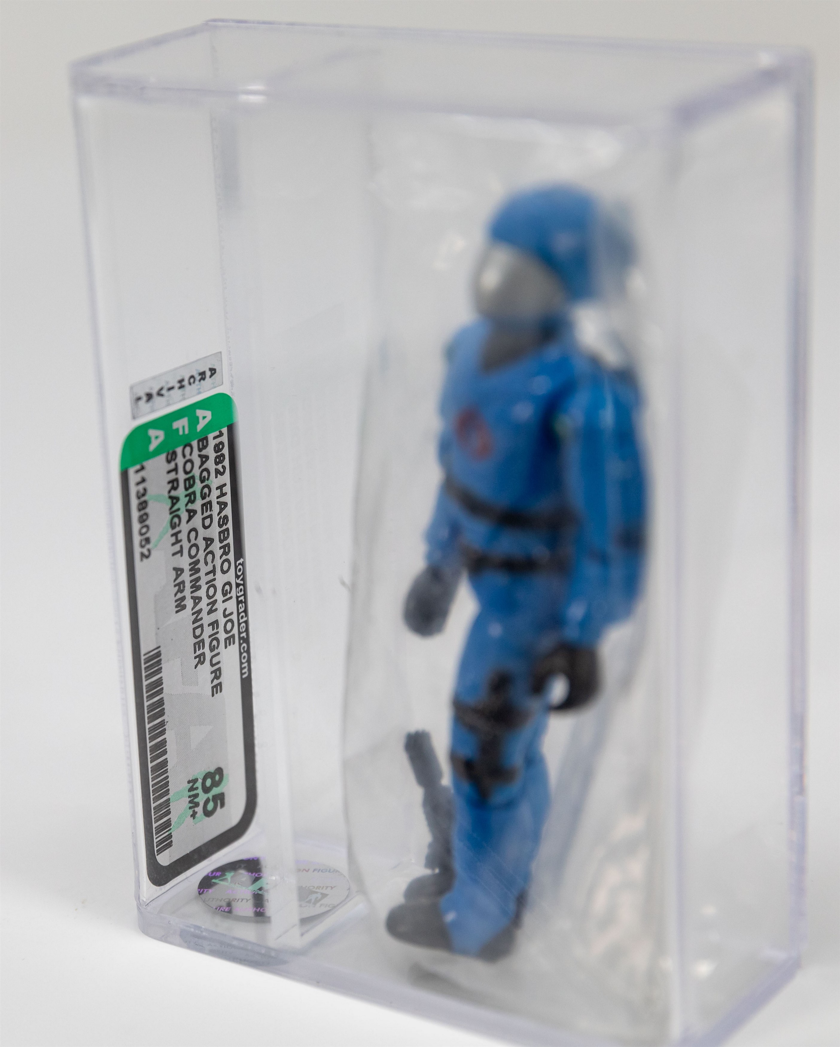 Before the carded swivel arm adaptation of Cobra Commander came the straight arm version – available only via mail away.  Each of the nine original carded G.I. Joes featured a mail-in redemption offer in exchange for a loose Cobra Commander figure.  Offered here is the figure from that decades old redemption.  Incredibly it’s preserved in the original factory sealed plastic bag.  Further it’s graded an impressive 85 by AFA.  It must be noted that the graded variety are in rather short supply as AFA no longer grades loose G.I. Joe figures.  While the carded version may be out of the price range of most, many will see this version as an affordable opportunity to own a quality piece.  Encapsulated by AFA (85), #11389052