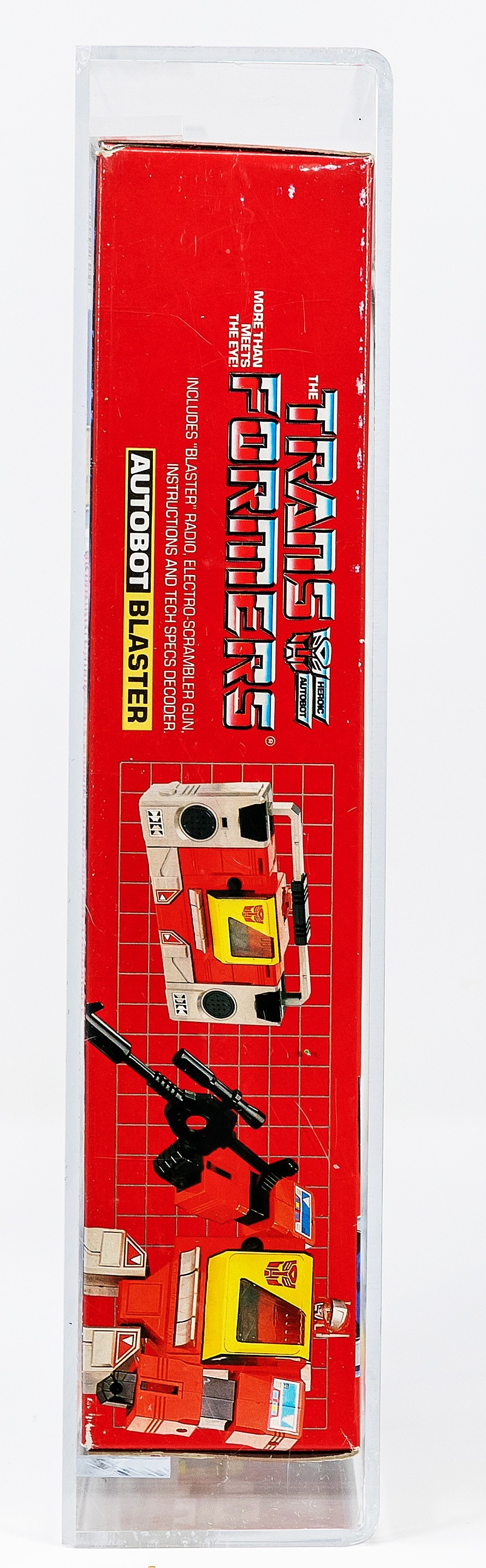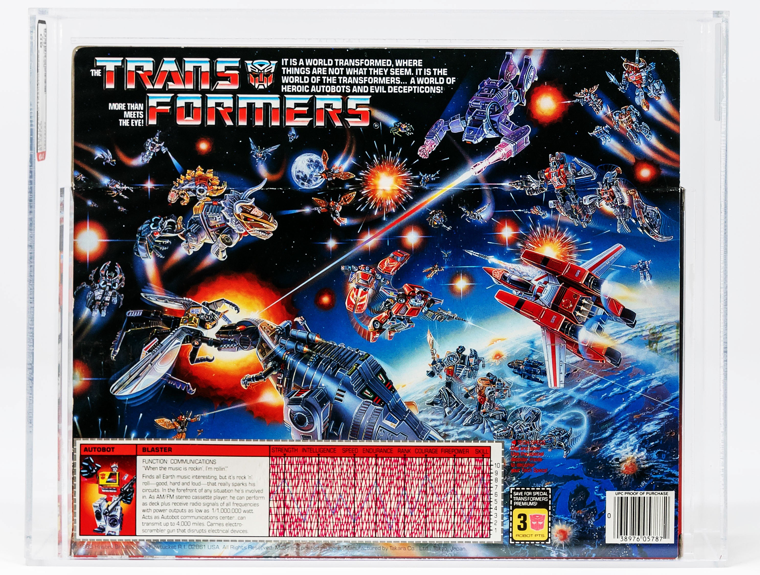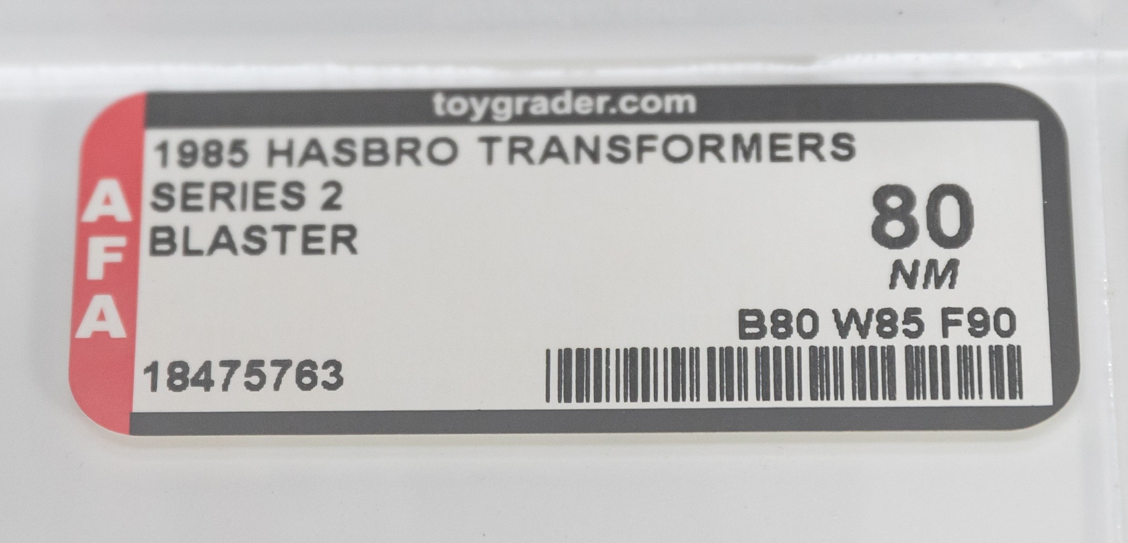 Offered is an extremely presentable example of one of the most desirable Series 2 Autobots: Blaster. Mint in box (MIB), this AFA 80 red label is crisp and clean. Tape is broken on both sides but only the right edge shows a light colorbreak. The reverse looks great but does exhibit the typical G1 flap crease. Colors are flawless and vibrant with perfect gloss. Overall, a wonderful example of a very elusive piece. Encapsulated by AFA (80, 80-85-85), #18475763