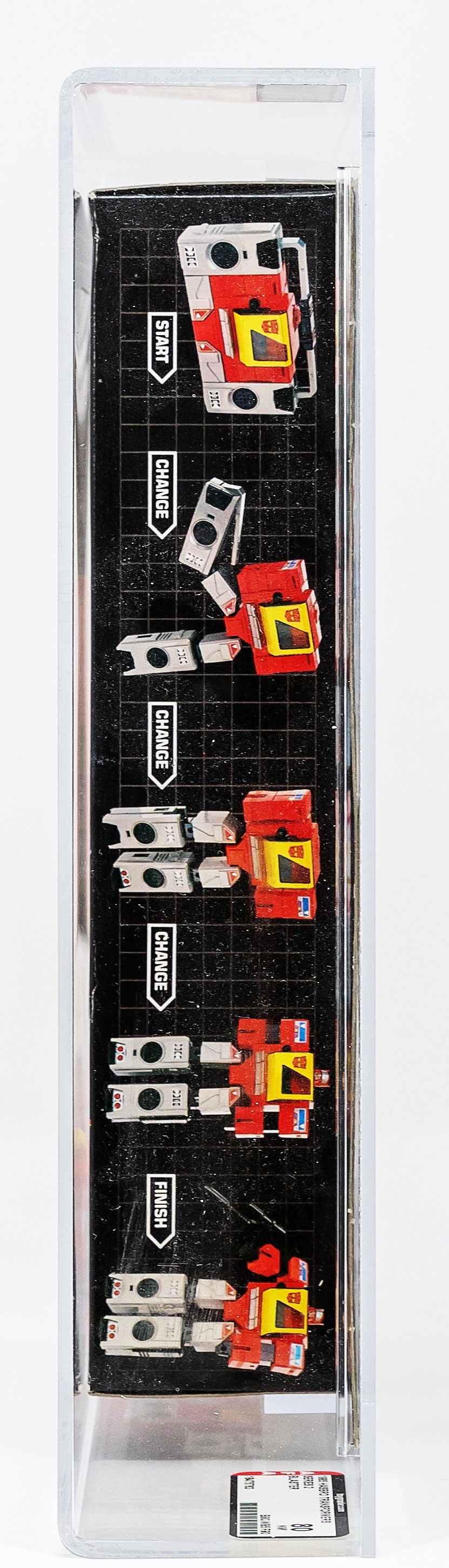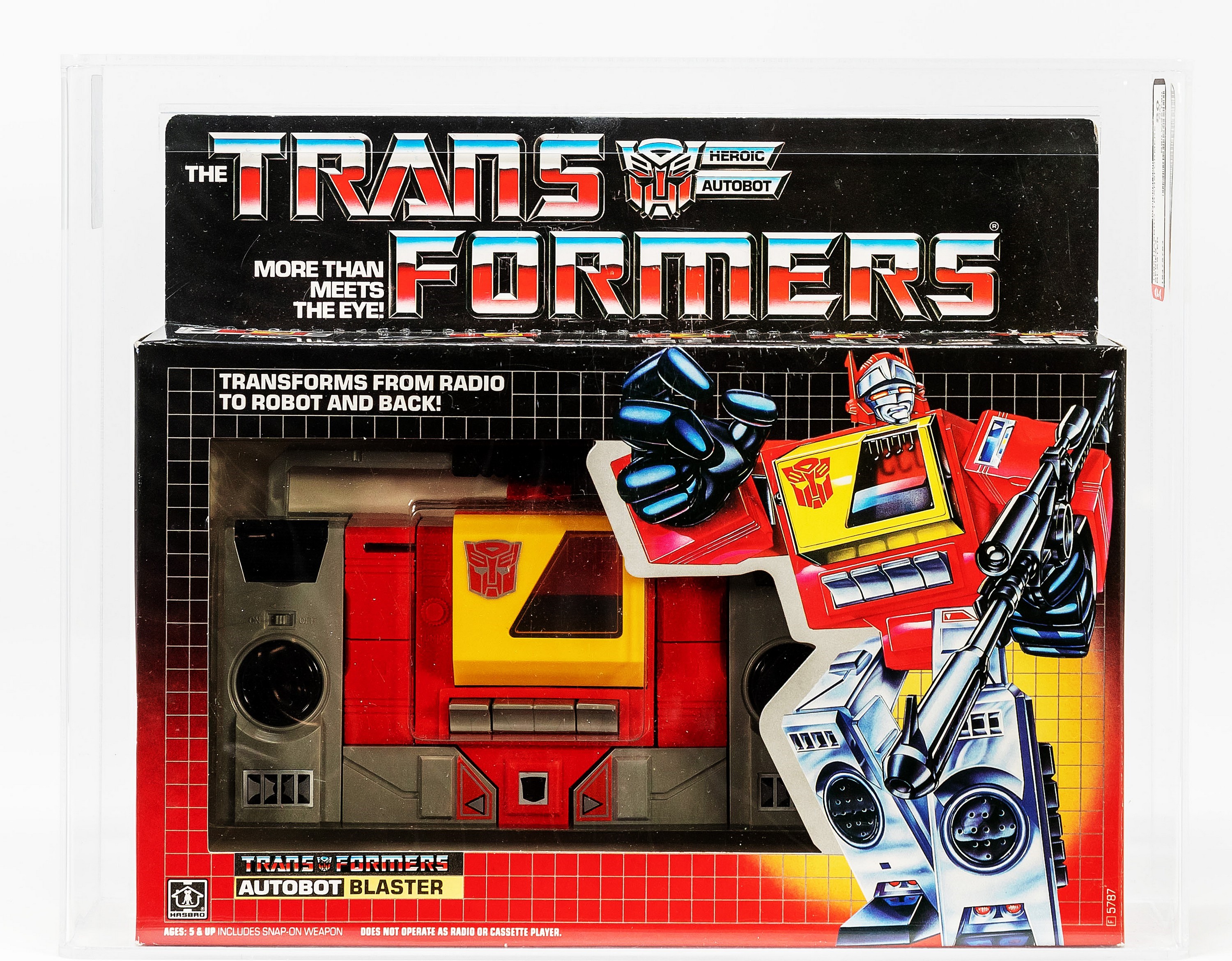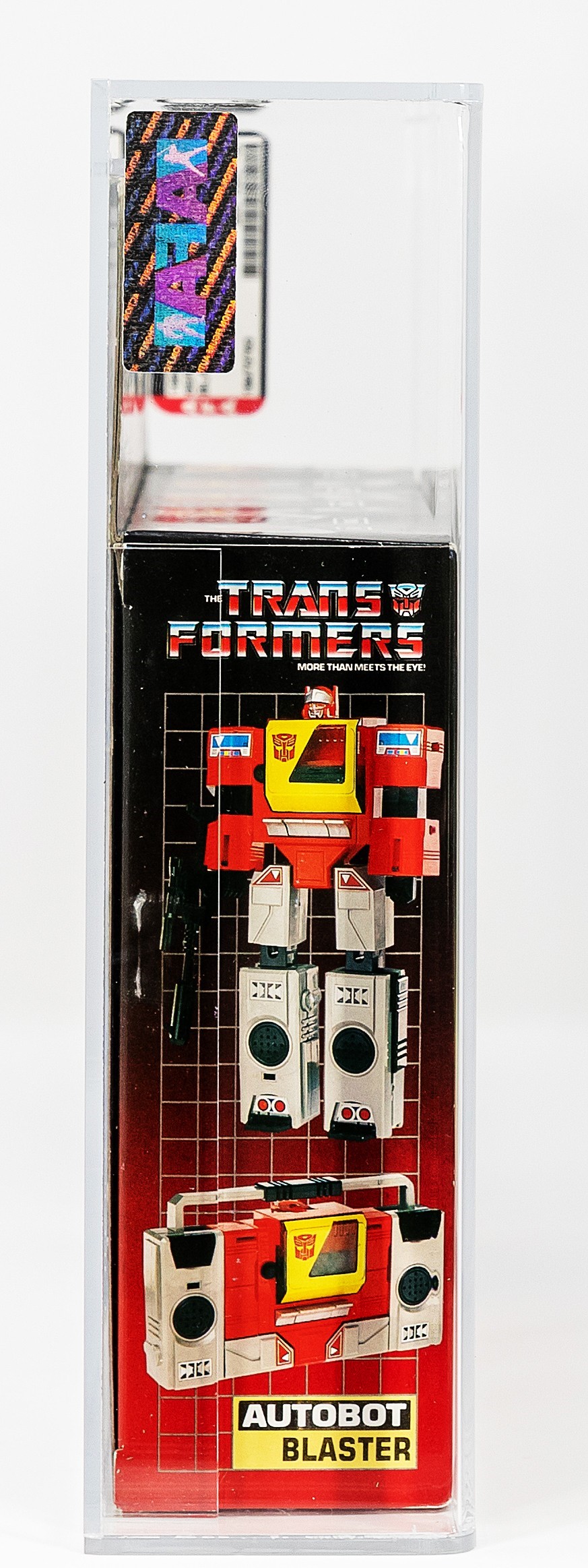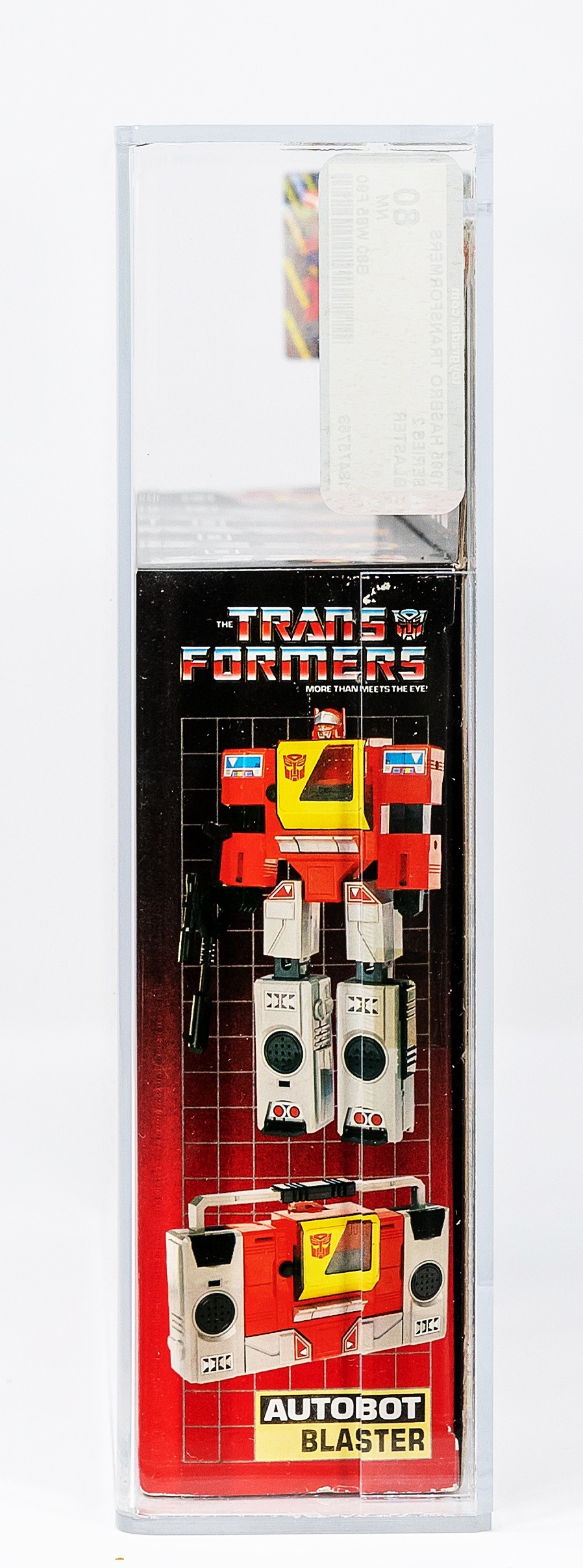 Offered is an extremely presentable example of one of the most desirable Series 2 Autobots: Blaster. Mint in box (MIB), this AFA 80 red label is crisp and clean. Tape is broken on both sides but only the right edge shows a light colorbreak. The reverse looks great but does exhibit the typical G1 flap crease. Colors are flawless and vibrant with perfect gloss. Overall, a wonderful example of a very elusive piece. Encapsulated by AFA (80, 80-85-85), #18475763