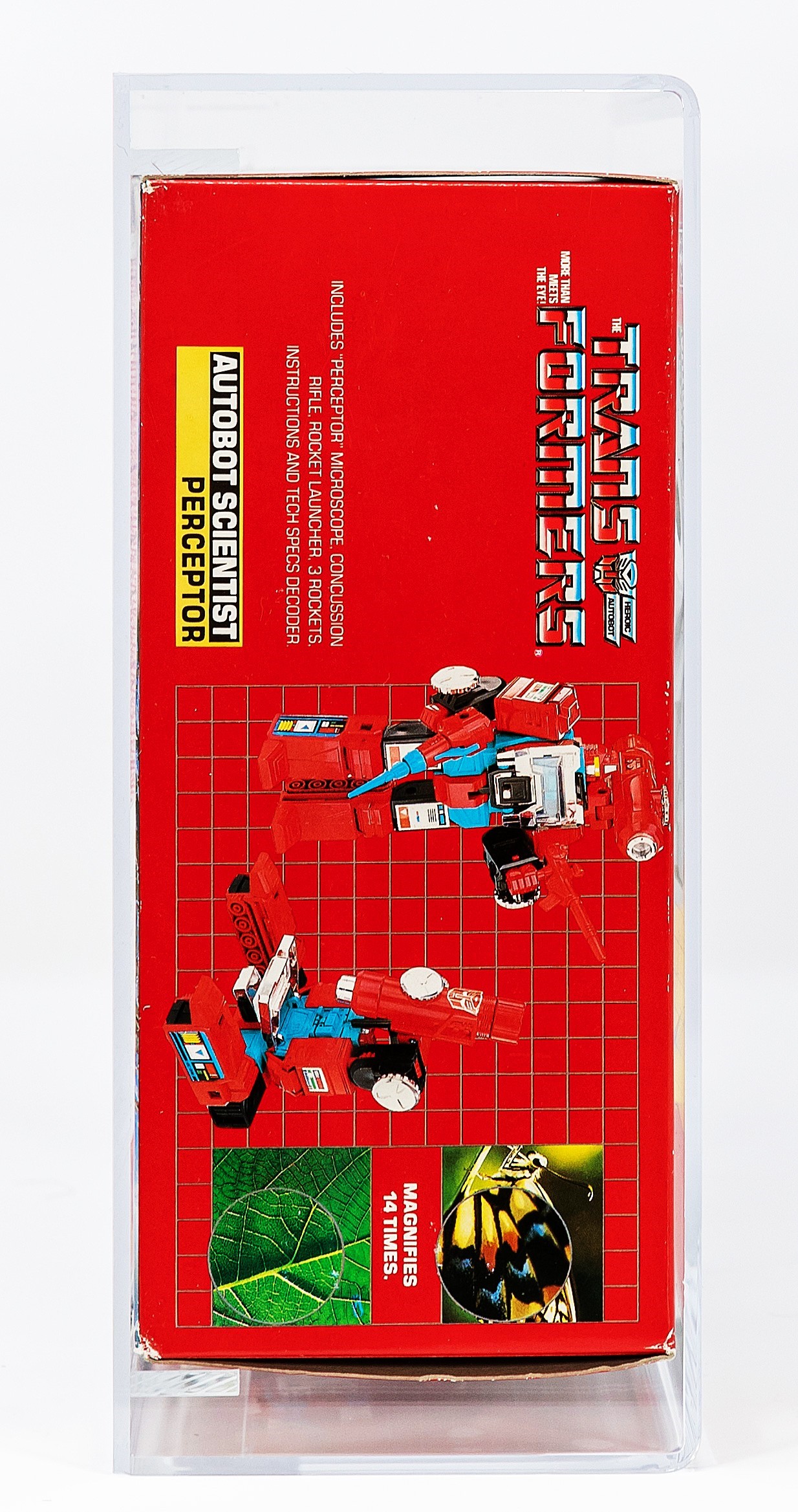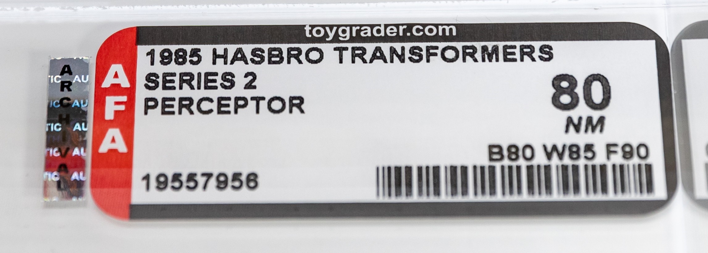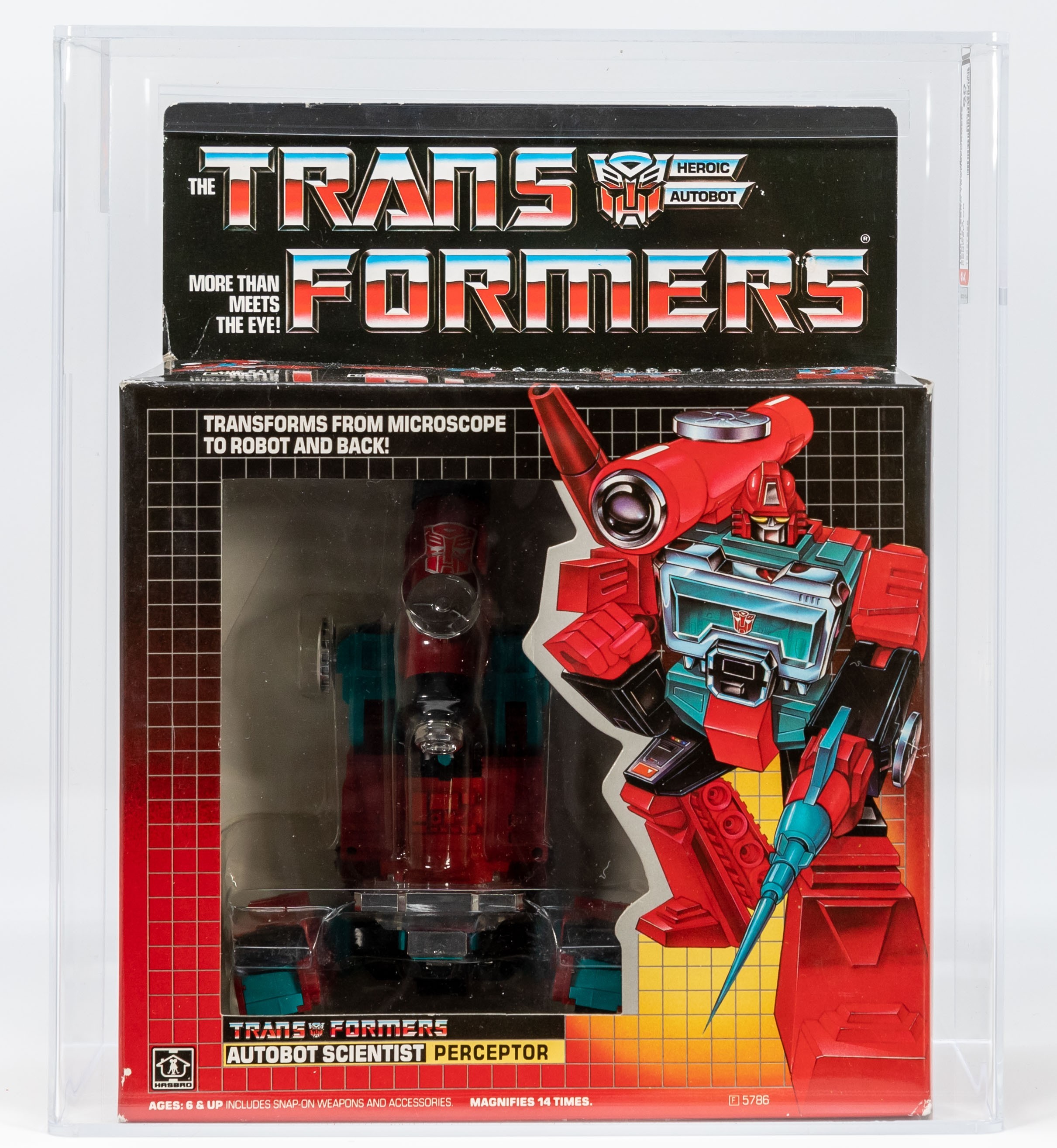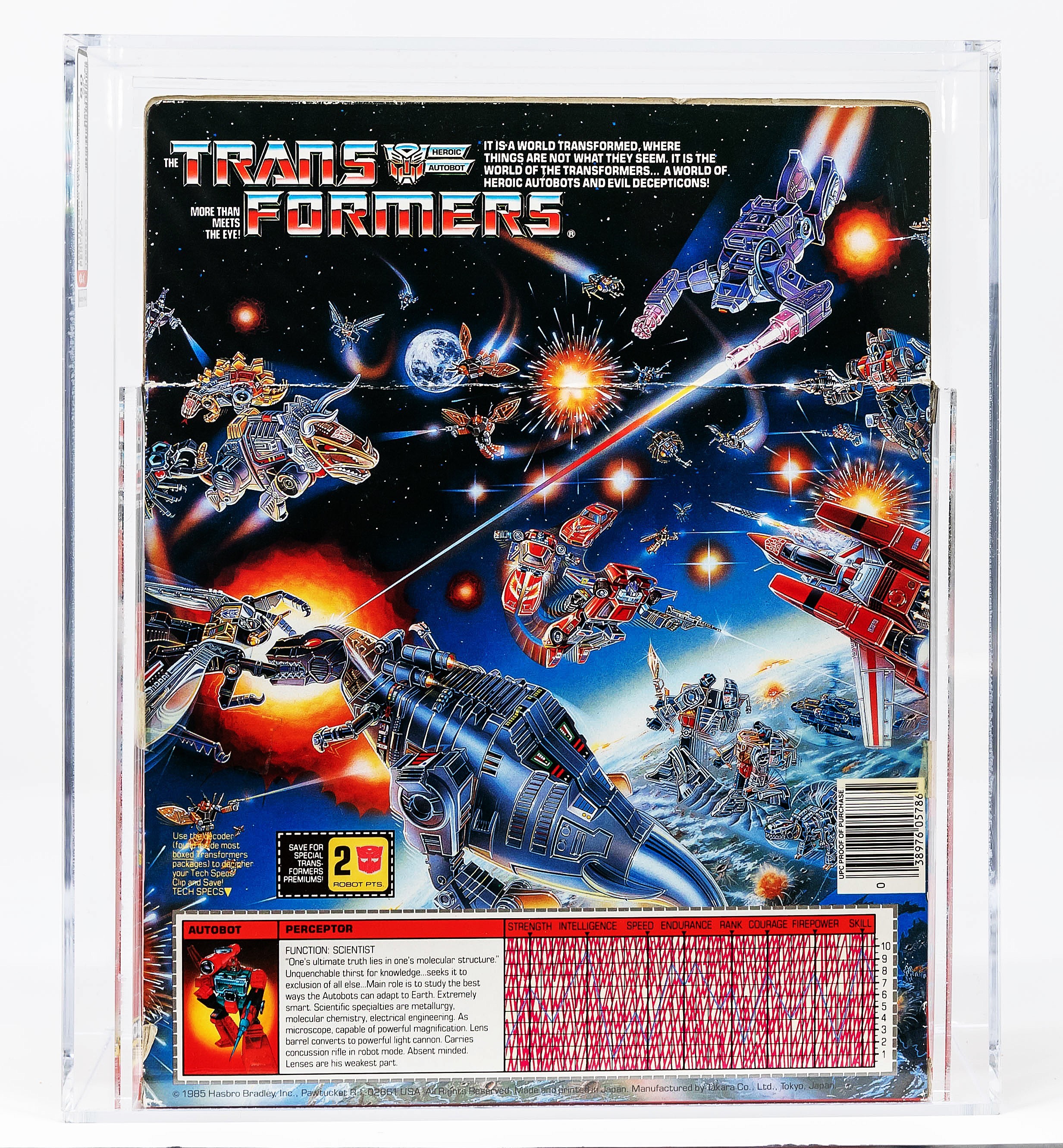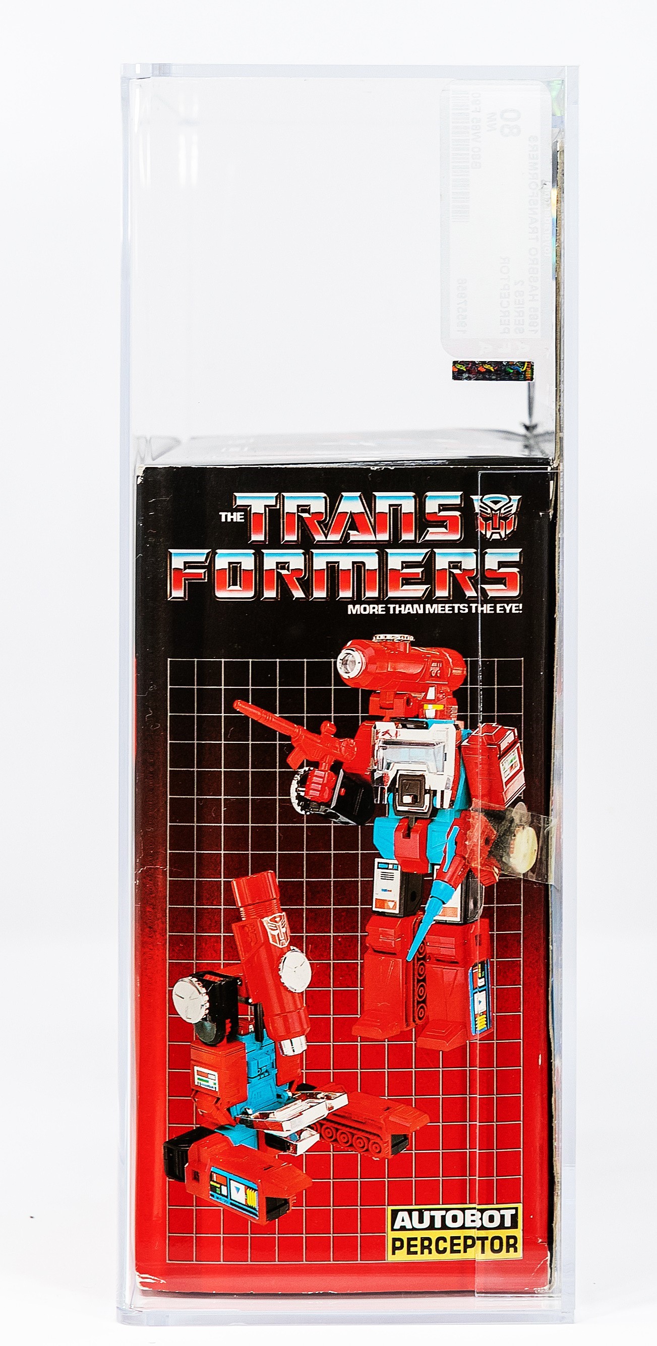 Perceptor is the personal favorite of famed and revered G1 designer, Hideaki Yoke. “Ah, Perceptor here we go…..I kept saying that character was me.” A must-have piece in any G1 collection, and one that highlights the beloved Transformers episode in Netflix’s The Toys That Made Us. This one has no colorbreak whatsoever along the edges and tape is present on both sides but has dried out over time. The reverse looks great but does exhibit the typical G1 flap crease. Bold colors are flawless and vibrant with perfect gloss. Overall, a wonderful example that would make Yoke San very proud. Encapsulated by AFA (80, 80-85-90), #19557956