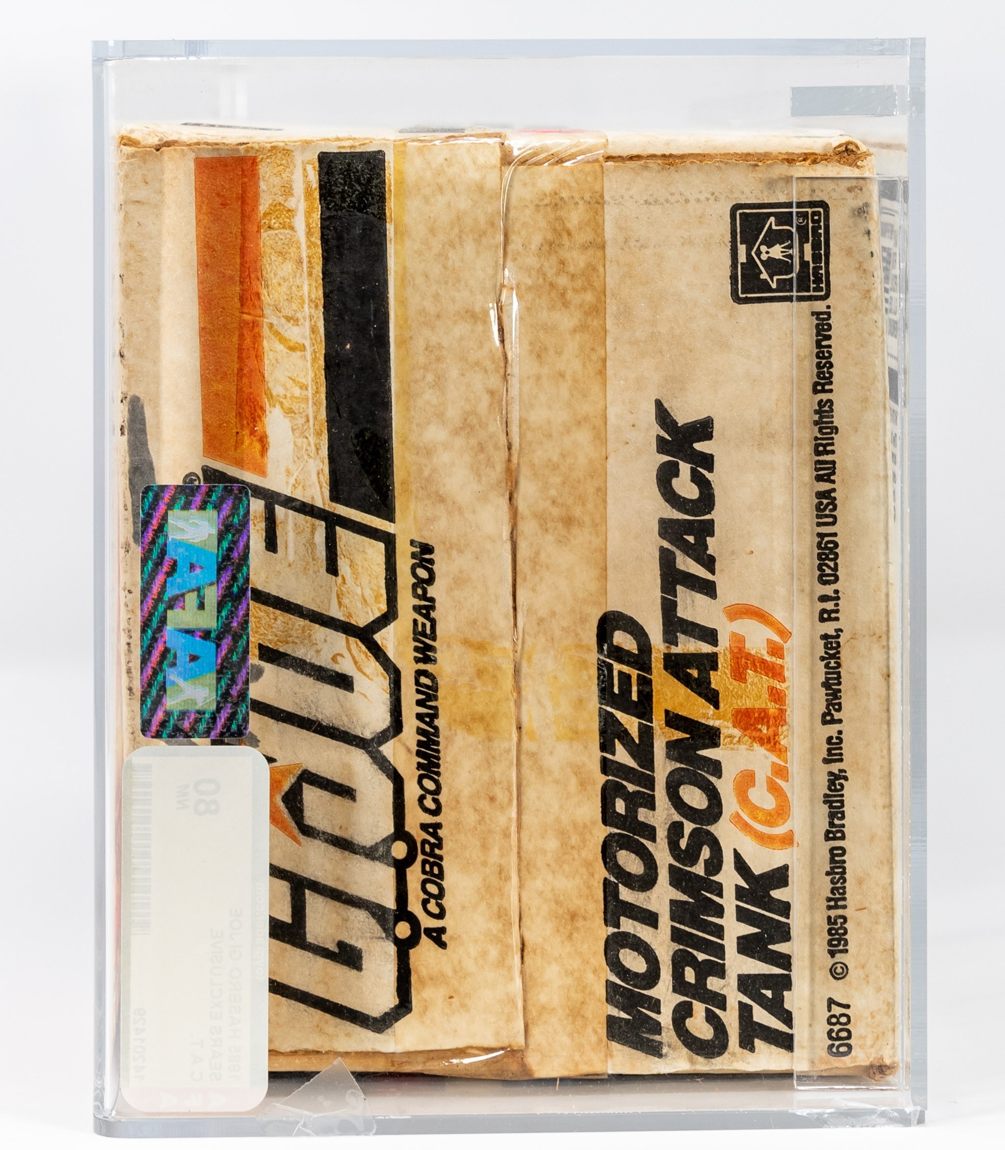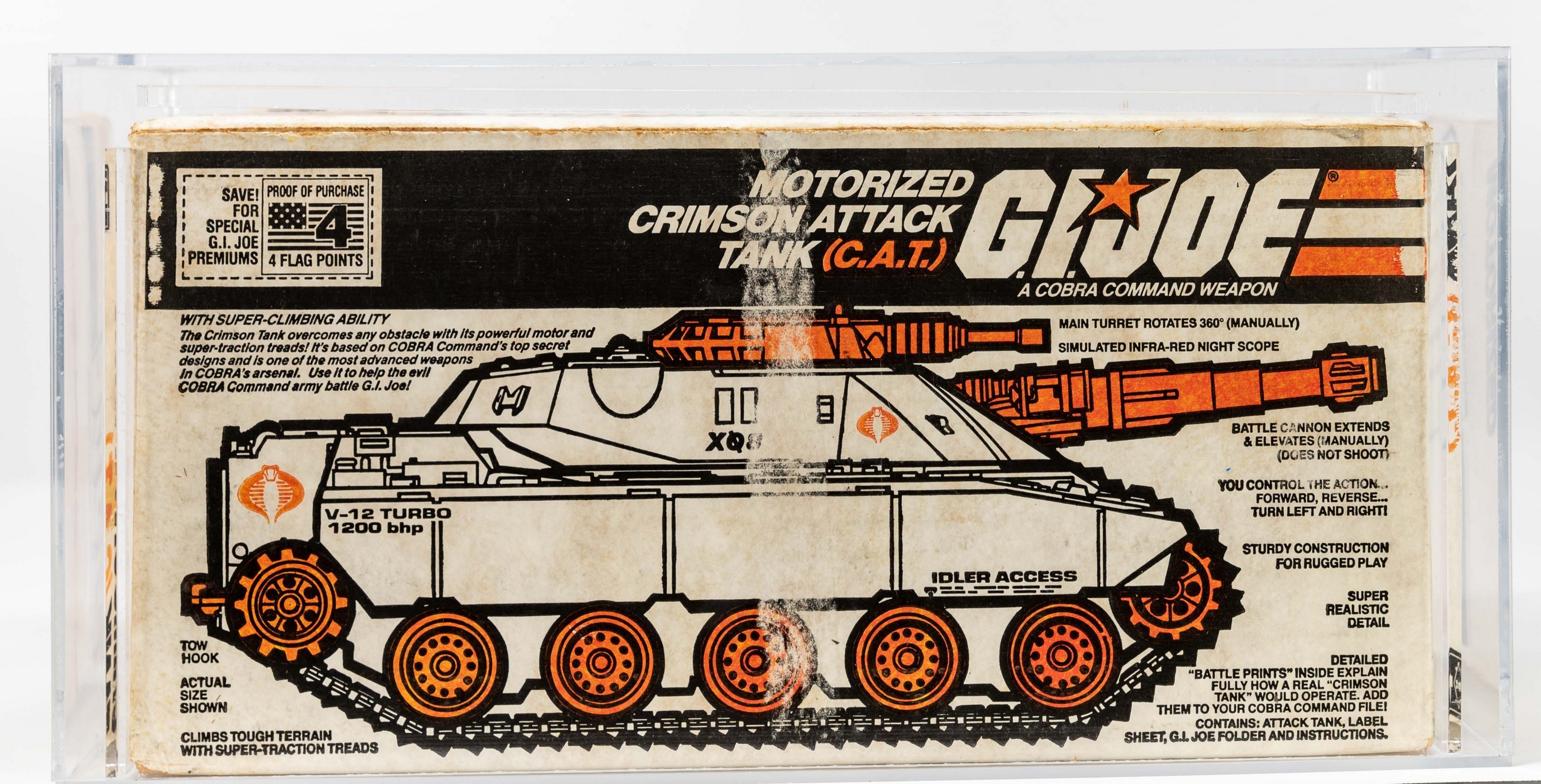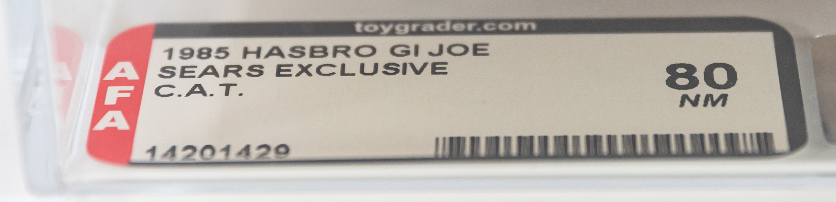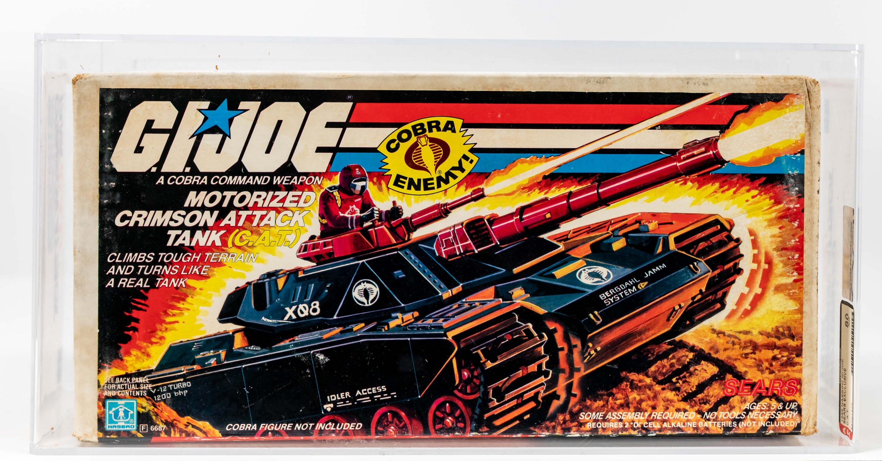 Veteran hobbyists are well aware that Sears Exclusives are amongst the rarest and most coveted G.I. Joe vehicles from the glorious 1980’s.  This magnificent MISB (mint in sealed box) relic finds few challengers for supremacy.  Amazingly factory sealed with original tape still intact, this C.A.T. earned it’s AFA red label.  A truly elite representation for the uncompromising collector.  Encapsulated by AFA (80), #14201429