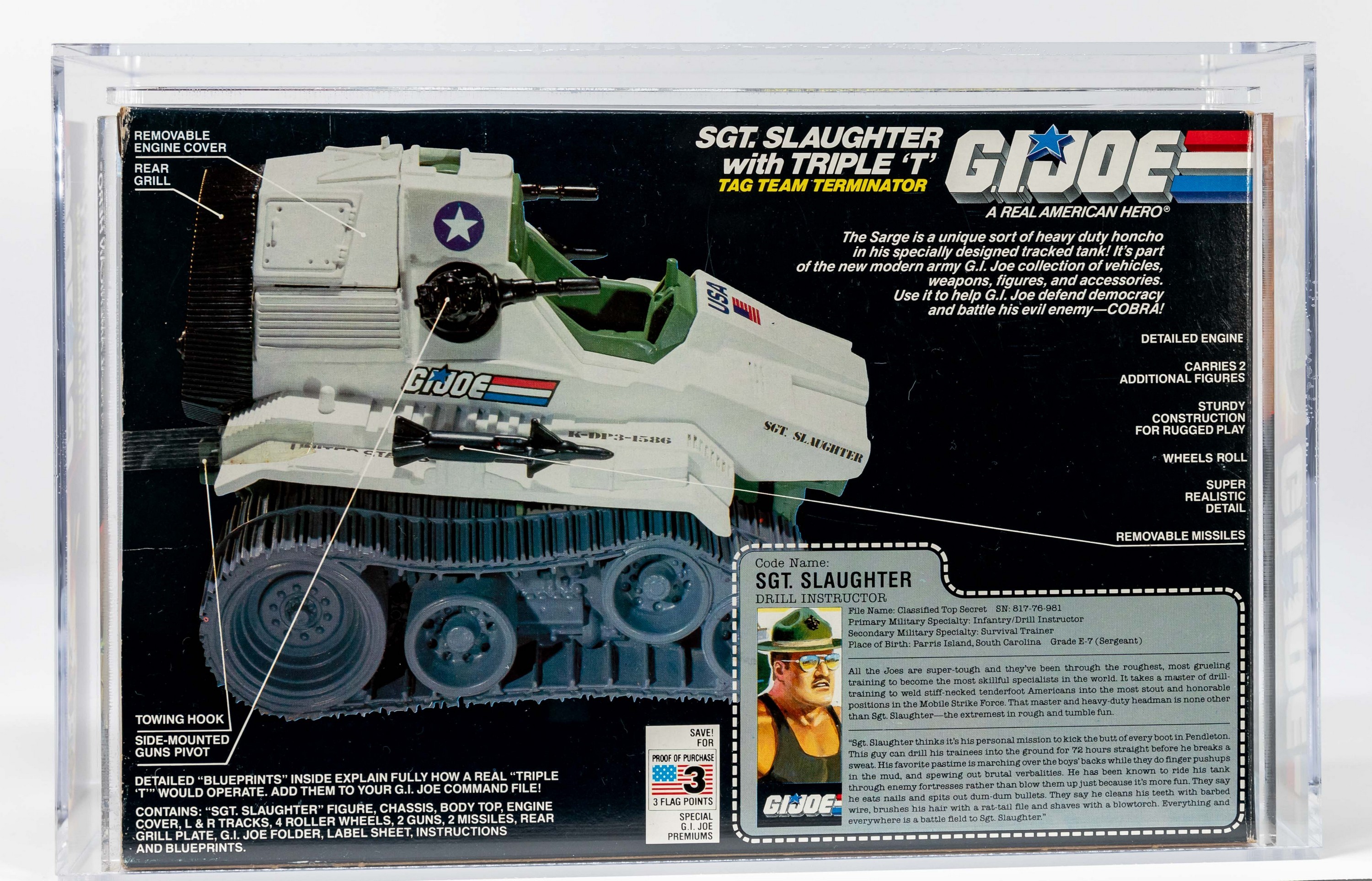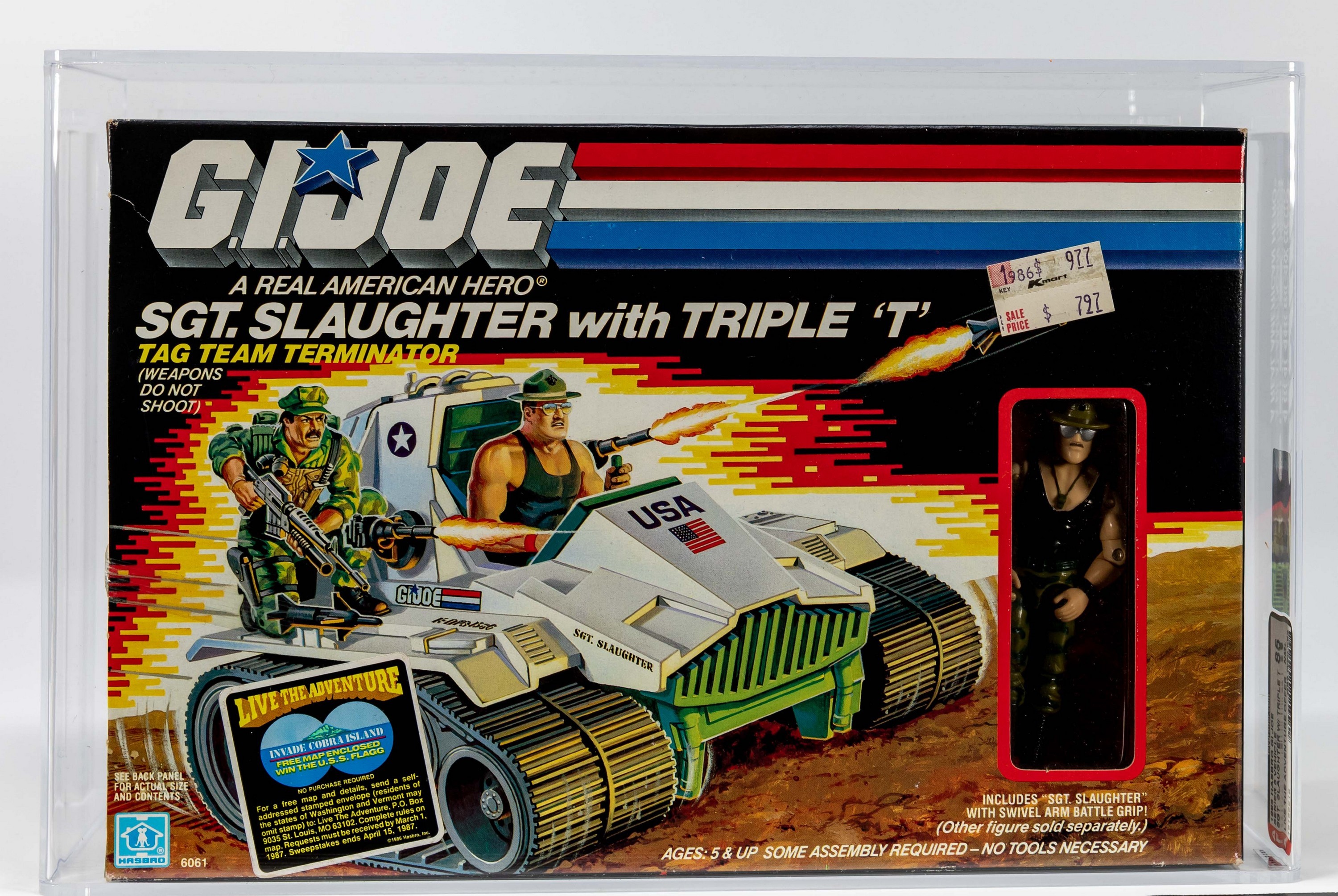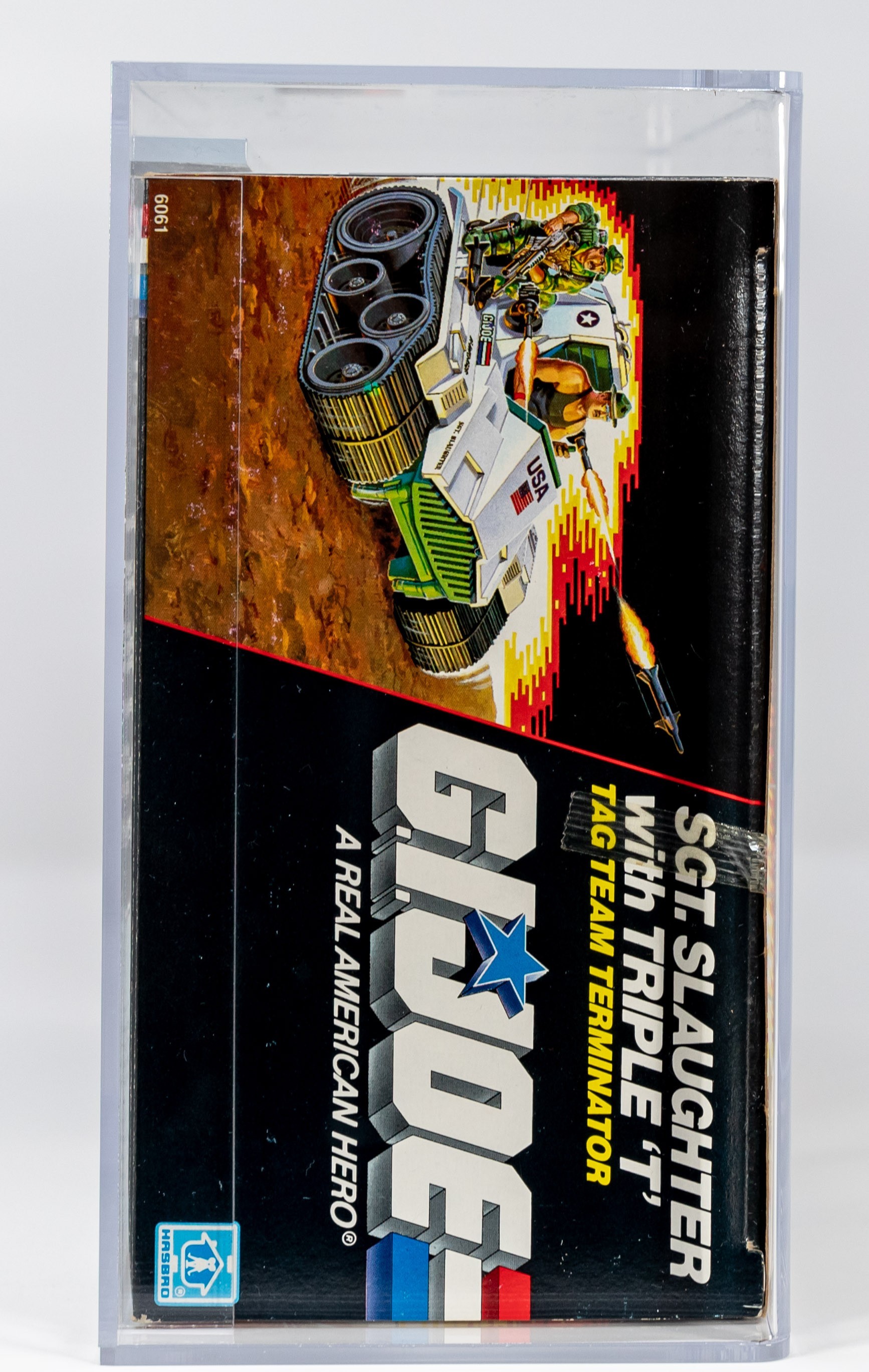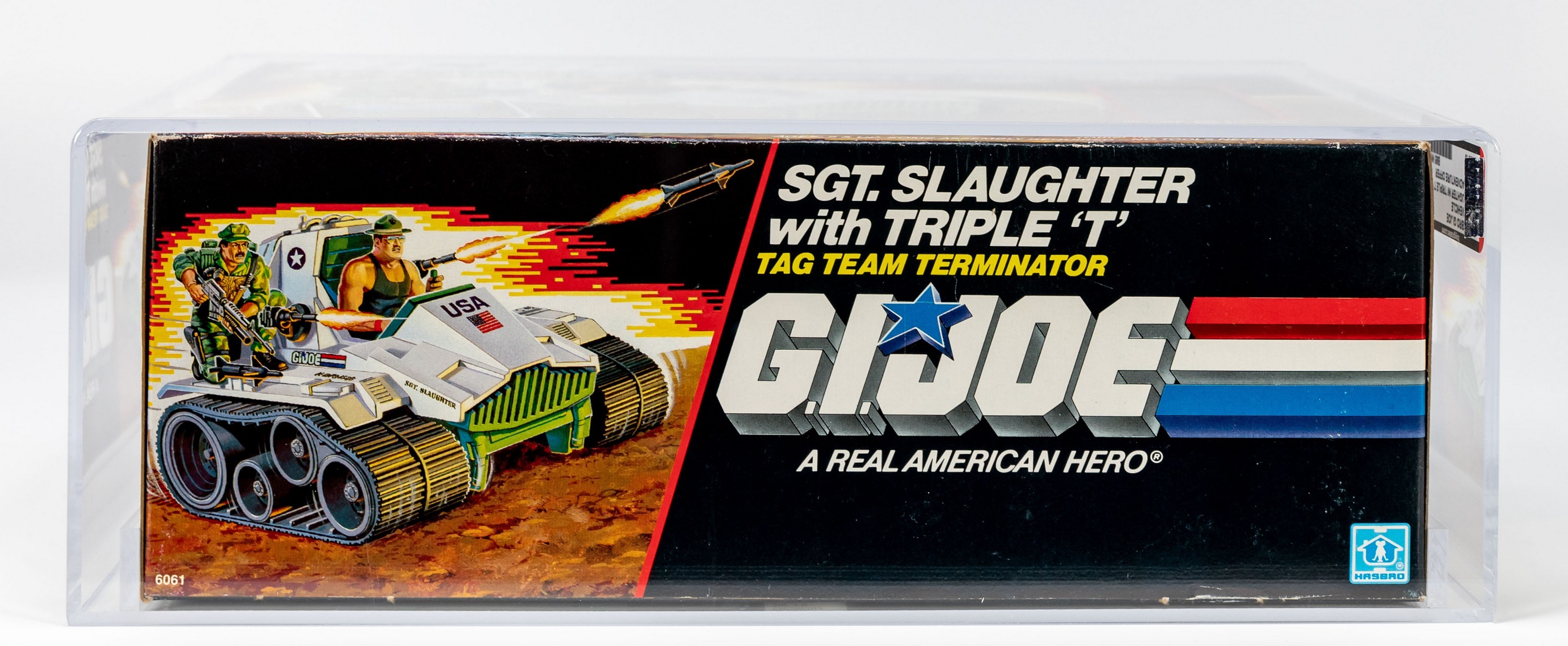 Extremely attractive example of the ideal classic: Sgt. Slaughter with Triple-T. This MISB AFA graded red label is stunning in all respects. Factory tape sealed with brilliant colors, strong corners, and a flawless surface give this one an exclamation point that condition-minded collectors covet. Arguably the last great G.I. Joe action figure released from the iconic 1980’s A Real American Hero line, Sgt. Slaughter’s popularity has survived through the decades. An exceptionally attractive ultra high-grade example of one of G.I. Joe’s most classic releases. Encapsulated by AFA (85, 85-90-85), #18166919