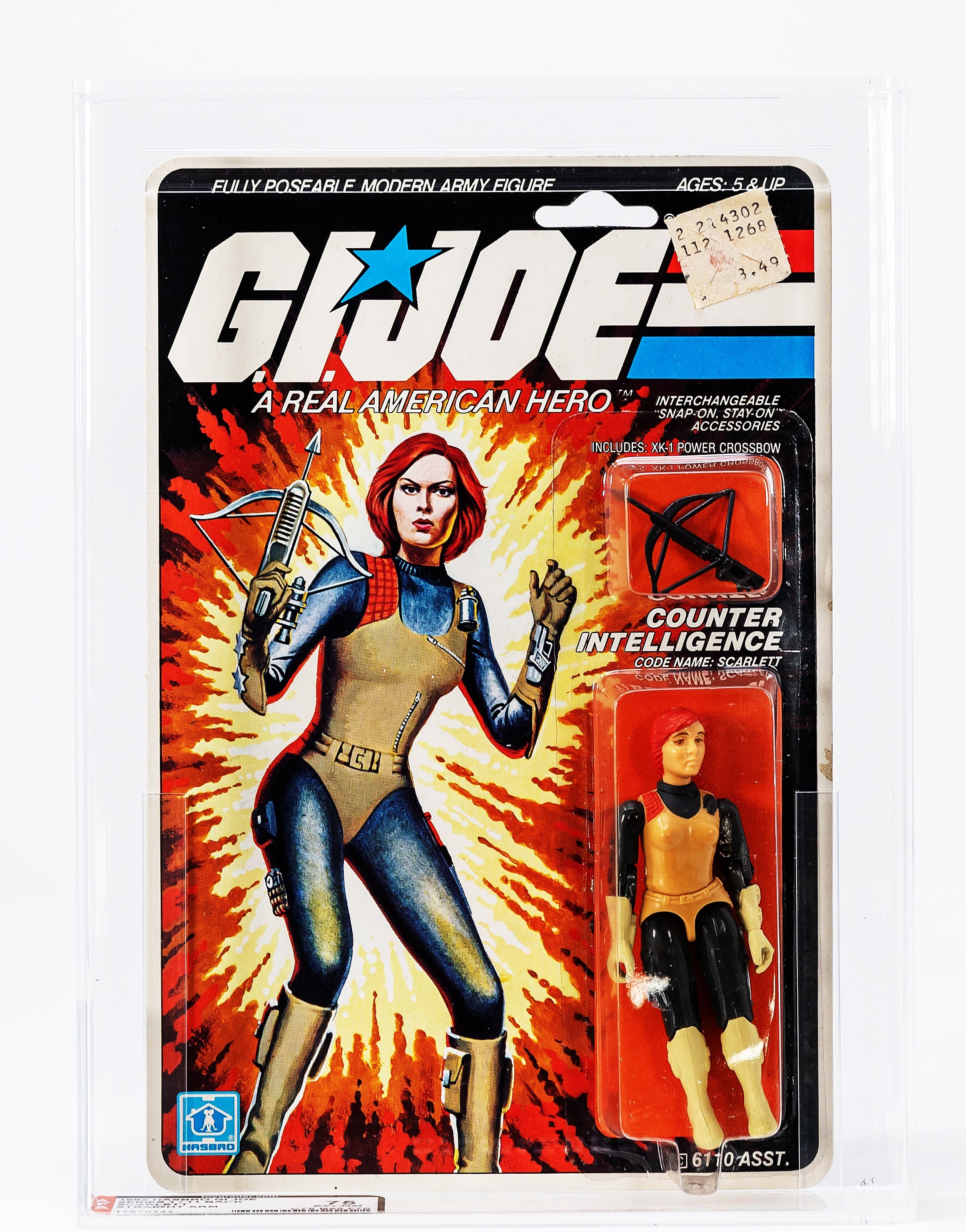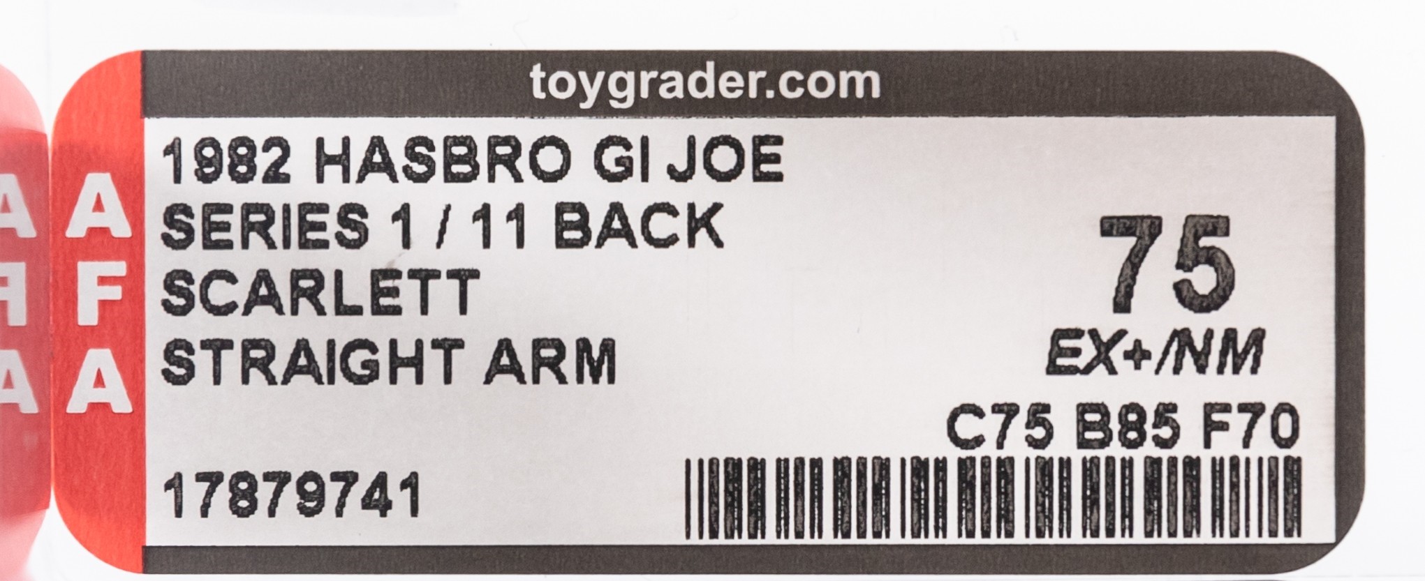 In 1982 G.I. Joe: A Real American Hero burst onto the scene and into toy stores around America with nine carded action figures.  Standing just 3.75-inches tall, there are two figures among the original nine that stand tall: Snake Eyes and Scarlett.  Offered here is the latter.  We are pleased to present this very special piece: a remarkably clean AFA 75 11-back release Scarlett from 1982.  Perfect o-ring and no leg movement whatsoever; bright colors, sharp registration, and clear bubble supply spectacular visual strength, making this a particularly attractive specimen. Encapsulated by AFA (75, 75-85-70), #17879741