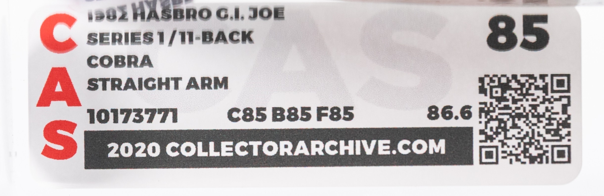 One of the two original carded Cobra figures.  This is the Series One release on 11-back card and is the earliest straight arm version.  Outstanding condition.  A bit of leg movement on the figure itself as is common with Series One.  A superb high-grade example of a landmark figure.  Encapsulated by CAS (85, 85-85-85), #10173771