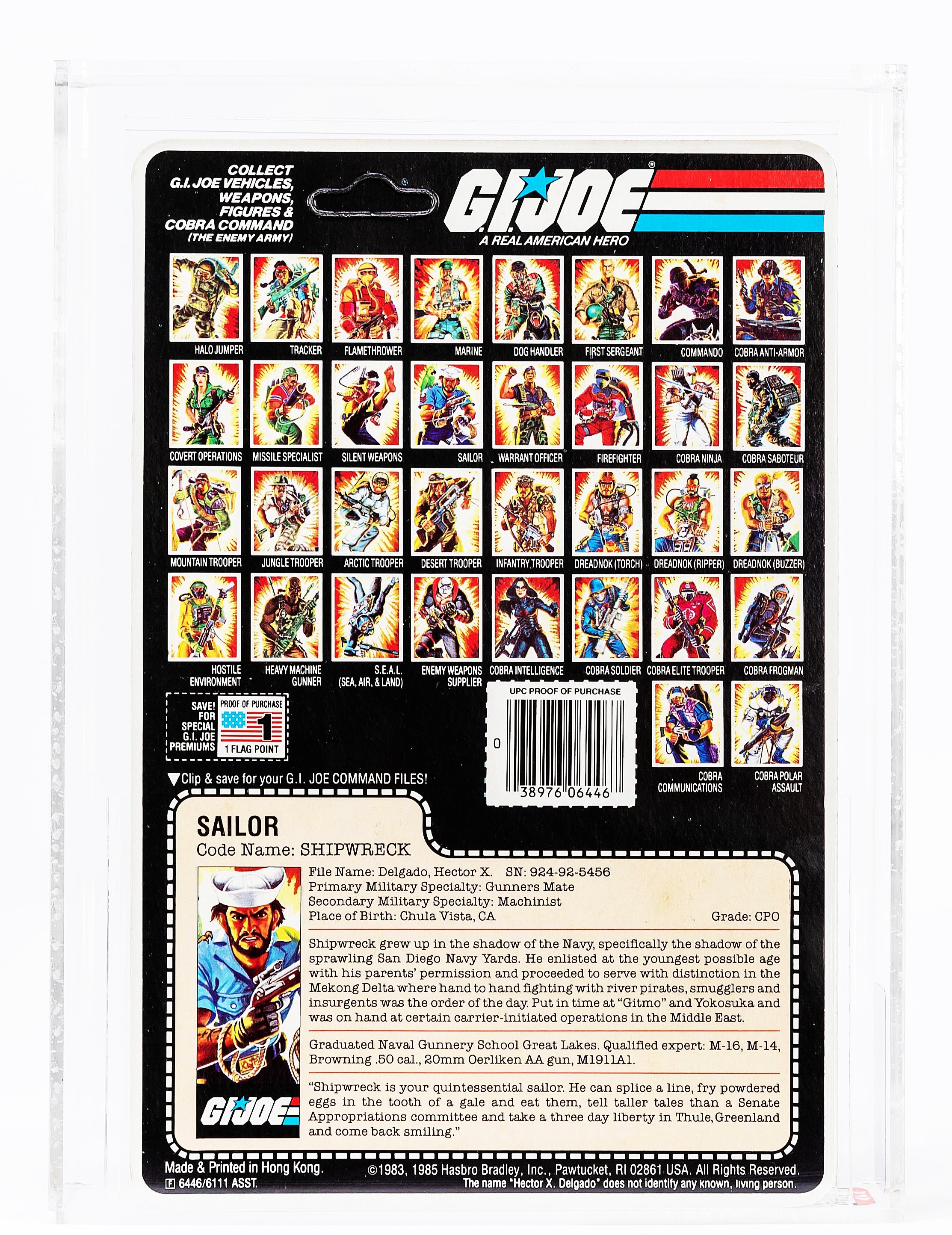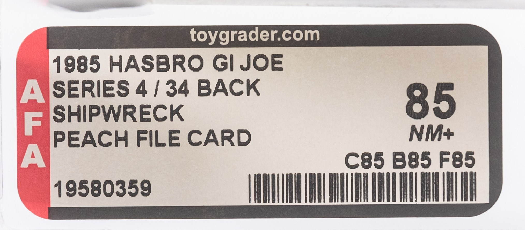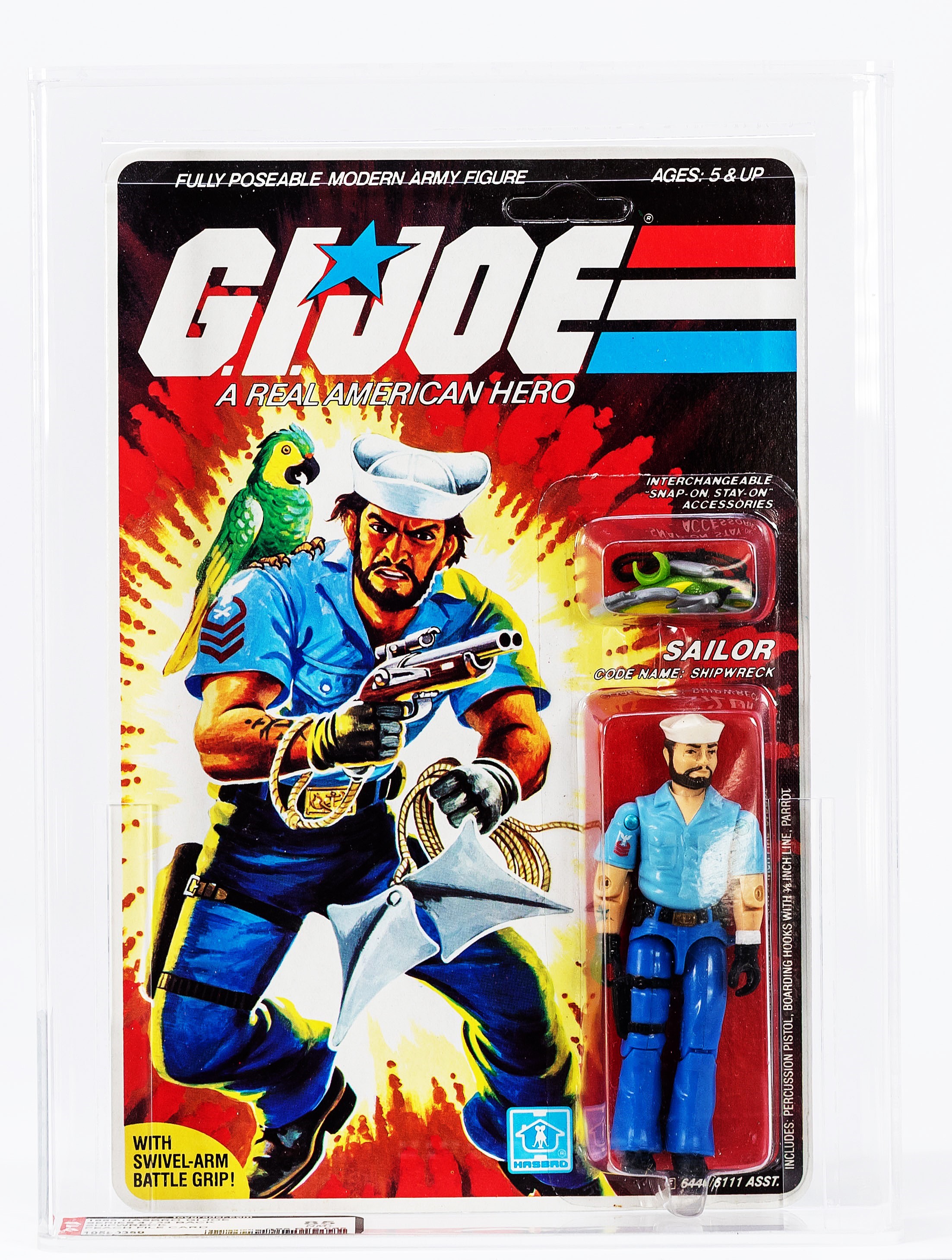 Presented is the earliest version of the beloved character, Shipwreck. This Series Four example is unpunched with perfect o-ring and no leg movement whatsoever. Veteran collectors know just how difficult it is to find the peach card version in this high-grade. We expect lots of action on this lot as many will to look to upgrade. Encapsulated by AFA (85, 85-85-85), #19580359