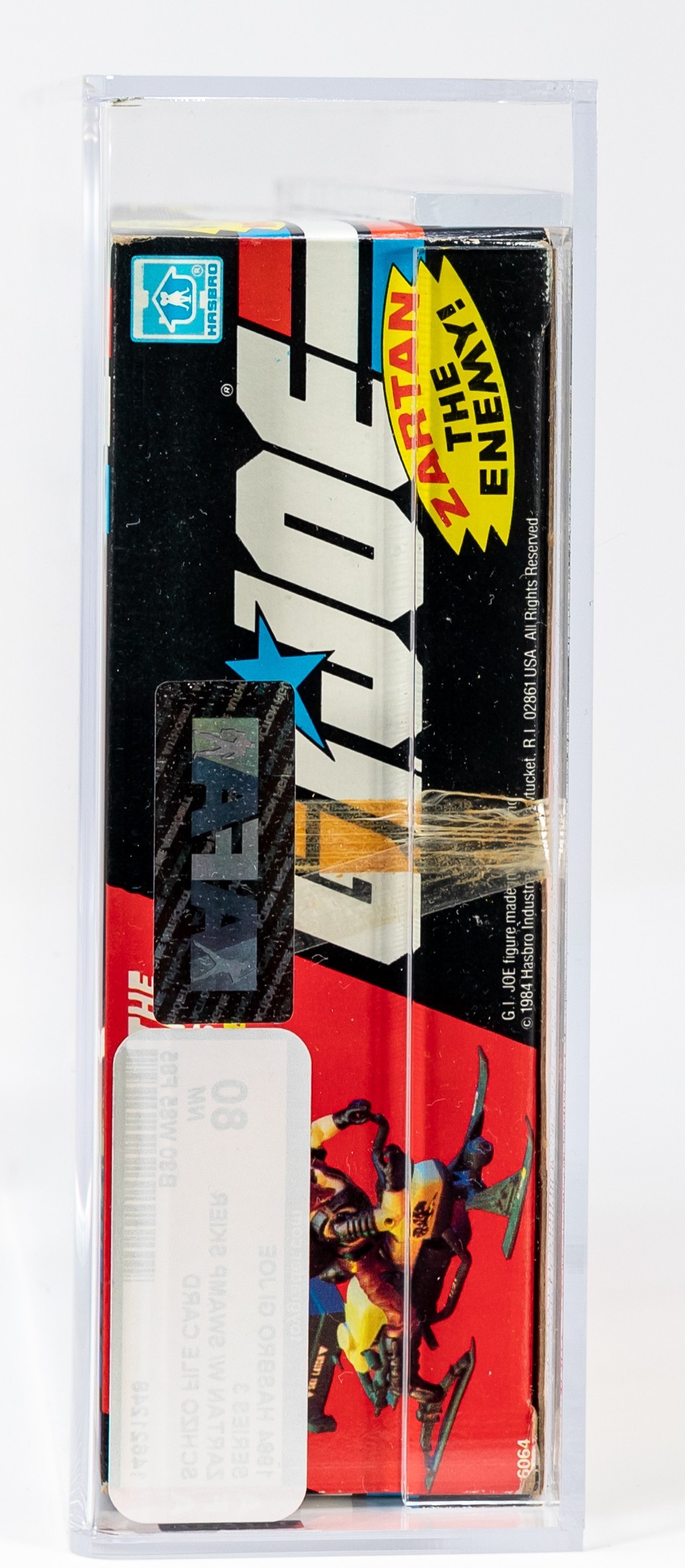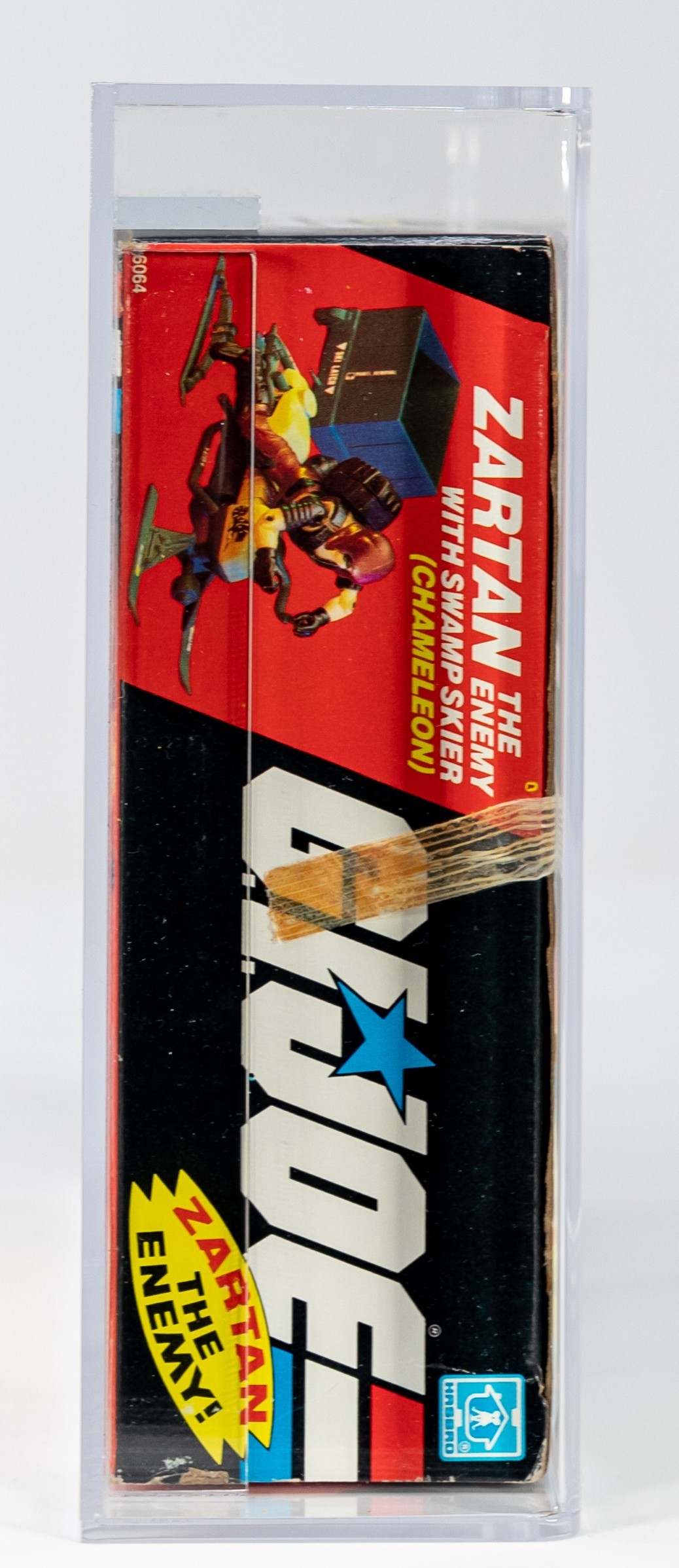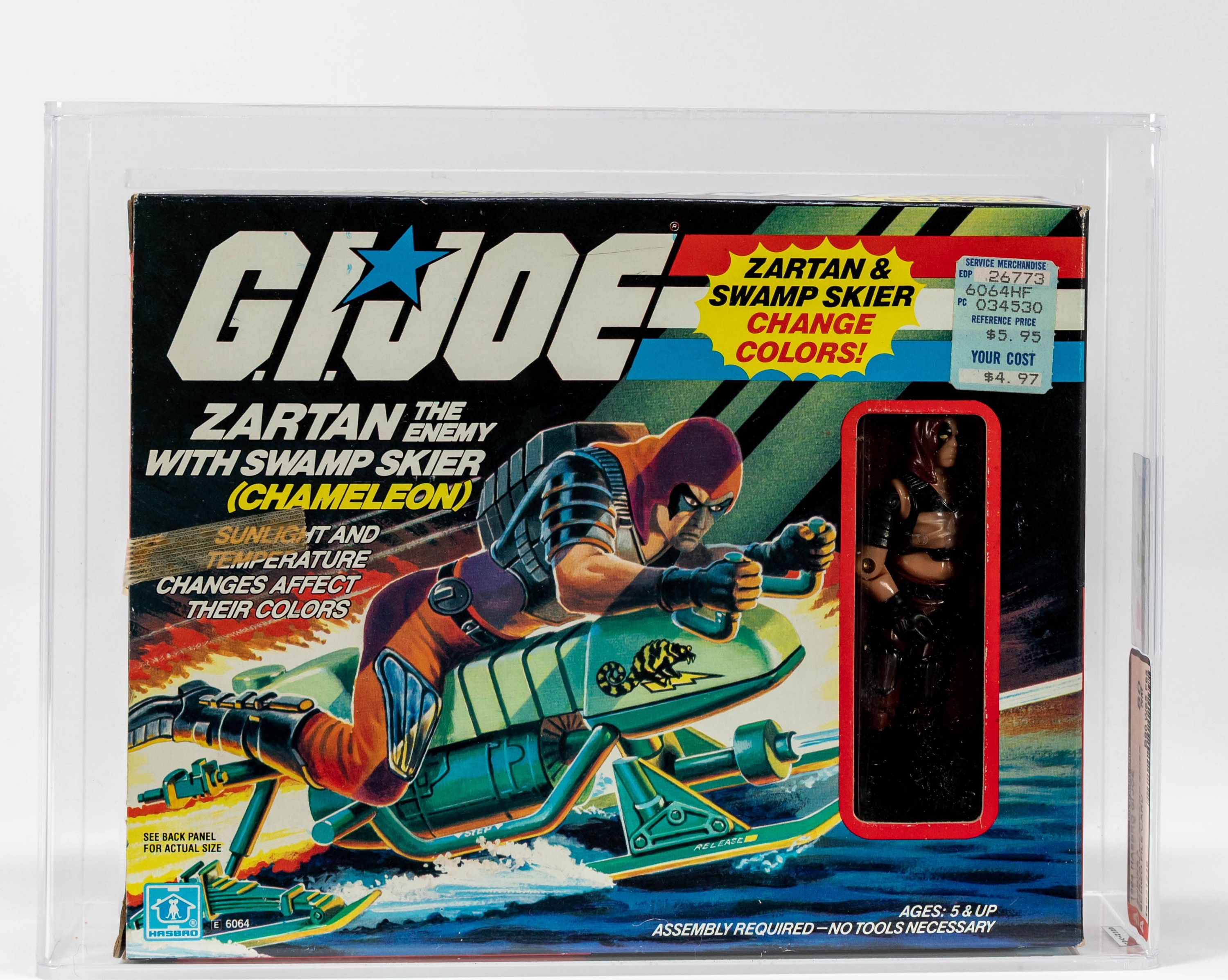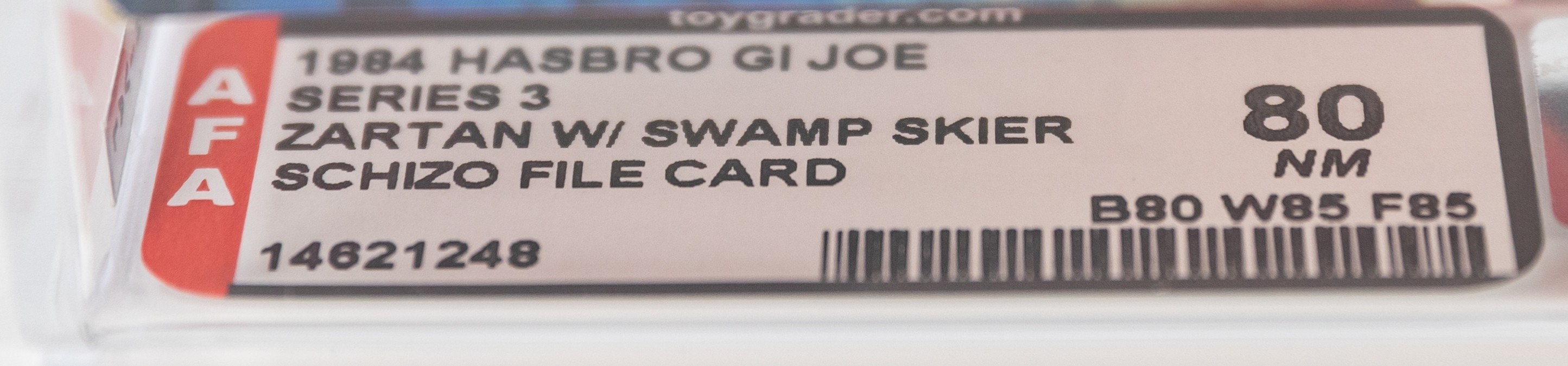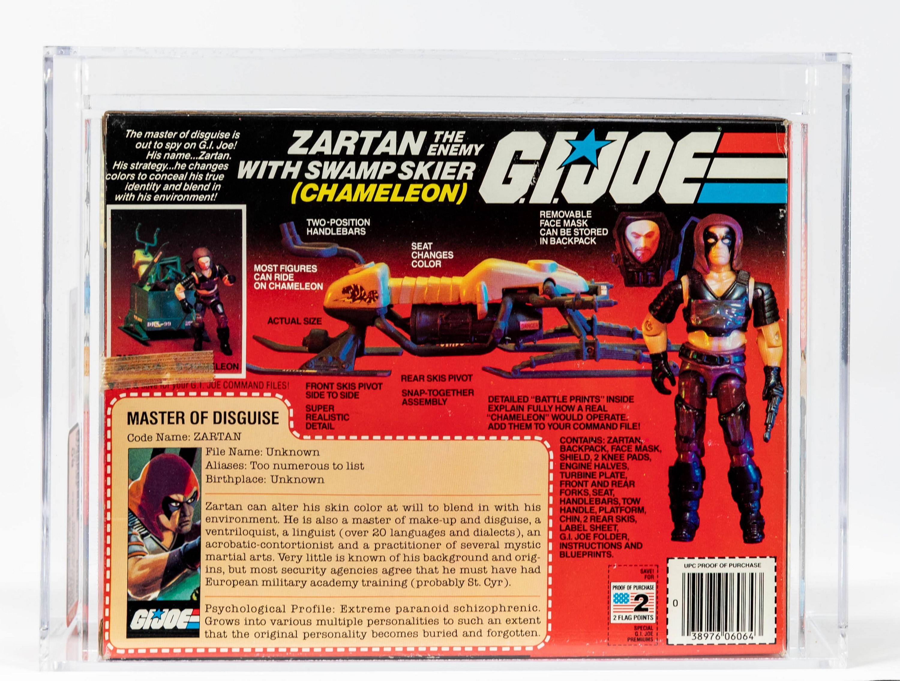 Highly collectible vehicle/figure combo from Series Three: Zartan with Swamp Skier. This is the Schizo File Card version. A desirable piece that would make a worthy addition to any vintage collection. Encapsulated by AFA (80, 80-85-85), #14621248