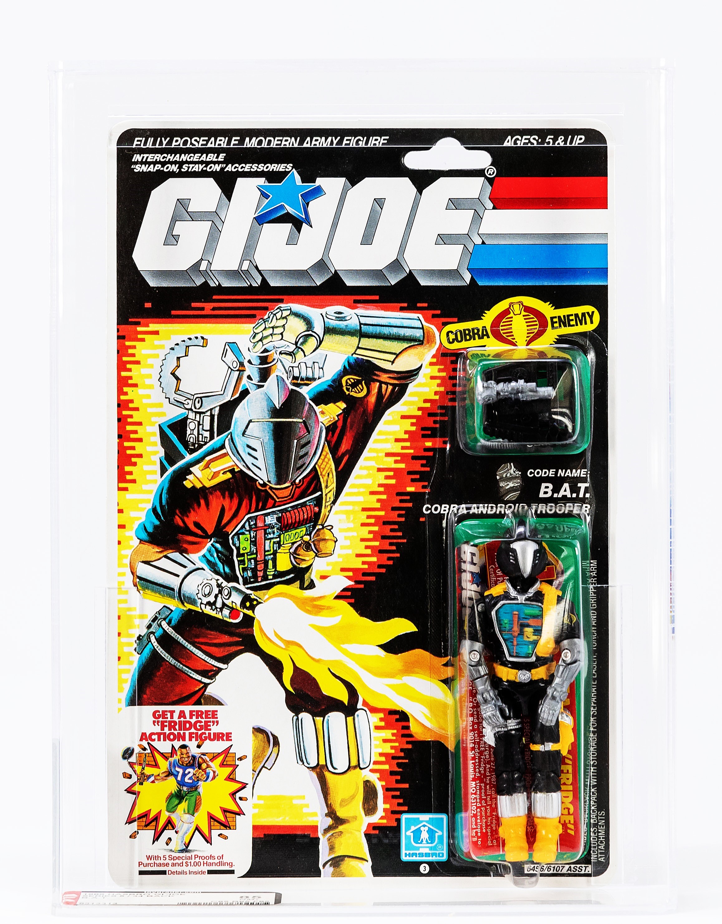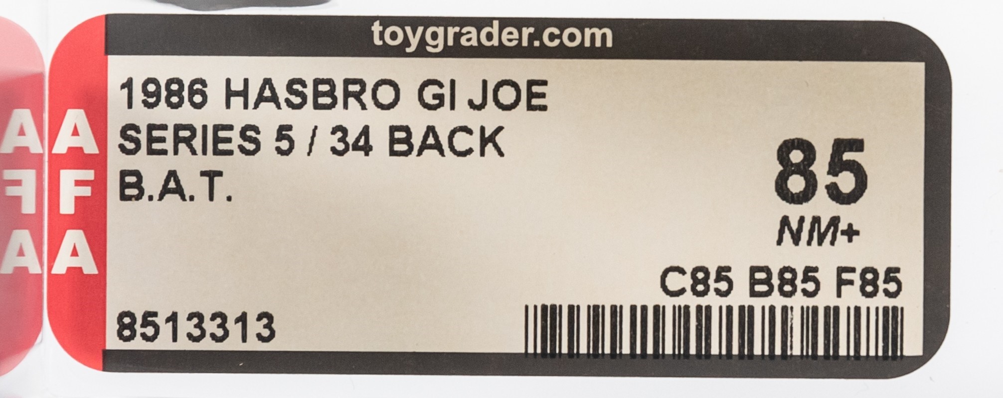 The most collectible carded figure from Series Five: B.A.T.S. This one has enjoyed a huge jump in value over the last 12 months. Presented is the finest example we have ever seen. An absolutely gorgeous figure with crystal clear bubble, you will be hard pressed to find a carded figure more beautiful than this one. A perfect o-ring and no leg movement whatsoever round out this picturesque example – and we are not done yet. This is the ultra rare variant B.A.T. (instead of the general release B.A.T.S.). An extremely rare and striking example of this important and fascinating figure. Encapsulated by AFA (85, 85-85-85), #8513313