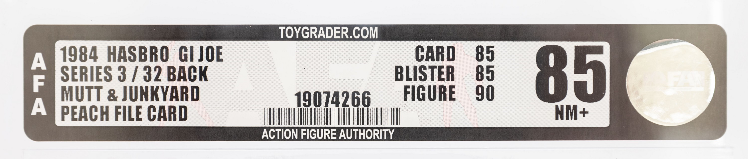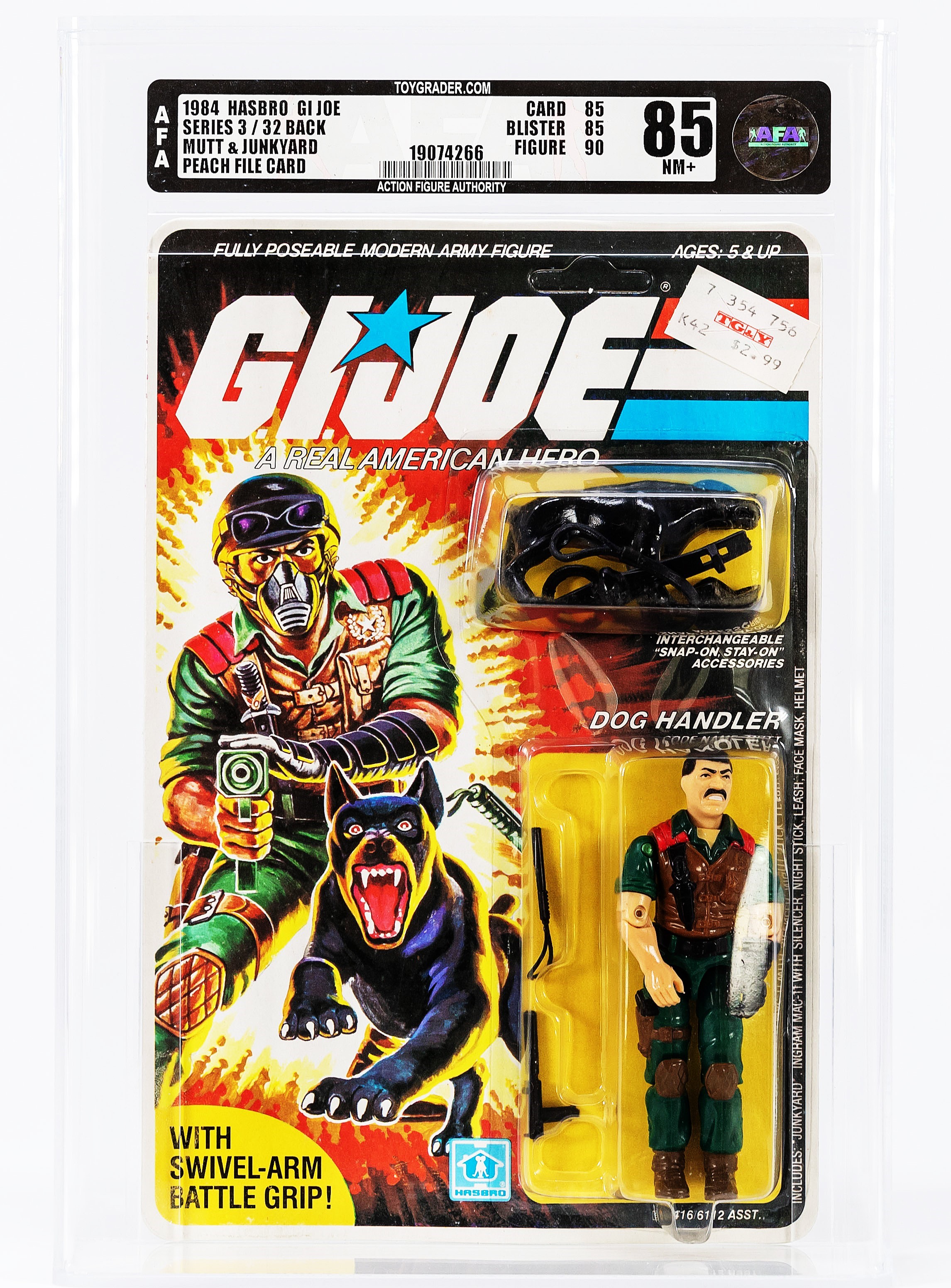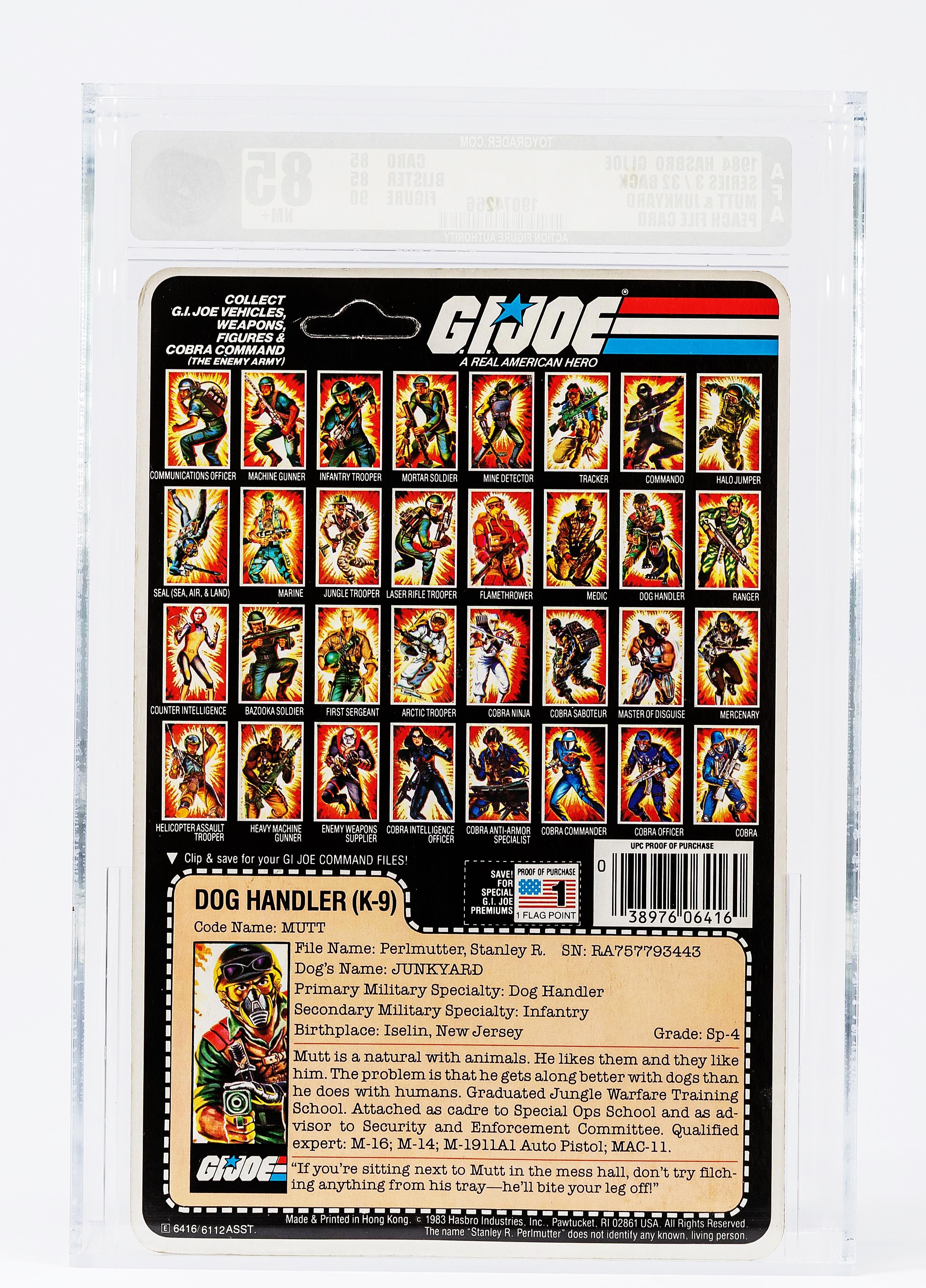 Generally one of the more underrated carded figures in the ARAH line, Series Three Mutt & Junkyard is one that has gained the respect of veteran collectors. Presented is the finest example we have ever seen. Unpunched, an absolutely gorgeous figure with crystal clear bubble, you will be hard pressed to find an example superior to this one. A perfect o-ring and no leg movement whatsoever round out this stunner. Whether upgrading or adding, we believe this piece will be of special interest to advanced G.I. Joe collectors. Encapsulated by AFA (85, 85-85-90), #19074266