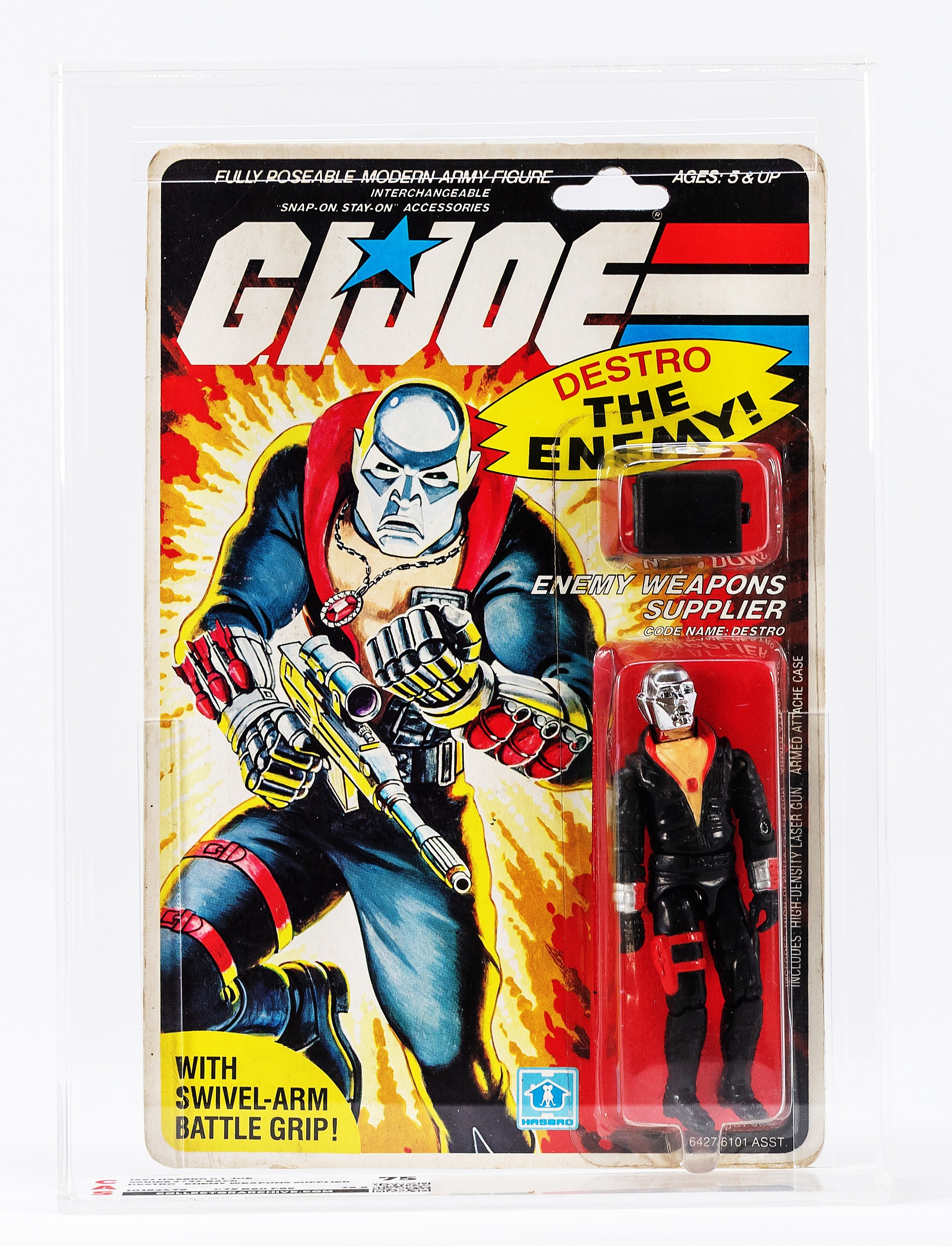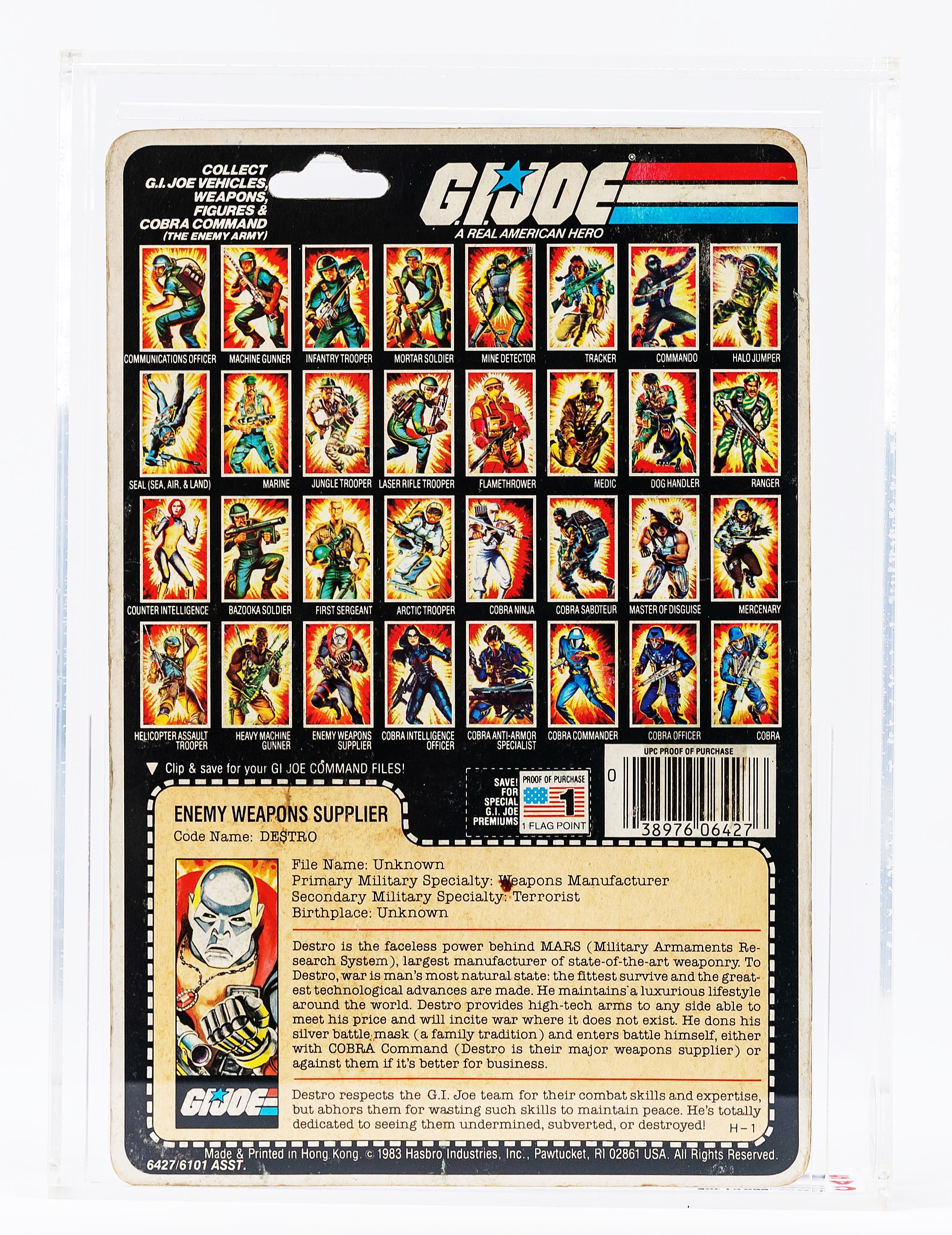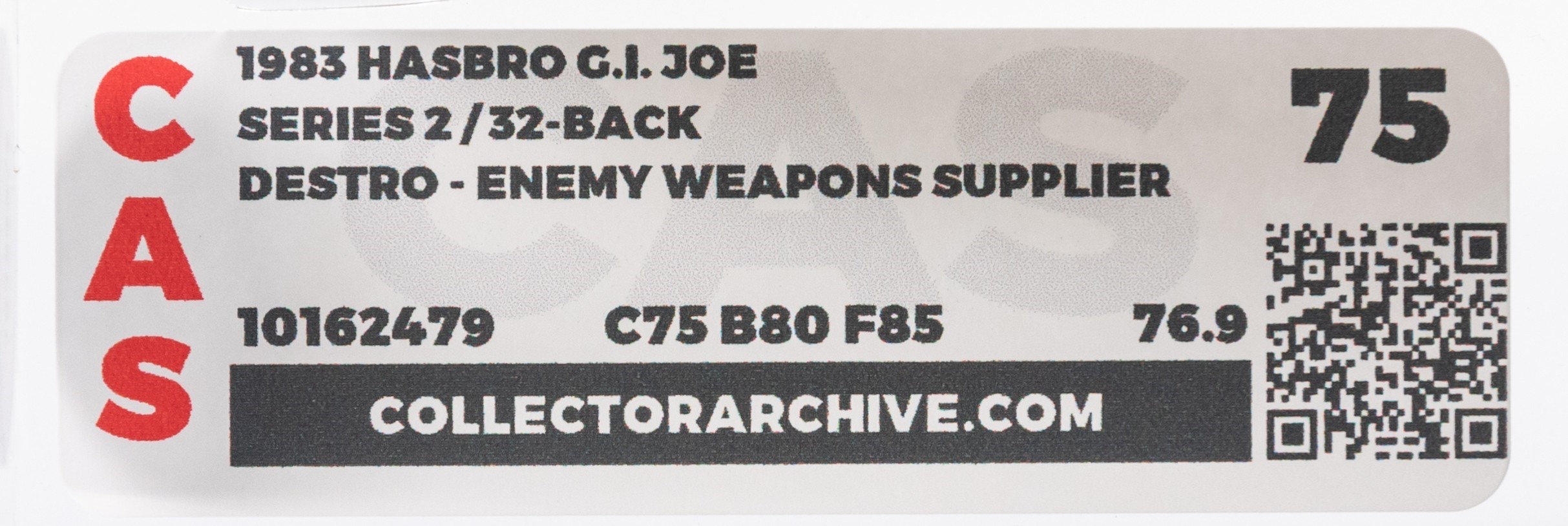 One of the most popular and desirable carded figures in the ARAH line: Destro. This is the 32-back peach file card version. Our example sports a perfect o-ring and has no leg movement whatsoever. A great opportunity to add a classic figure. Encapsulated by CAS (75, 75-80-85), #10162479