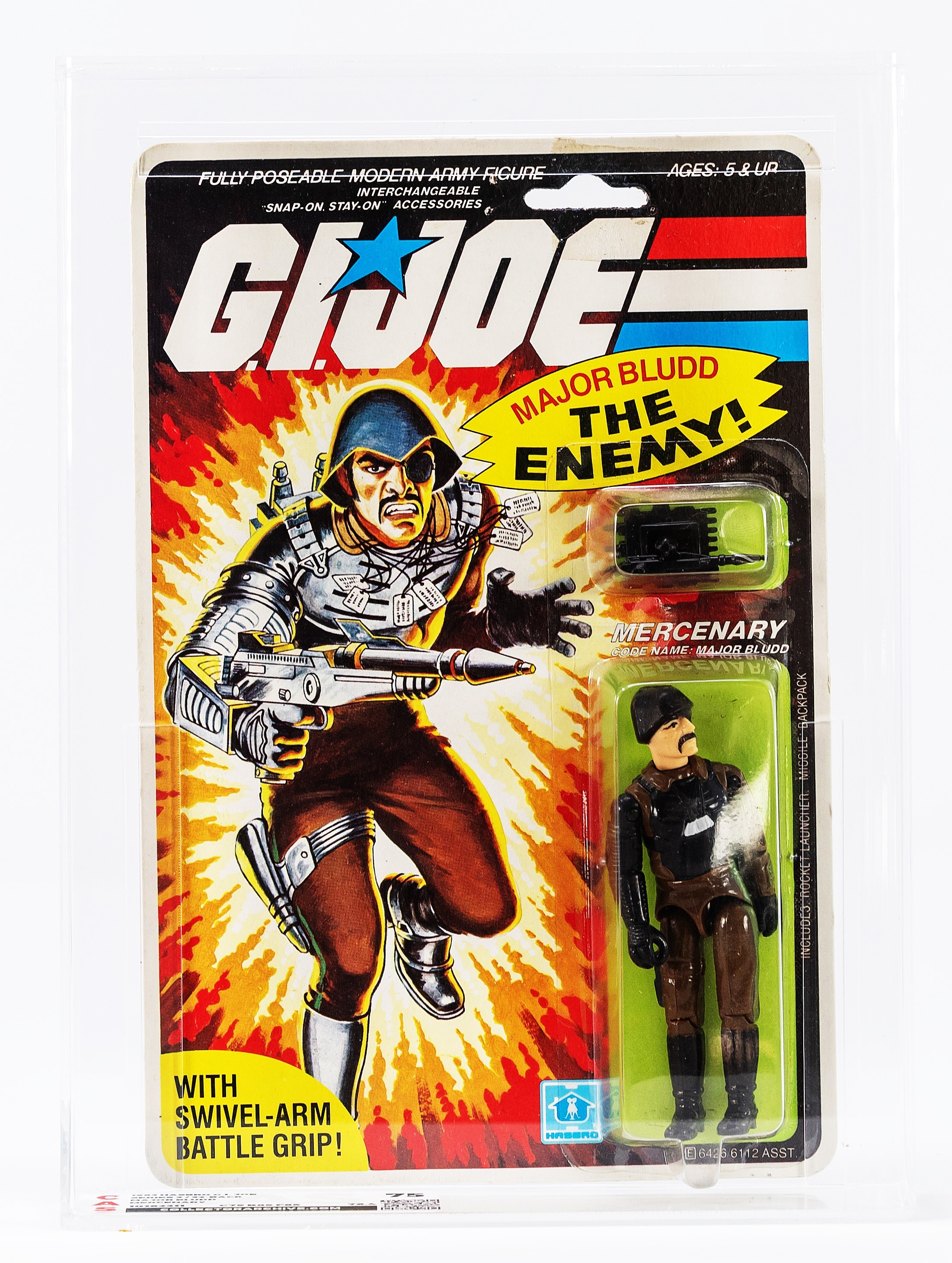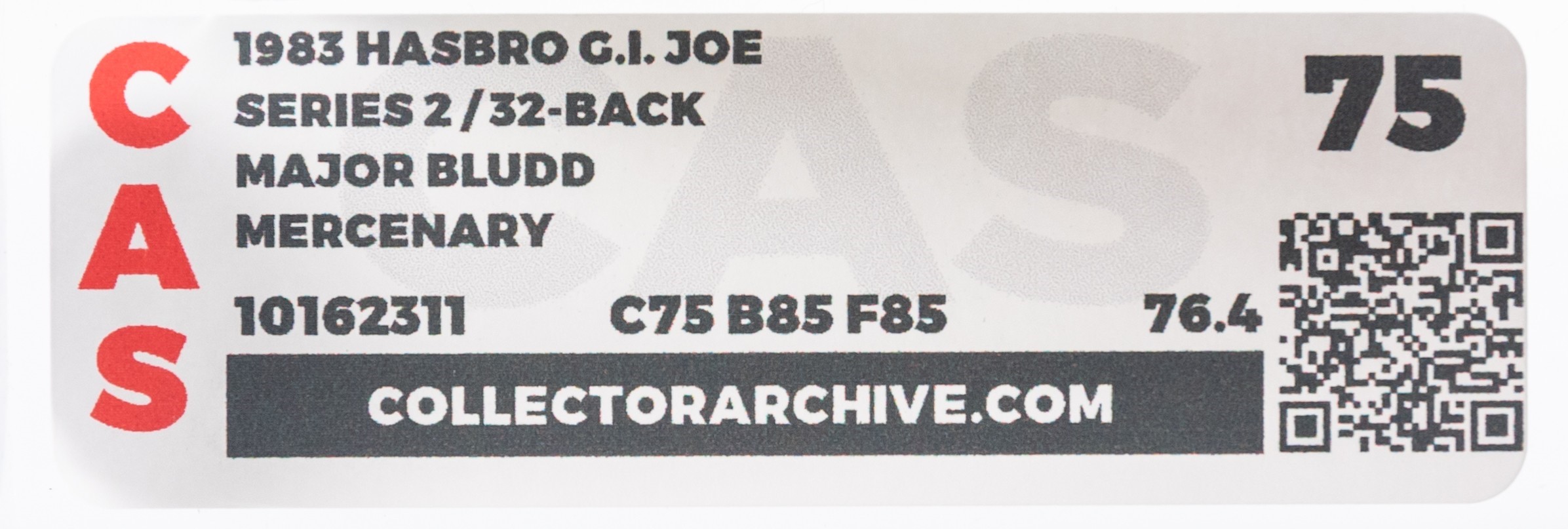 One of the most popular and desirable carded figures in the ARAH line: Major Bludd. This is the 32-back peach file card version. Our example sports a perfect o-ring and has no leg movement whatsoever. Major Bludd is one that is extremely difficult to find without loose legs. A great opportunity to add a classic figure. Encapsulated by CAS (75, 75-85-85), #10162311
