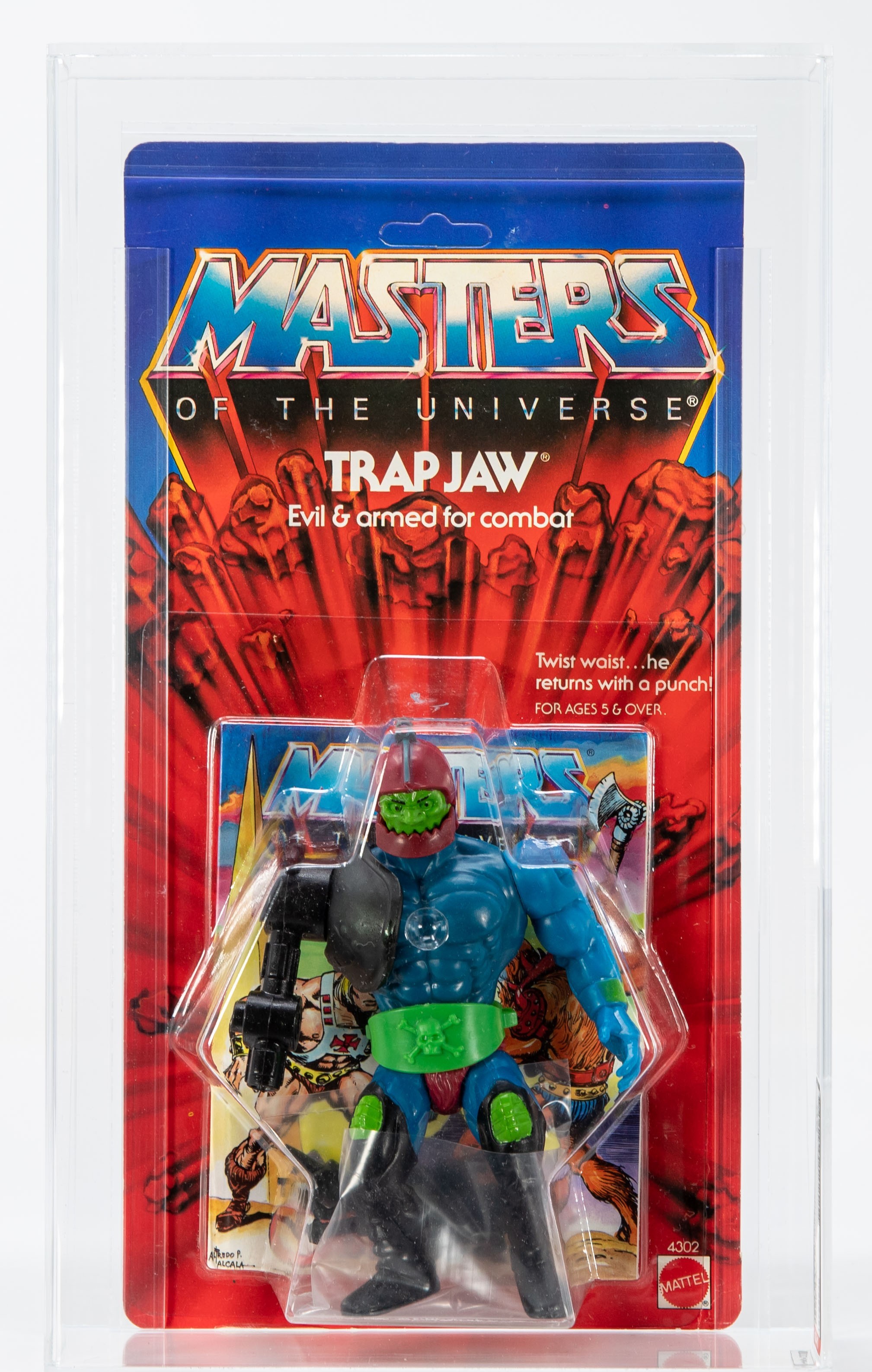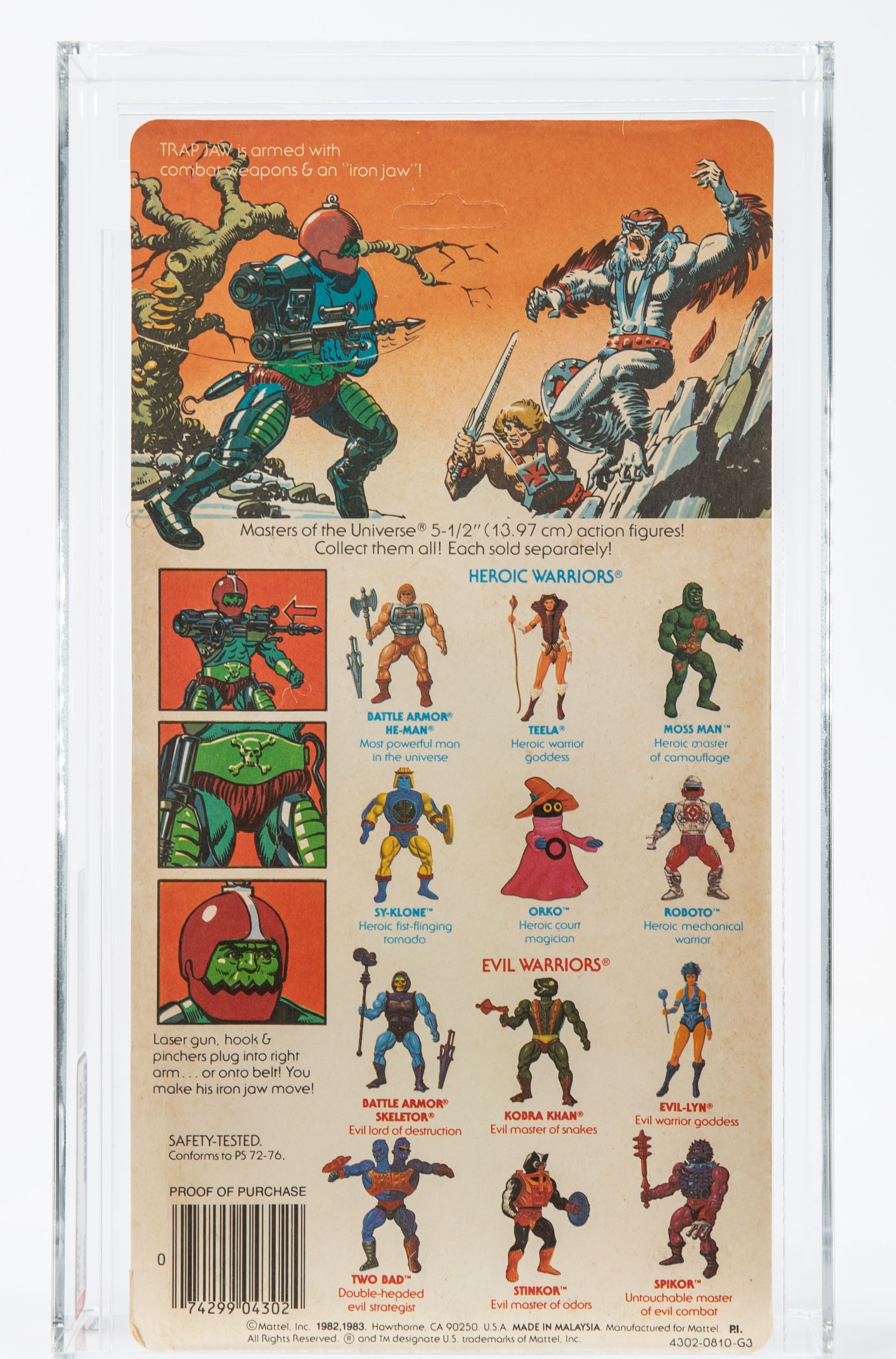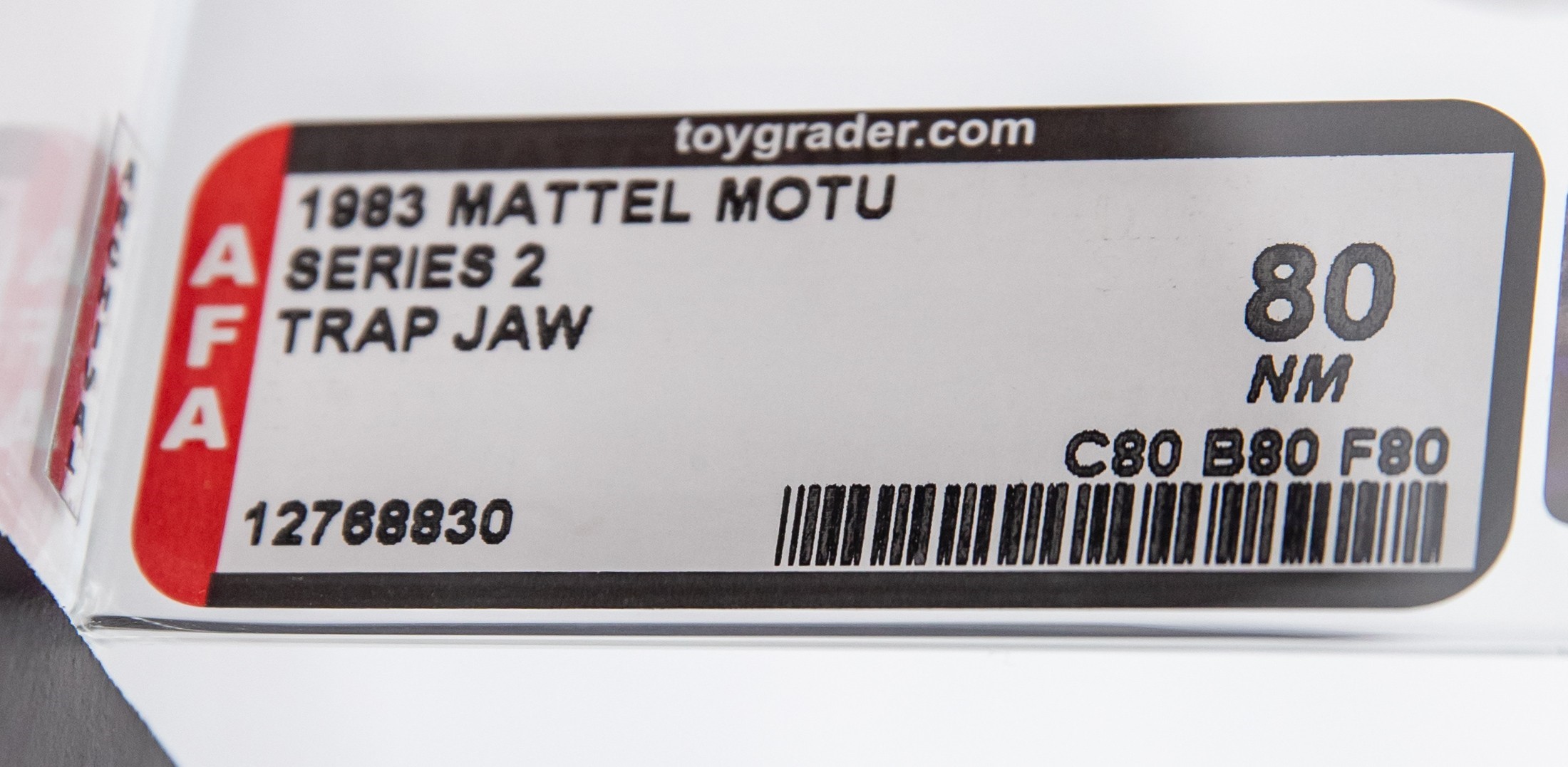 Exceptional example of popular Series Two villain: Trap Jaw.  Veteran collectors know just how difficult it is to find this one with a crystal clear bubble.  We expect lots of action on this lot as many will to look to upgrade.  An extremely rare opportunity to acquire a miraculous clear Trap Jaw MOC, which would be a tremendous addition to any upper-end MOTU collection.  G3, Made in Malaysia.  Graded April 2021.  Encapsulated by AFA (80, 80-80-80), #12768830