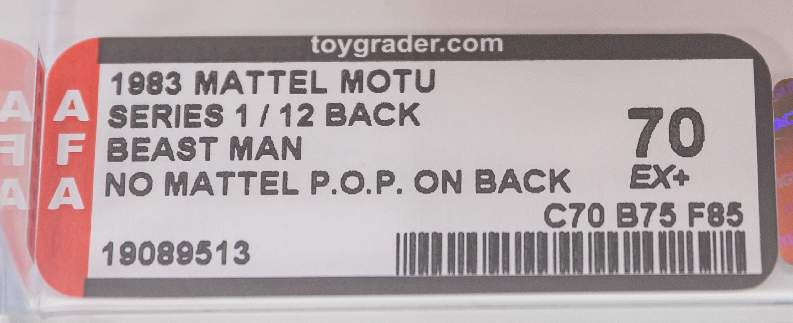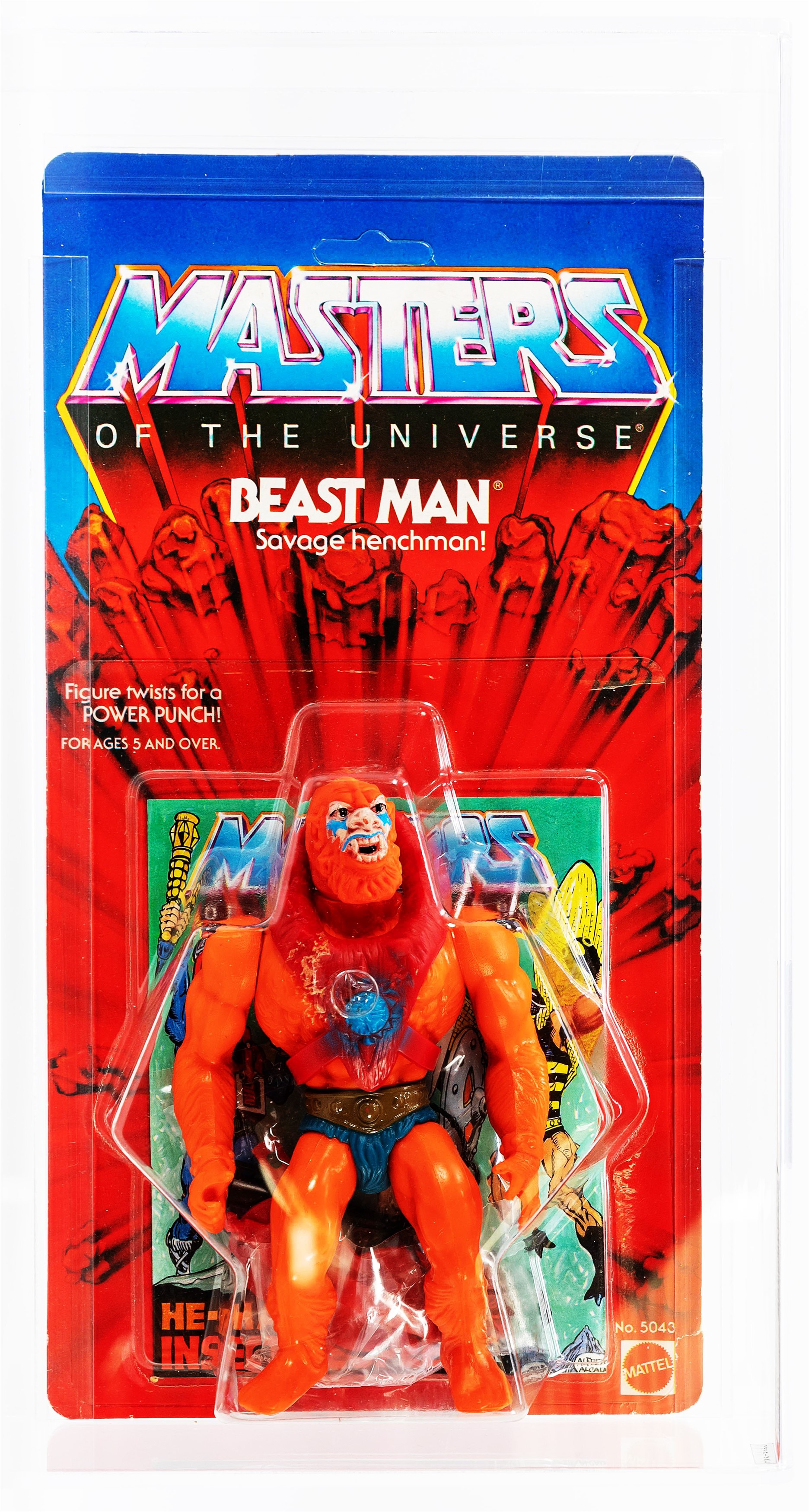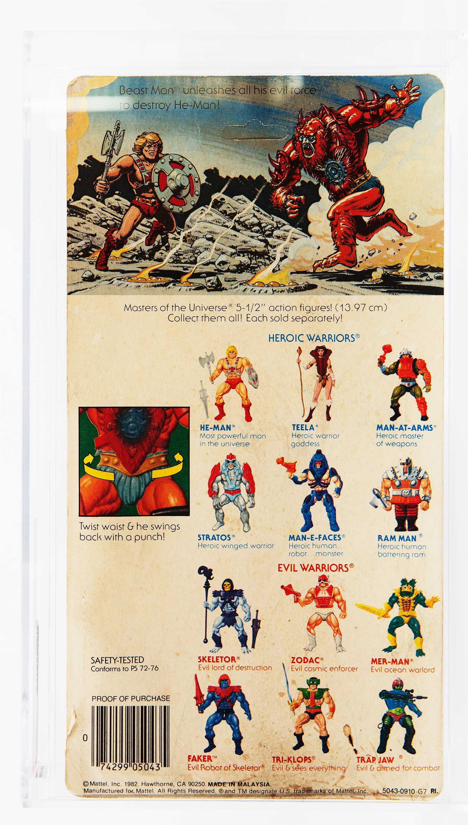 Highly desirable Series One villain: Beast Man. This unpunched 12-back figure with crystal clear bubble presents much better than its assigned grade. The 70 subgrade of the card is due to the reverse. The front of the card displays like an 80/85. A great opportunity to acquire a clear bubble example of one of the more popular pieces in the MOTU line. G7, Made in Malaysia. Encapsulated by AFA (70, 70-75-85), #19089513