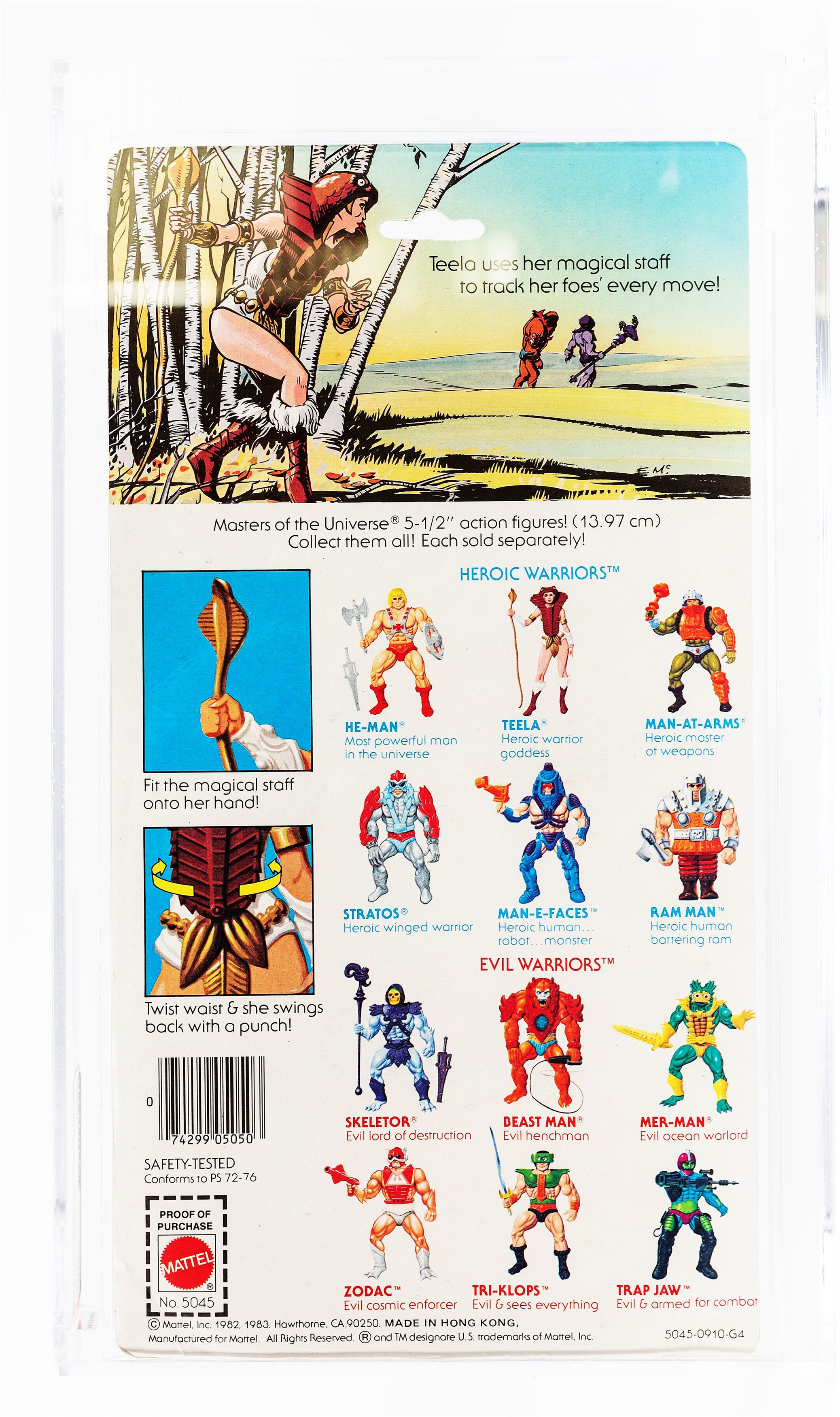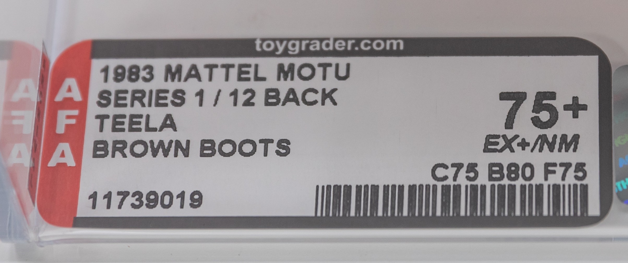Generally one of the more underrated carded figures in the MOTU line, Series One Teela is one that has quickly gained the respect of veteran collectors. Perhaps it’s the rumor that Teela, not Heman, will be the main character in Kevin Smith’s upcoming Netflix series. Here we present a stunner: an absolutely gorgeous figure with crystal clear bubble, you will be hard pressed to find a 12-back example superior to this one. Whether upgrading or adding, we believe this piece will be of special interest to investment-minded collectors. G4, Made in Hong Kong. Encapsulated by AFA (75+, 75-80-75), #11739019