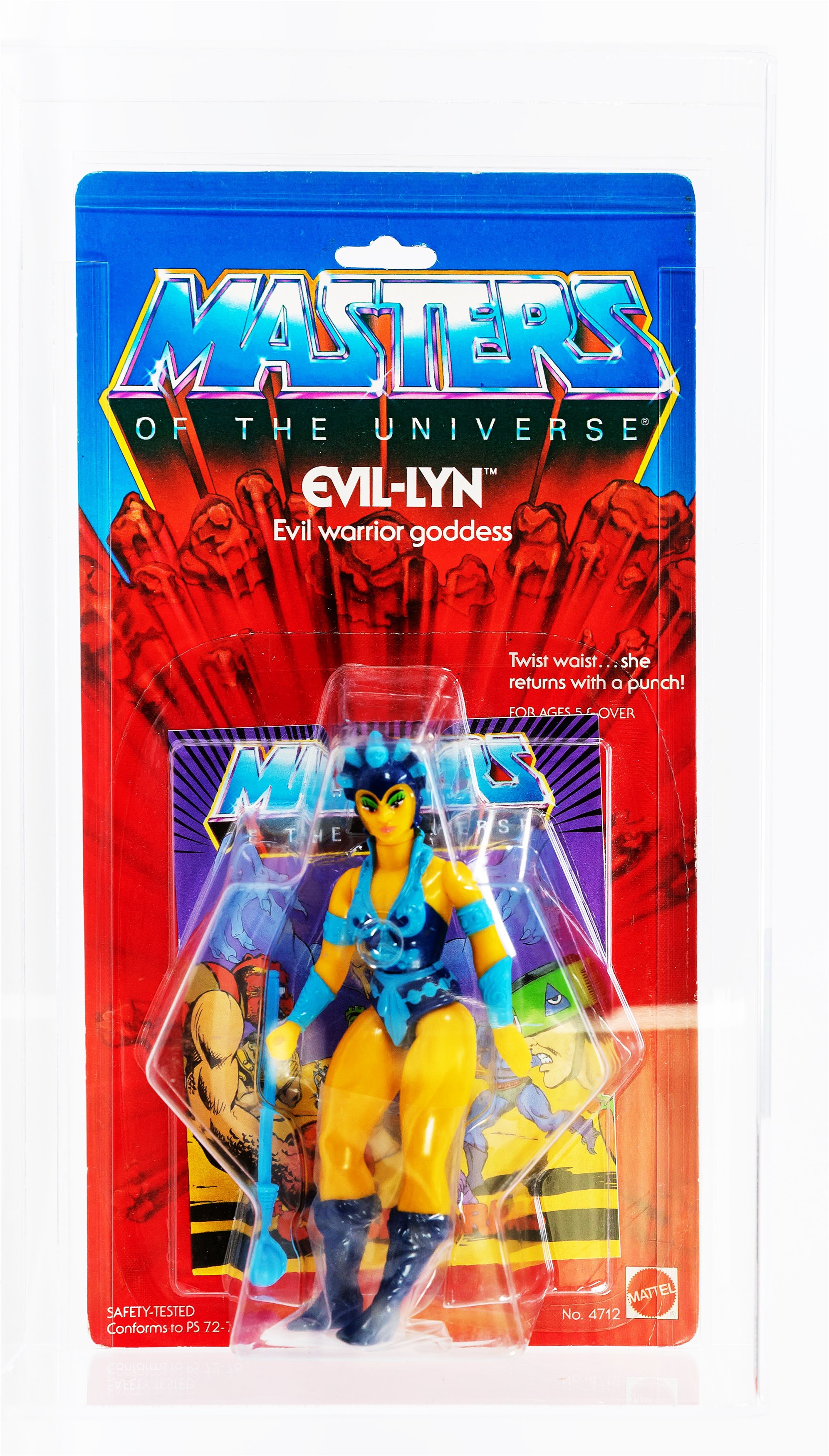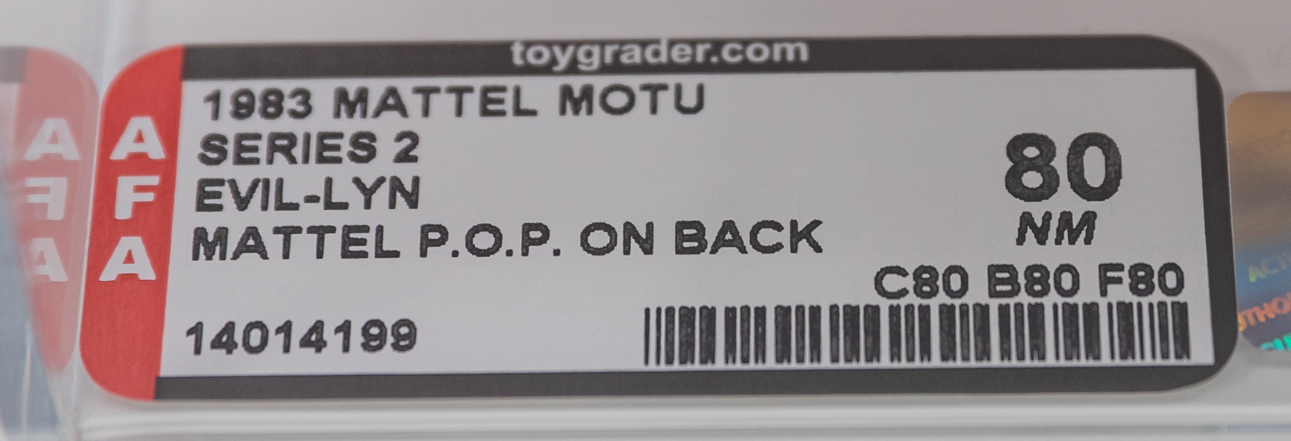 One of the more underrated carded figures in the MOTU line, Series Two Evil-Lyn is one that investment-minded collectors have their eye on. Presented is an absolutely gorgeous figure with crystal clear bubble, you will be hard pressed to find an example superior to this one. Whether upgrading or adding, we believe this clear bubble piece will be of special interest to collectors. G3, Made in Hong Kong. Encapsulated by AFA (80, 80-80-80), #14014199