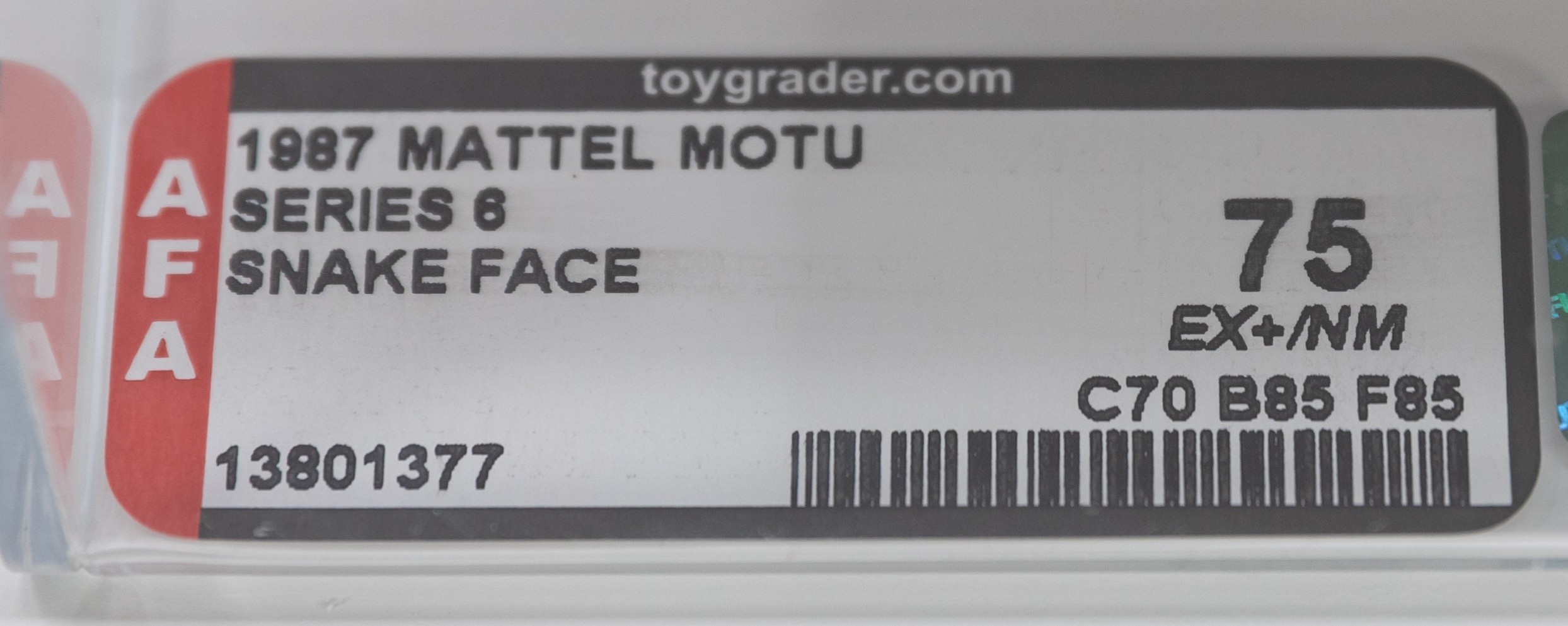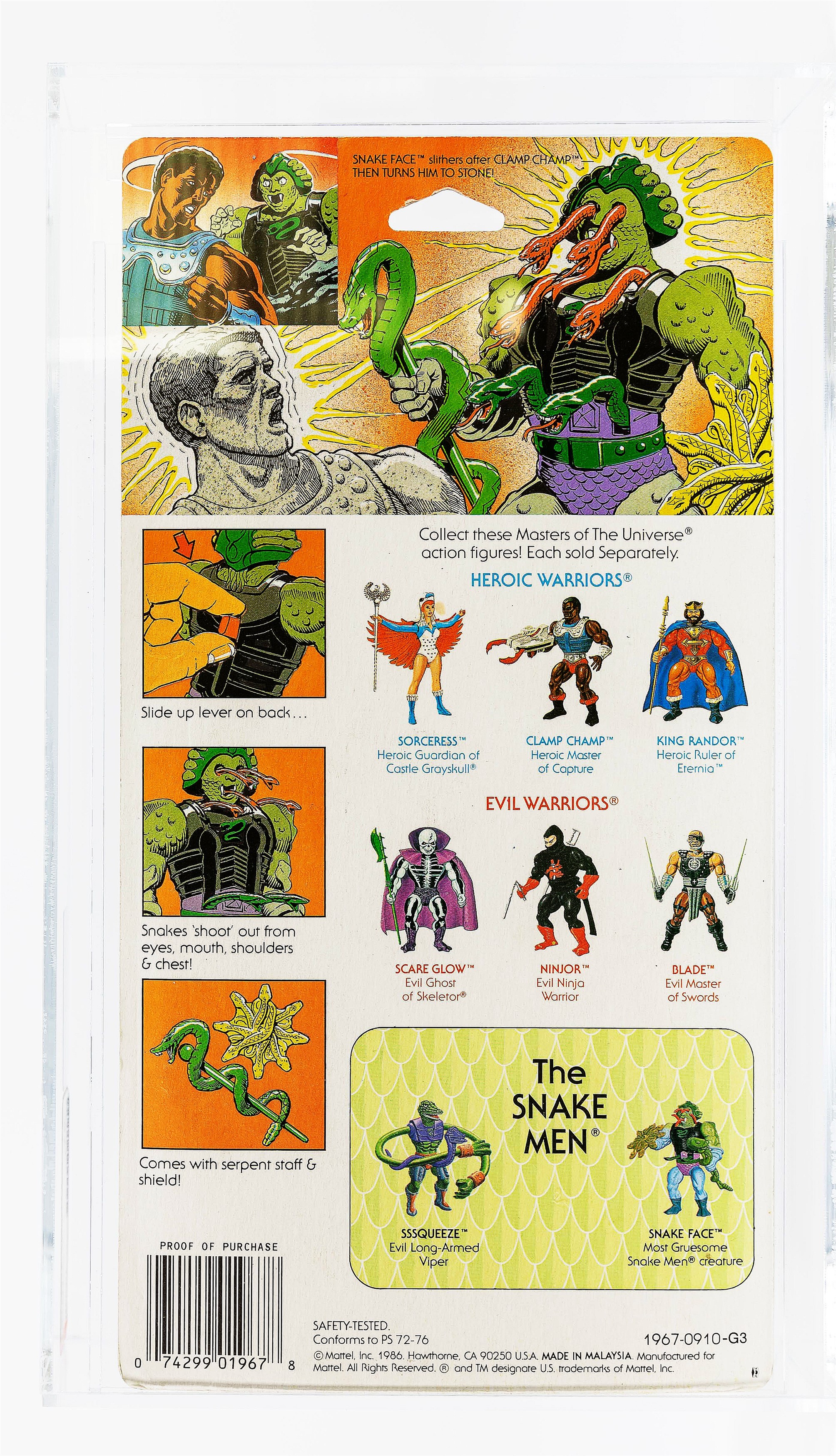 Difficult to find Series Six carded figure. The only thing keeping this Snake Face from an AFA 85 overall grade is the resulting tear from the removal of the price tag. Crystal clear and great presentation value, we foresee action from late-series MOTU collectors. G3, Made in Malaysia. Encapsulated by AFA (75, 70-85-85), #13801377
